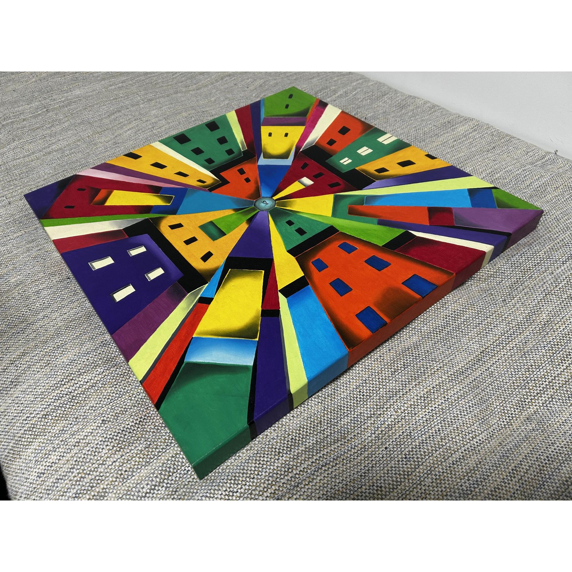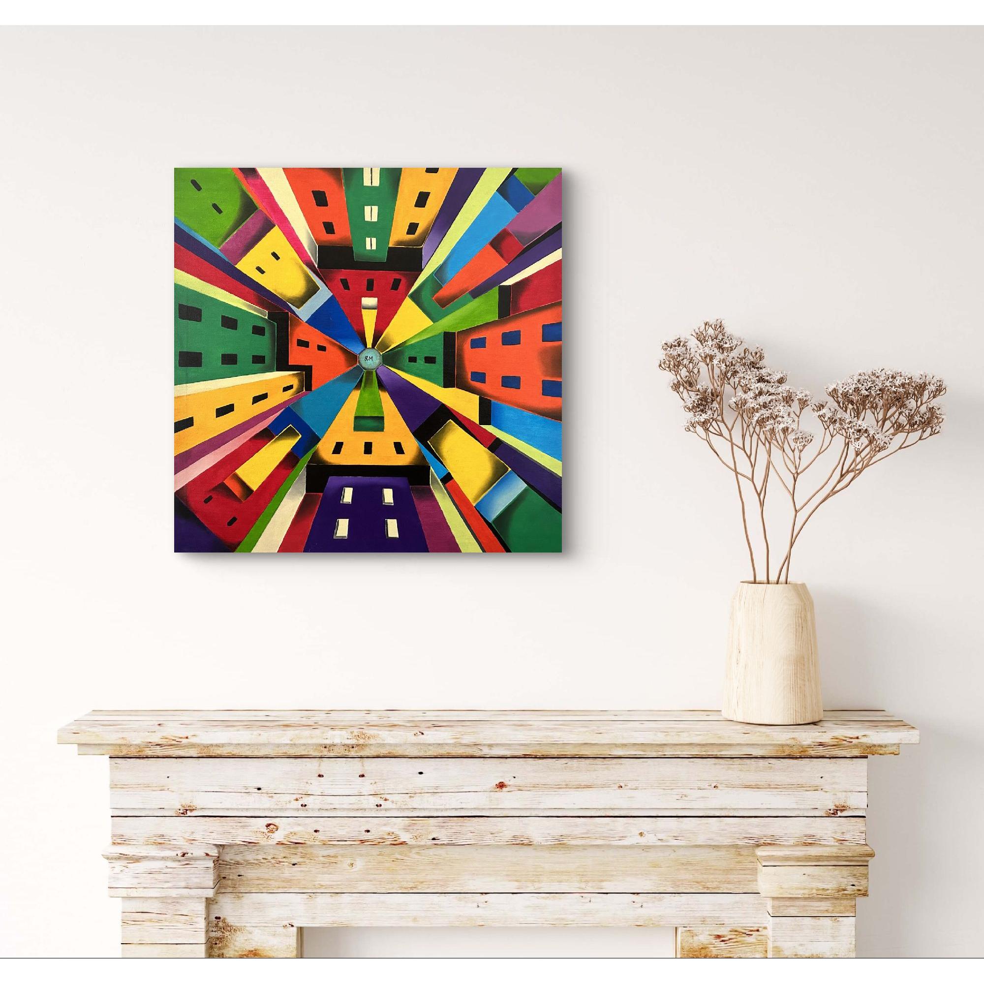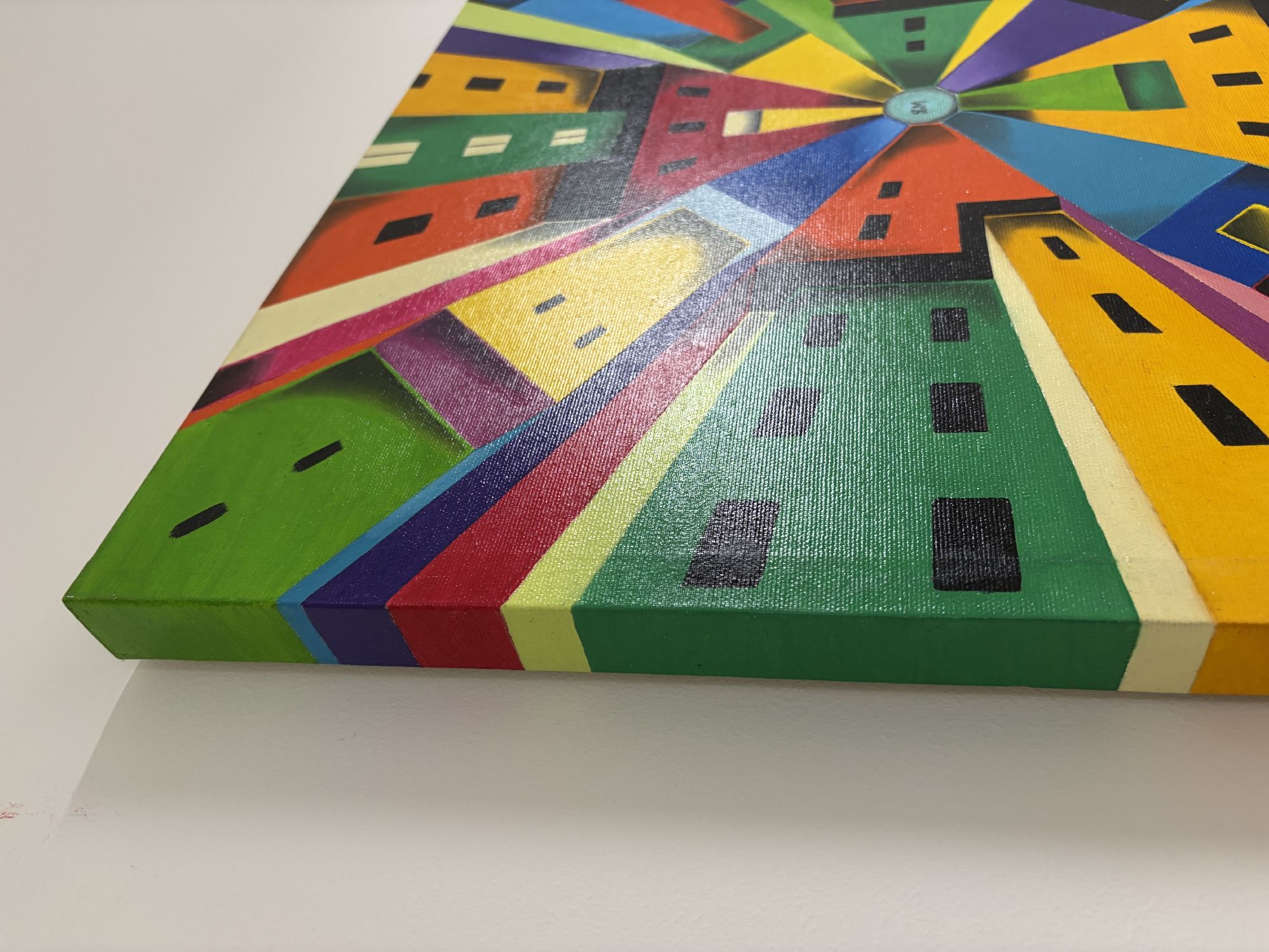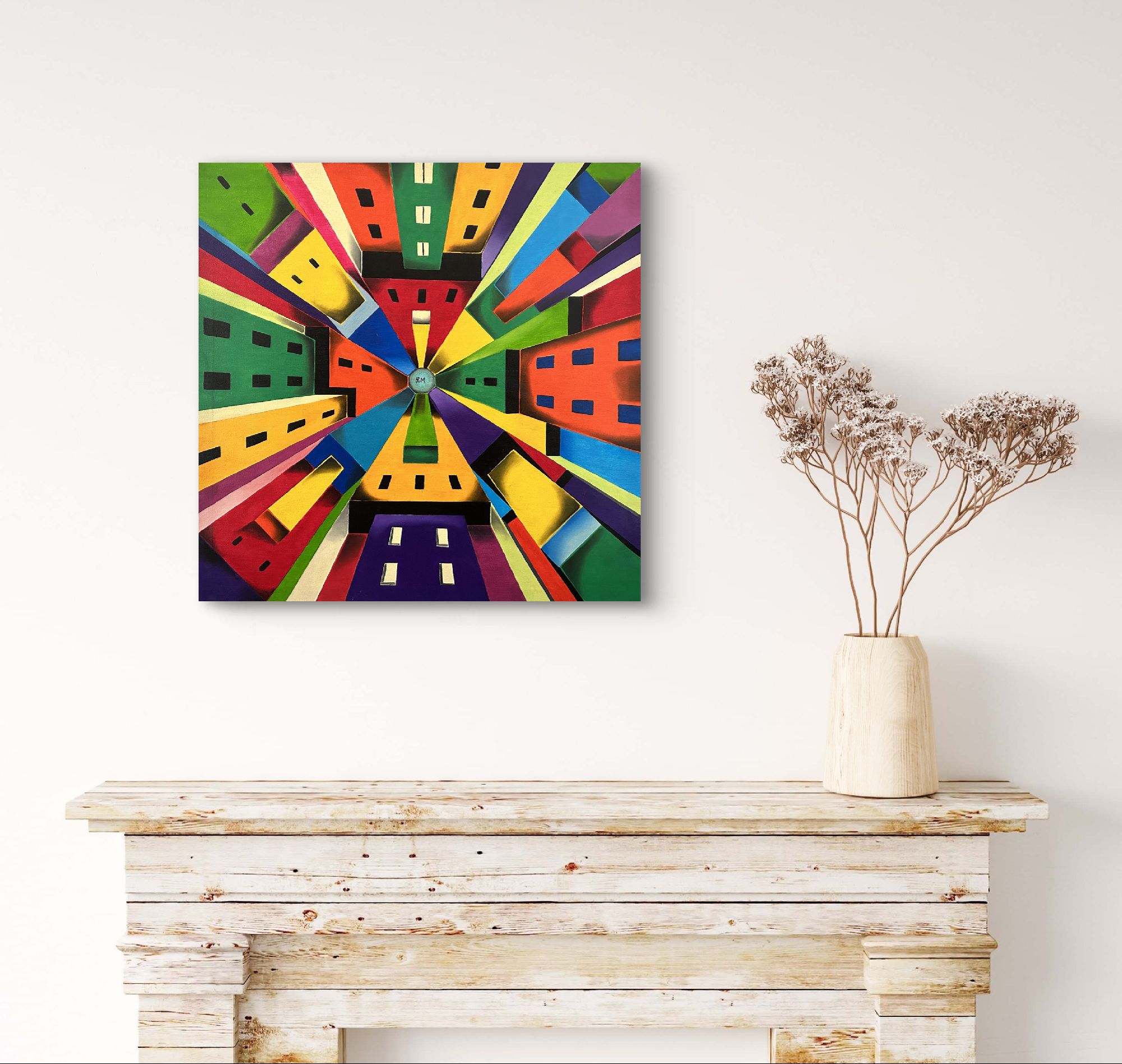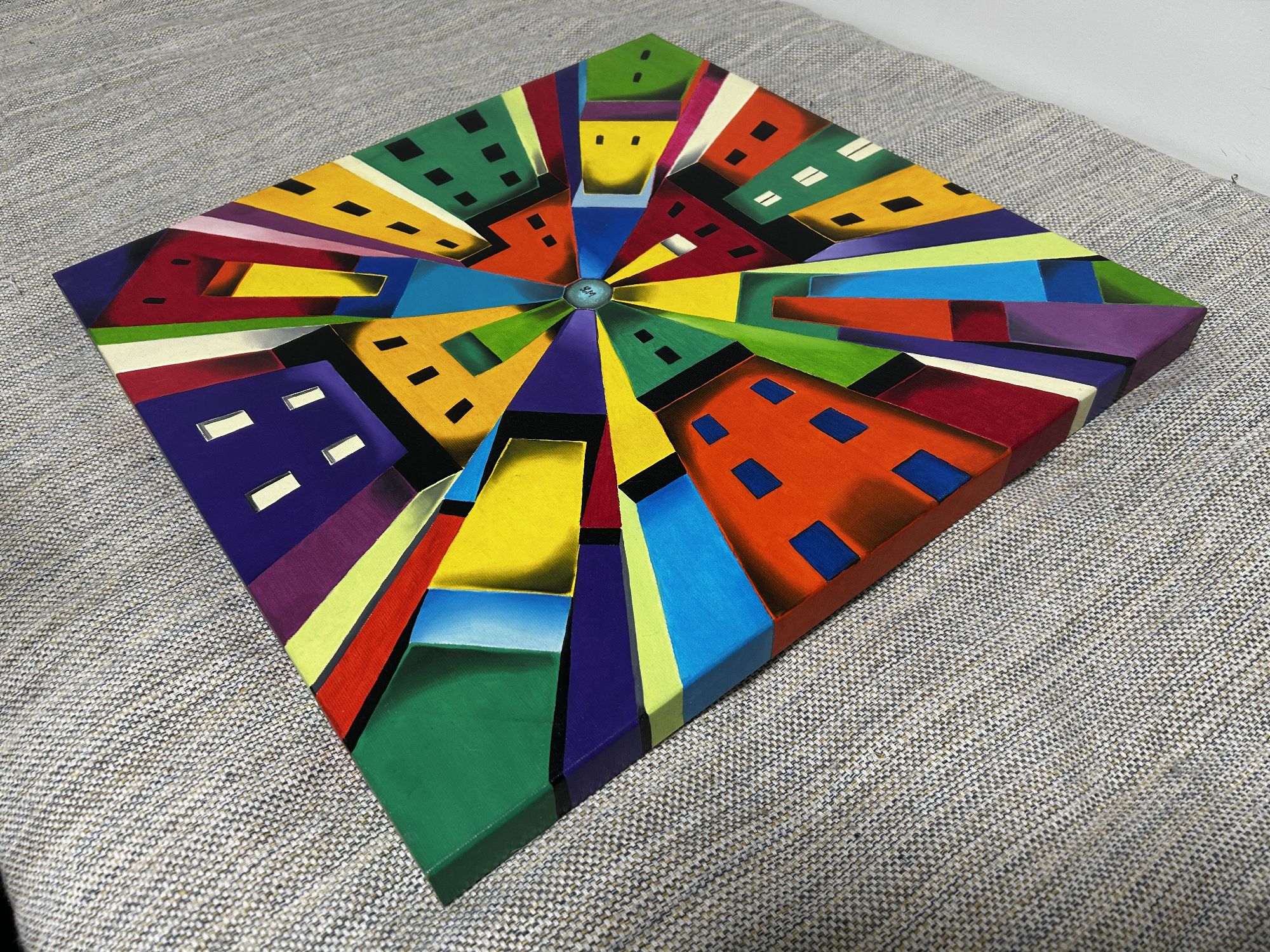 In questo dipinto ho voluto catturare l’essenza dinamica e vibrante di una città futura, giocando con forme geometriche e colori audaci. L’olio dona profondità e intensità, trasportando chi osserva in un vortice di energia e prospettive inedite. Questa opera è un invito a immaginare lo spazio urbano come un’esplosione di vita e innovazione, perfetta per animare qualsiasi ambiente con una carica positiva e visionaria.