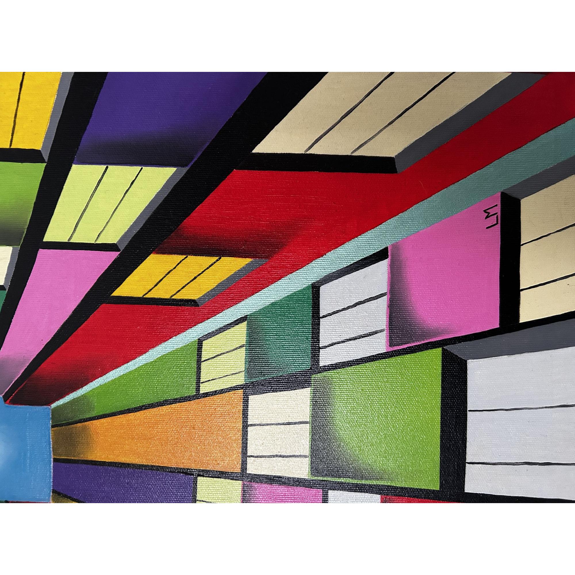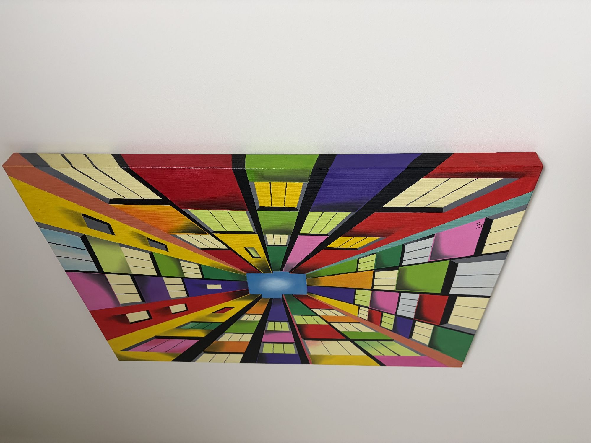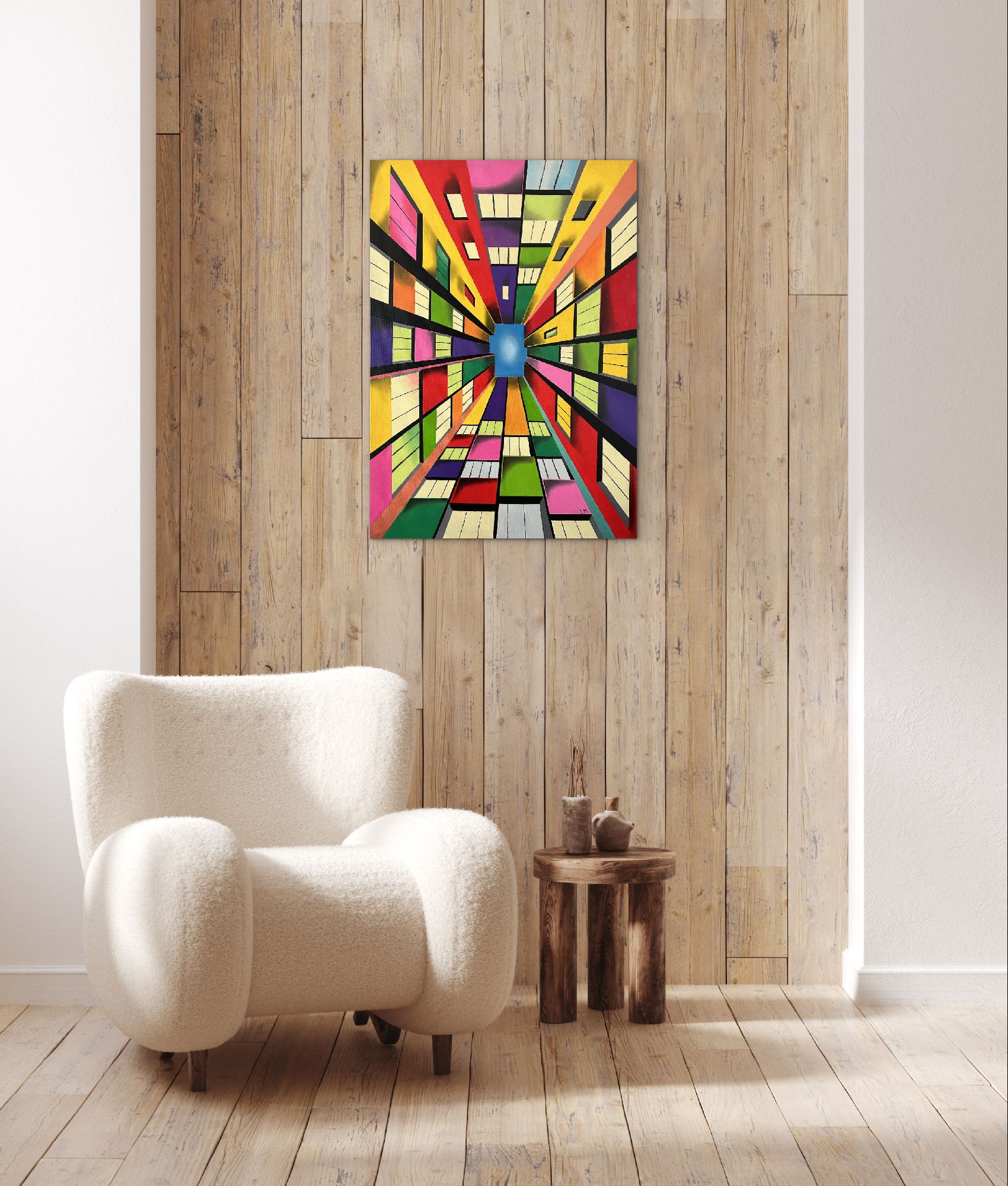 Un'opera pittorica astratta raffigura una composizione architettonica prospettica, realizzata con colori vivaci che convergono verso un cielo azzurro centrale.La scena mostra una visione dall'alto di una struttura urbana immaginaria, con linee convergenti che suggeriscono un'elevata prospettiva.La composizione è strutturata con blocchi rettangolari colorati che sembrano rappresentare facciate di edifici o pareti, disposti simmetricamente ai lati, e in prospettiva.Il punto di fuga è verso l'alto, dove si apre un'area blu che rappresenta il cielo.L'interazione tra elementi è dinamica, con le linee che guidano lo sguardo dello spettatore verso il centro, creando una sensazione di profondità e movimento