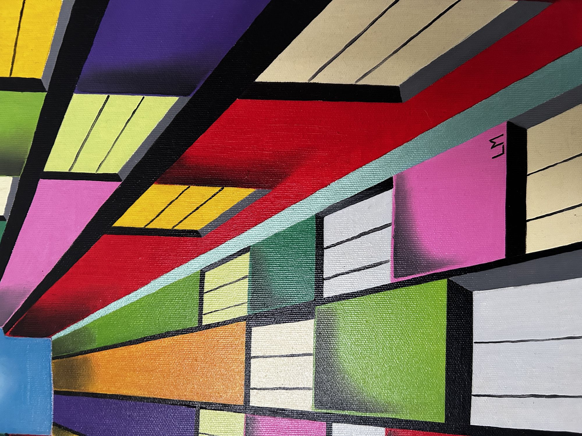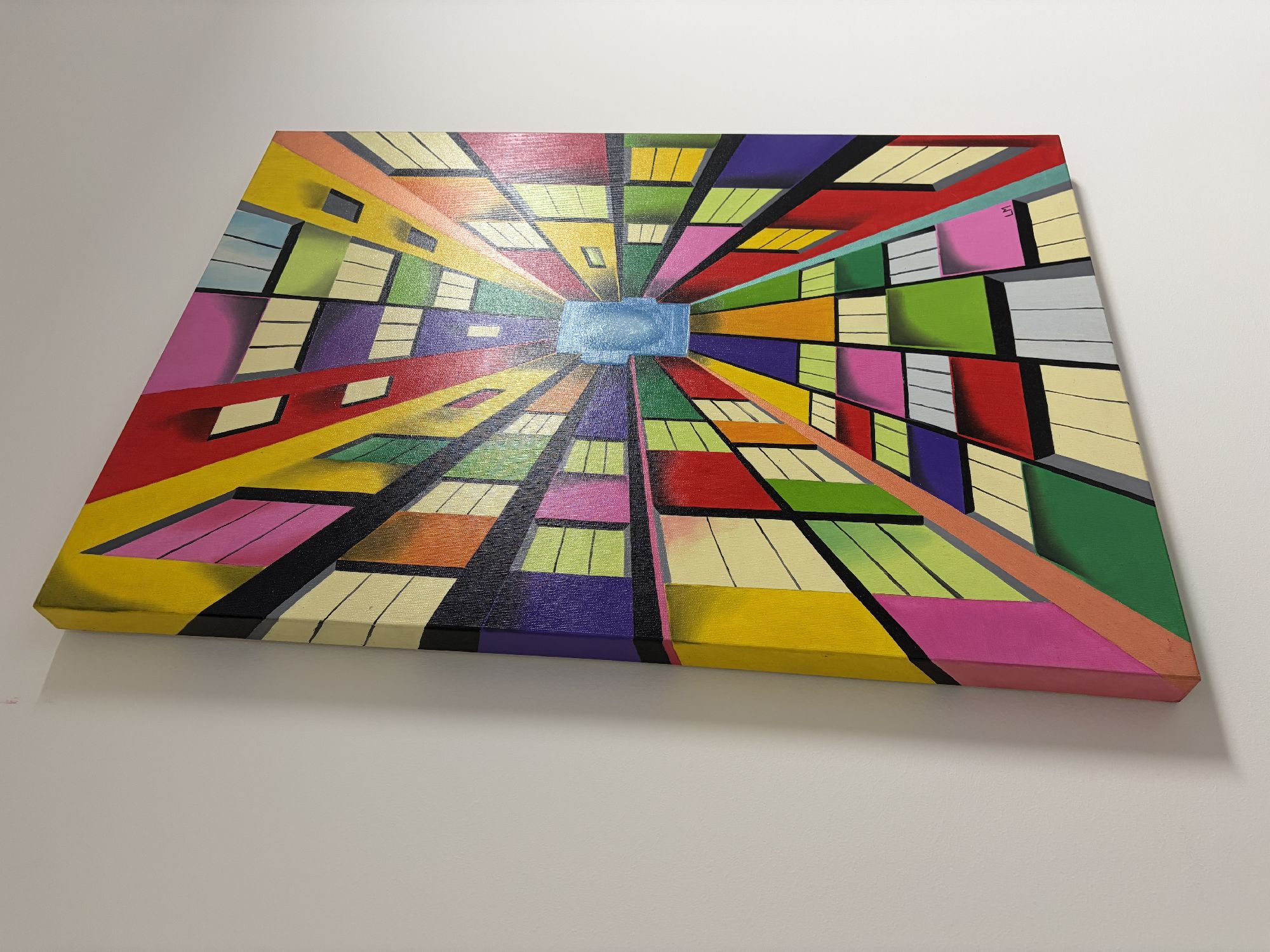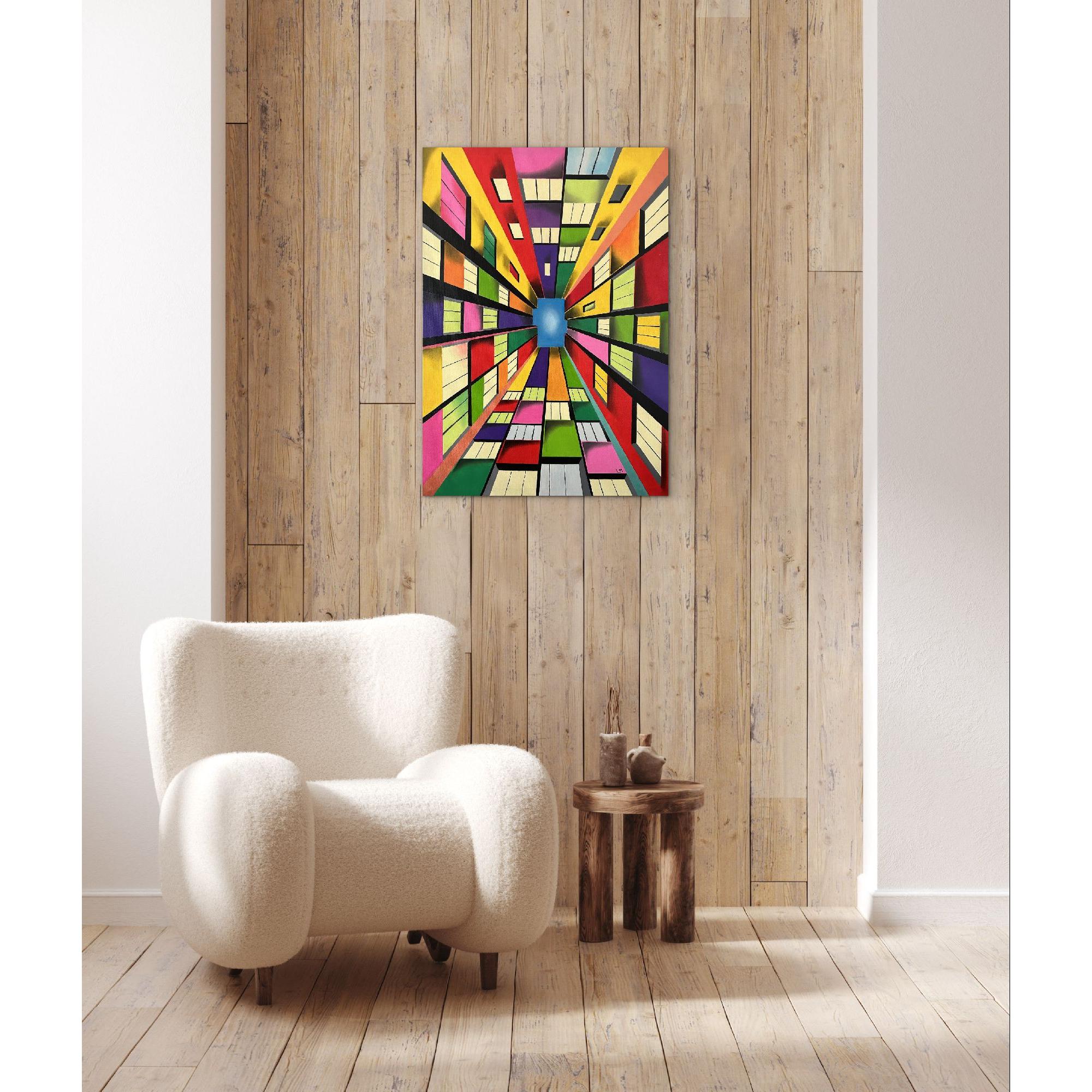 Un'opera pittorica astratta raffigura una composizione architettonica prospettica, realizzata con colori vivaci che convergono verso un cielo azzurro centrale.La scena mostra una visione dall'alto di una struttura urbana immaginaria, con linee convergenti che suggeriscono un'elevata prospettiva.La composizione è strutturata con blocchi rettangolari colorati che sembrano rappresentare facciate di edifici o pareti, disposti simmetricamente ai lati, e in prospettiva.Il punto di fuga è verso l'alto, dove si apre un'area blu che rappresenta il cielo.L'interazione tra elementi è dinamica, con le linee che guidano lo sguardo dello spettatore verso il centro, creando una sensazione di profondità e movimento