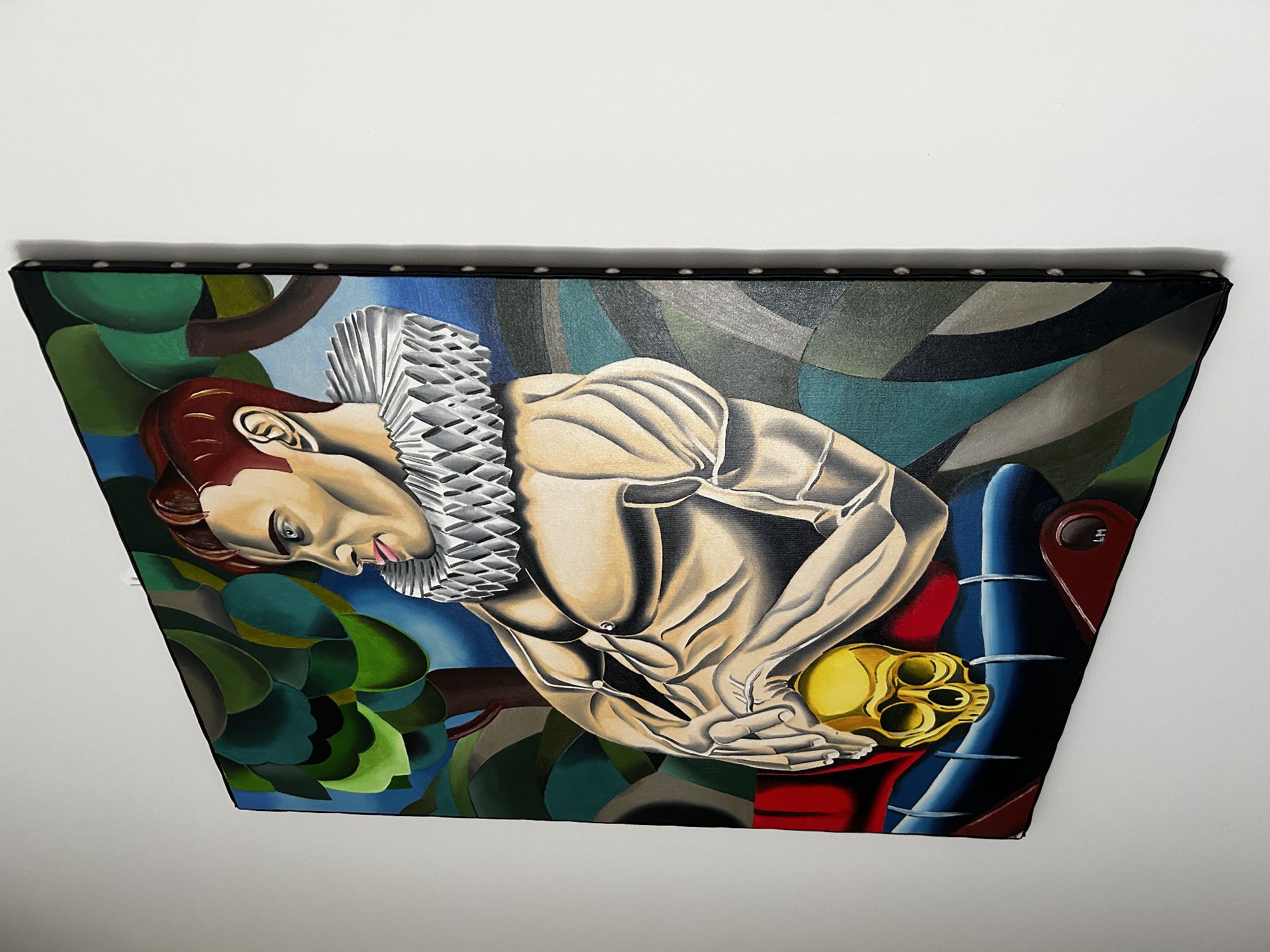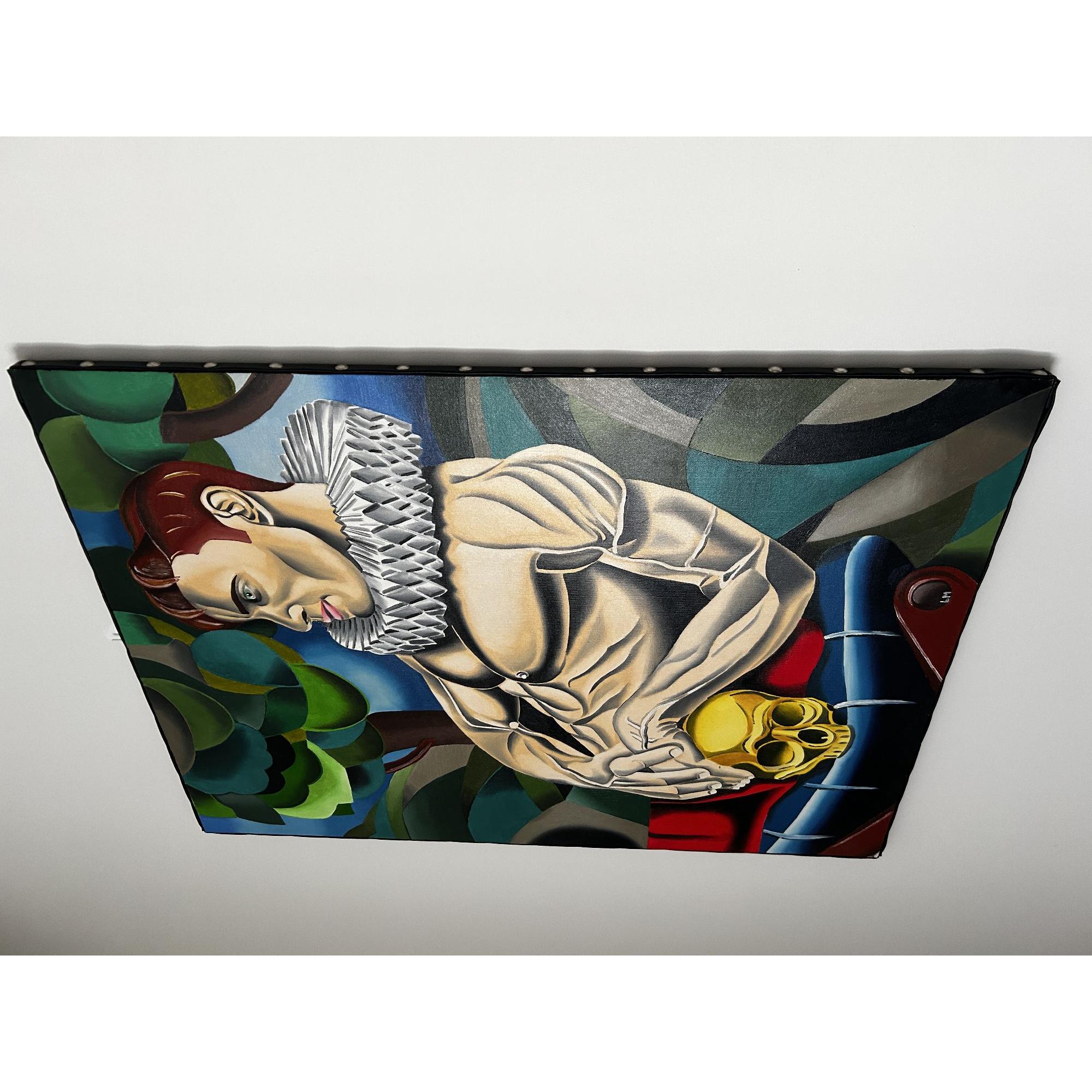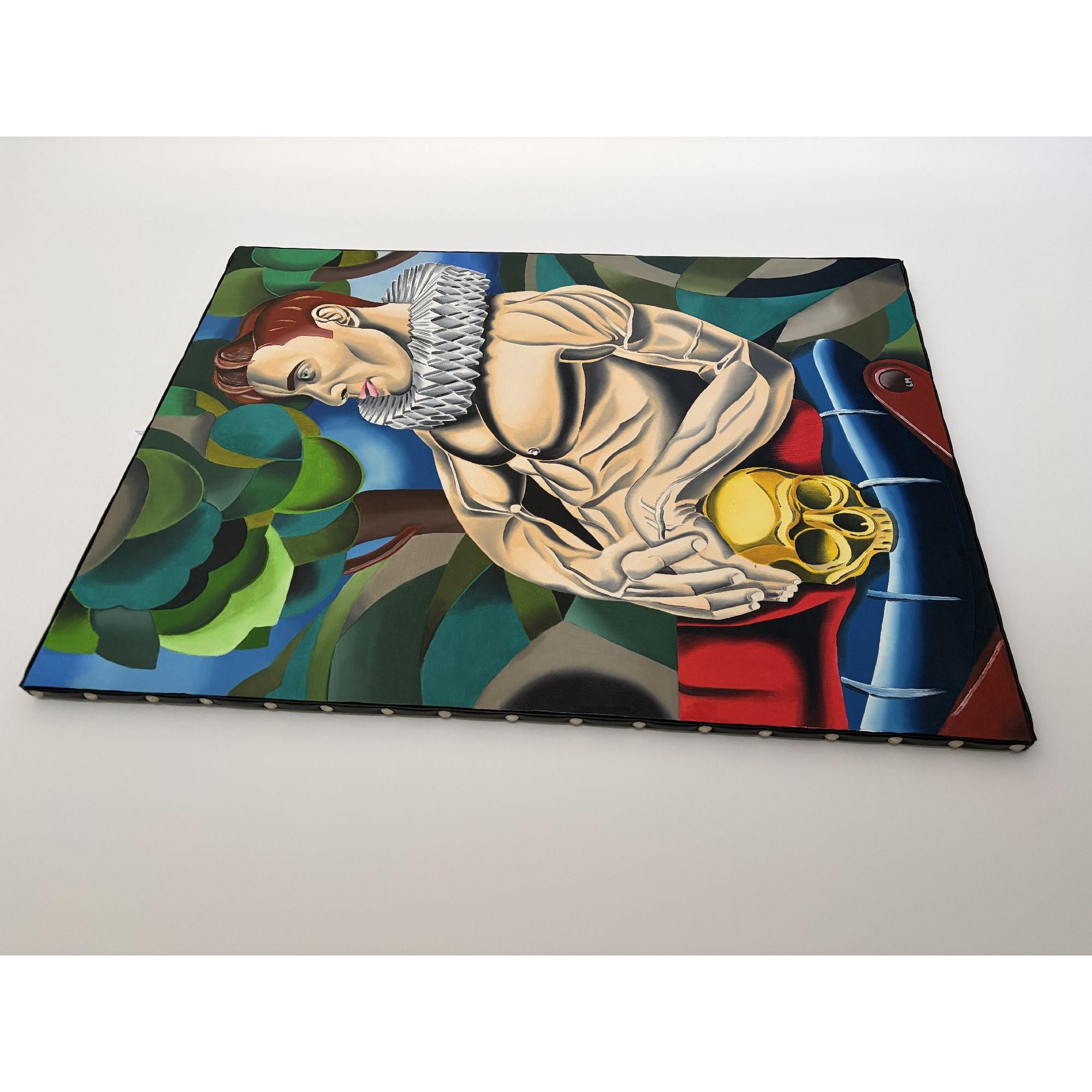 L'opera è una pittura di un uomo muscoloso con un colletto pieghettato, che tiene in grembo un teschio dorato, con un'atmosfera drammatica.La composizione è strutturata in modo tale da presentare l'uomo come figura dominante, posizionata in diagonale, con il busto rivolto verso lo spettatore, e il volto di profilo.L'uomo è seduto su uno sgabello con un teschio dorato appoggiato sulle sue gambe.Lo sfondo è composto da elementi geometrici e forme astratte che suggeriscono un ambiente naturale, come alberi e colline, creando un'atmosfera quasi teatrale e malinconica.La cornice è stretta e enfatizza l'impatto emotivo dell'immagine.