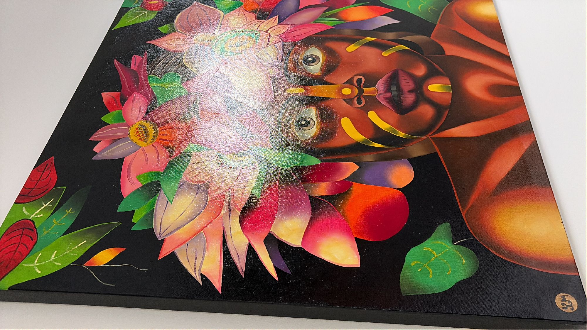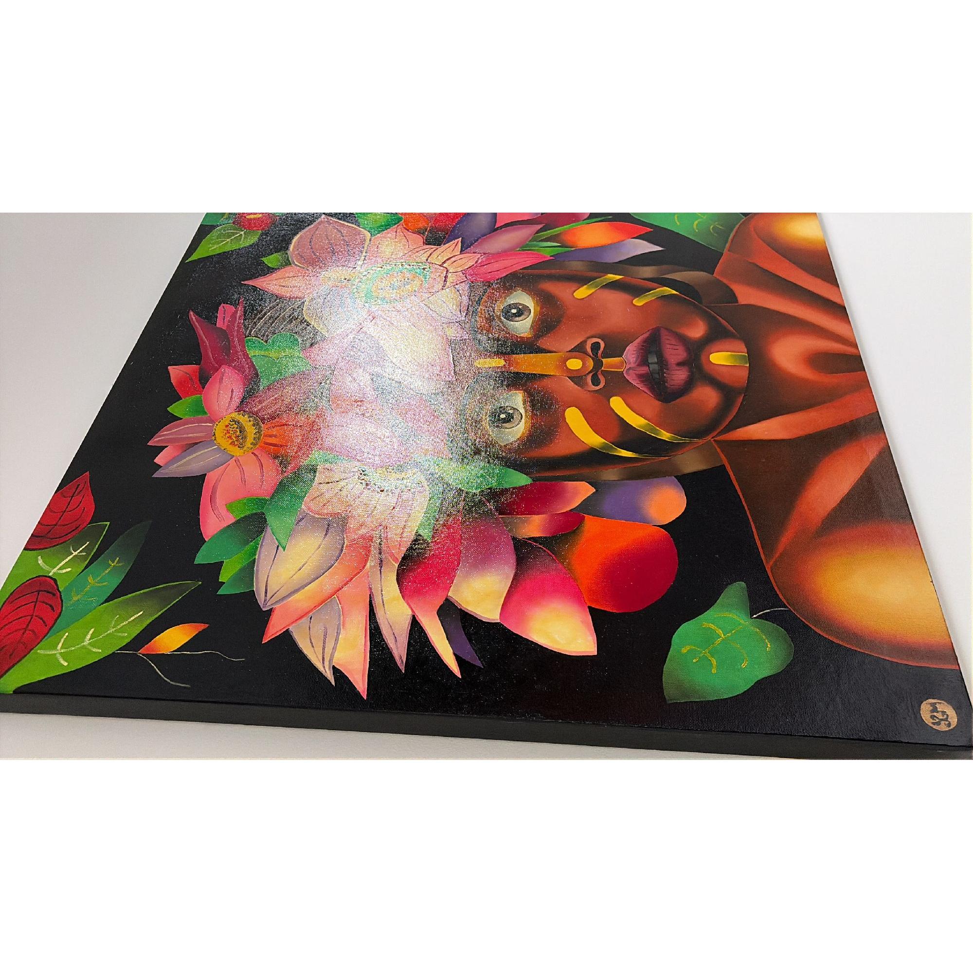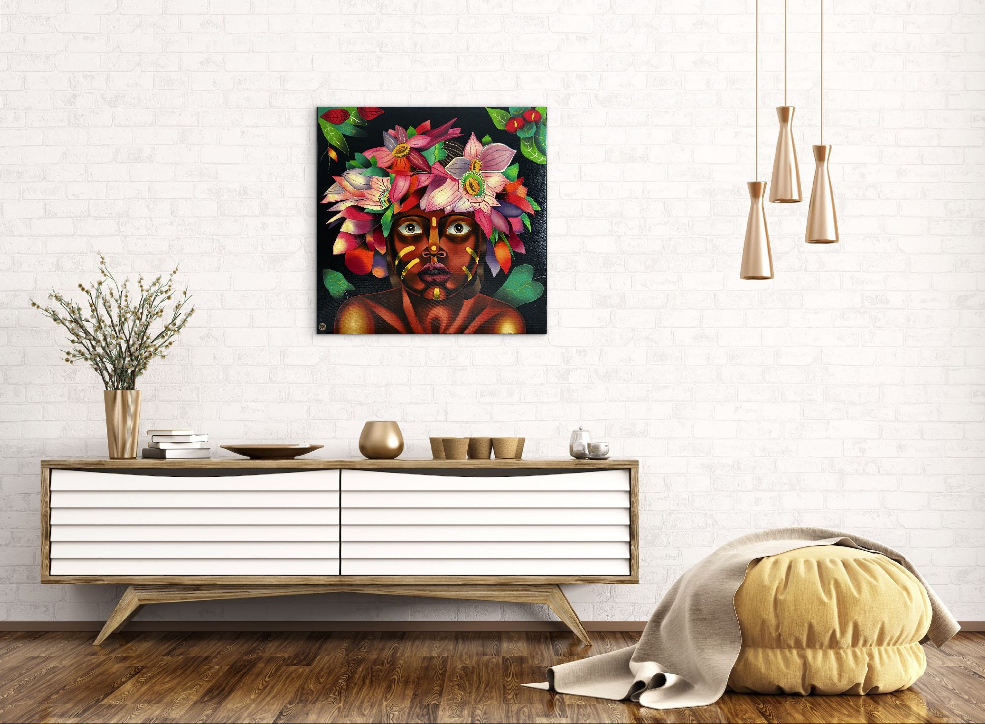 L'opera mostra un ritratto artistico di una persona con una carnagione rossa scura e segni gialli sul volto, evocando un'atmosfera tribale o cerimoniale.I tratti del viso sono realistici, con occhi grandi e labbra pronunciate.La testa è decorata con una corona di fiori raffinati e dettagliati che spaziano dal rosa al rosso, con sfumature di verde nelle foglie adiacenti.Dietro la figura, il fondo è di colore nero, pieno di foglie verdi e rosse, creando un effetto di profondità che valorizza la presenza centrale del volto
