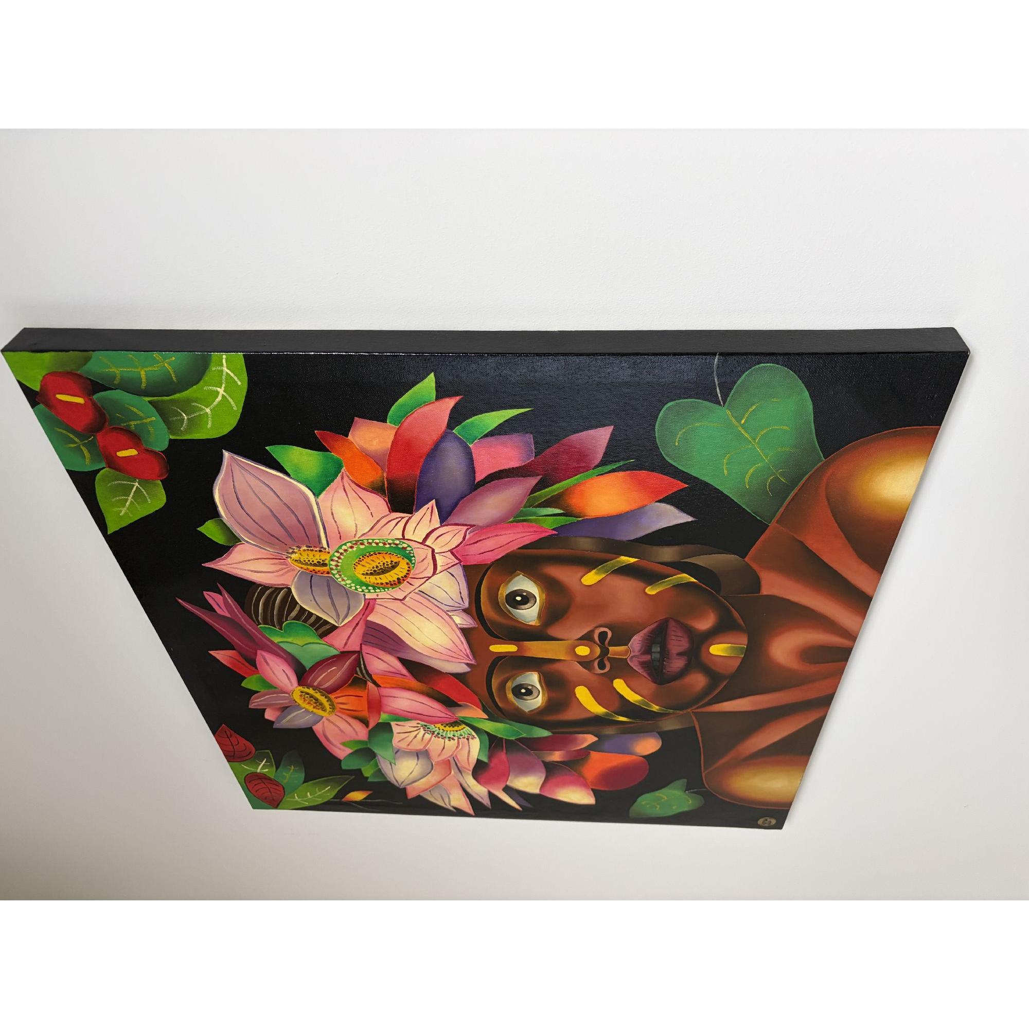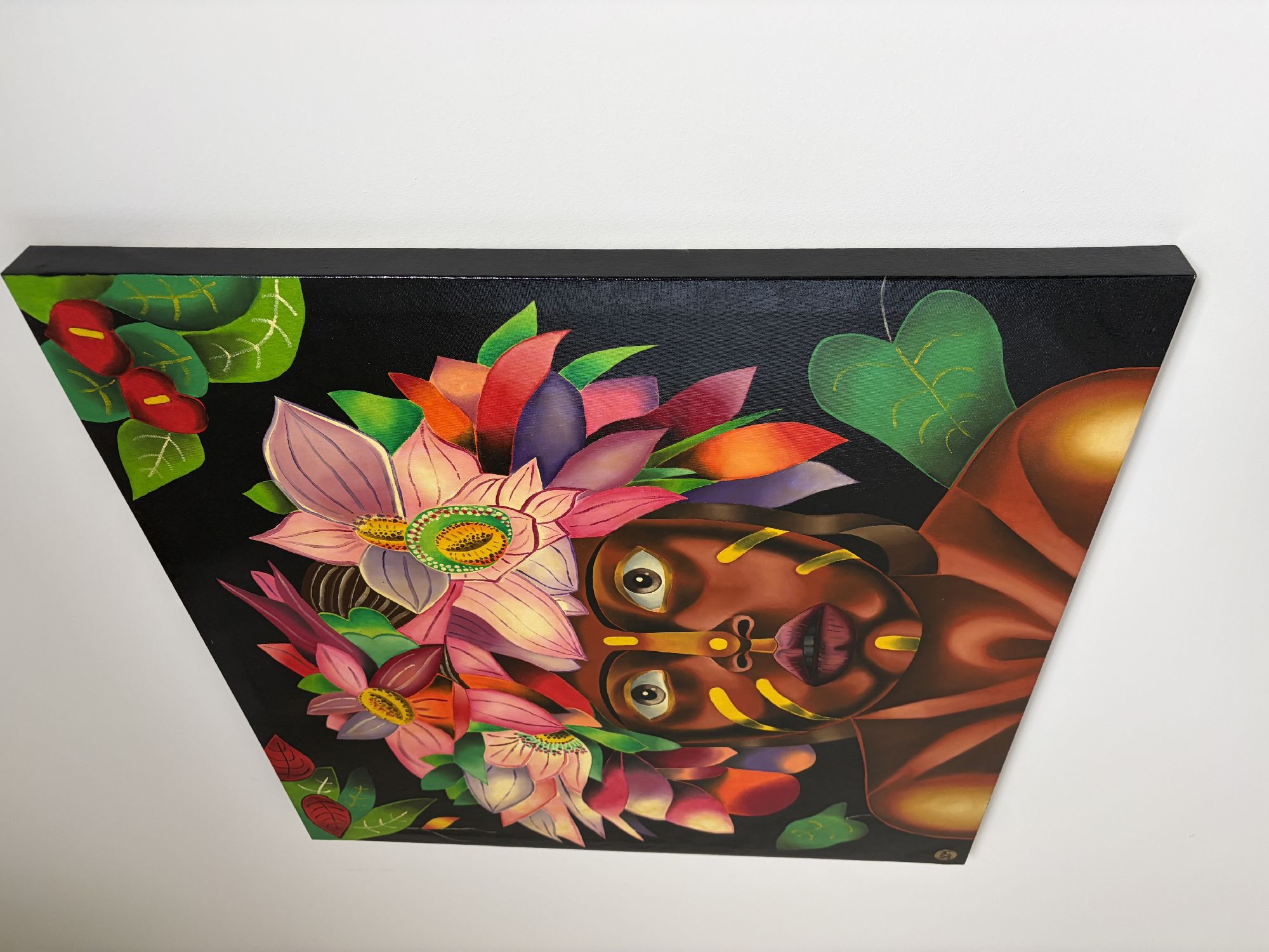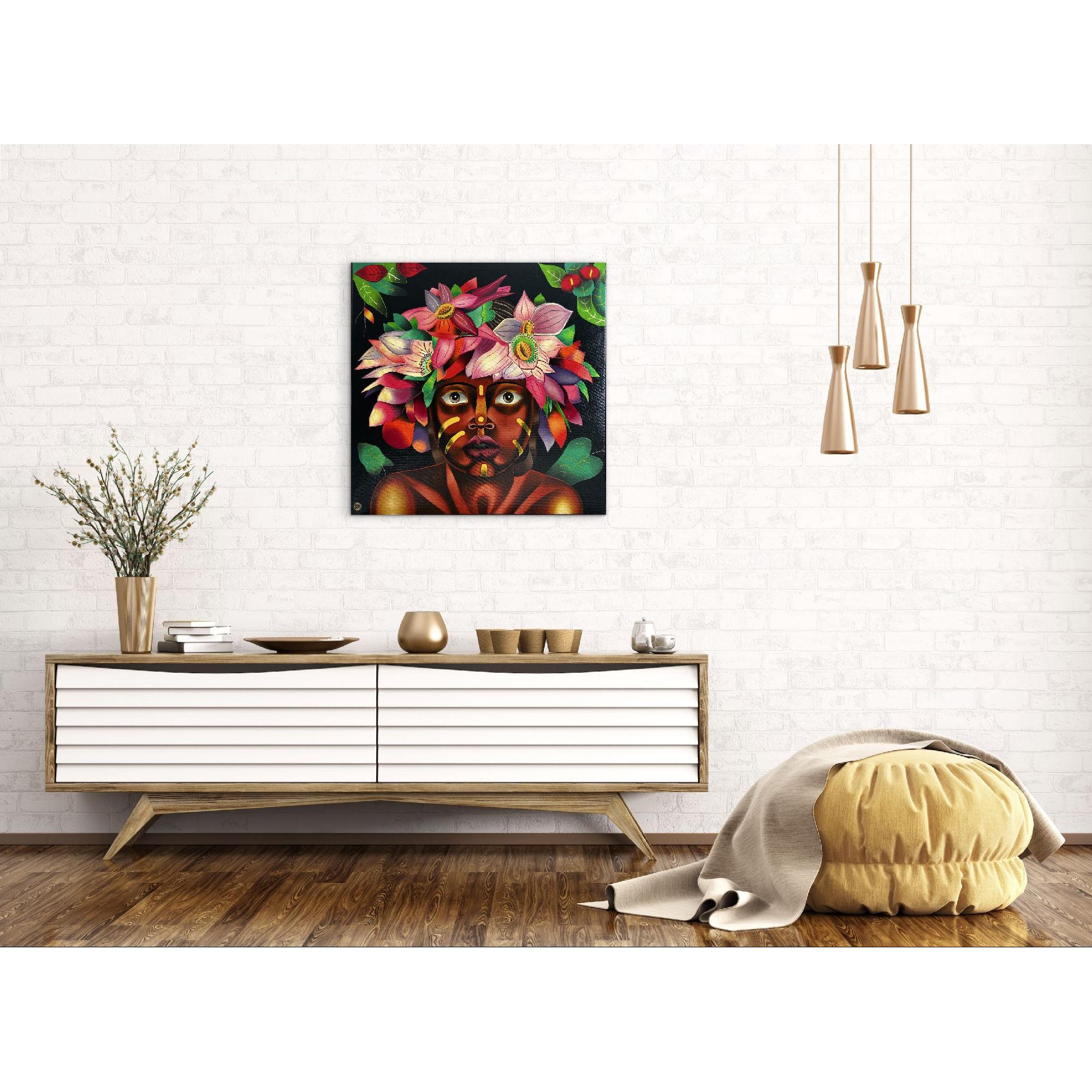 L'opera mostra un ritratto artistico di una persona con una carnagione rossa scura e segni gialli sul volto, evocando un'atmosfera tribale o cerimoniale.I tratti del viso sono realistici, con occhi grandi e labbra pronunciate.La testa è decorata con una corona di fiori raffinati e dettagliati che spaziano dal rosa al rosso, con sfumature di verde nelle foglie adiacenti.Dietro la figura, il fondo è di colore nero, pieno di foglie verdi e rosse, creando un effetto di profondità che valorizza la presenza centrale del volto