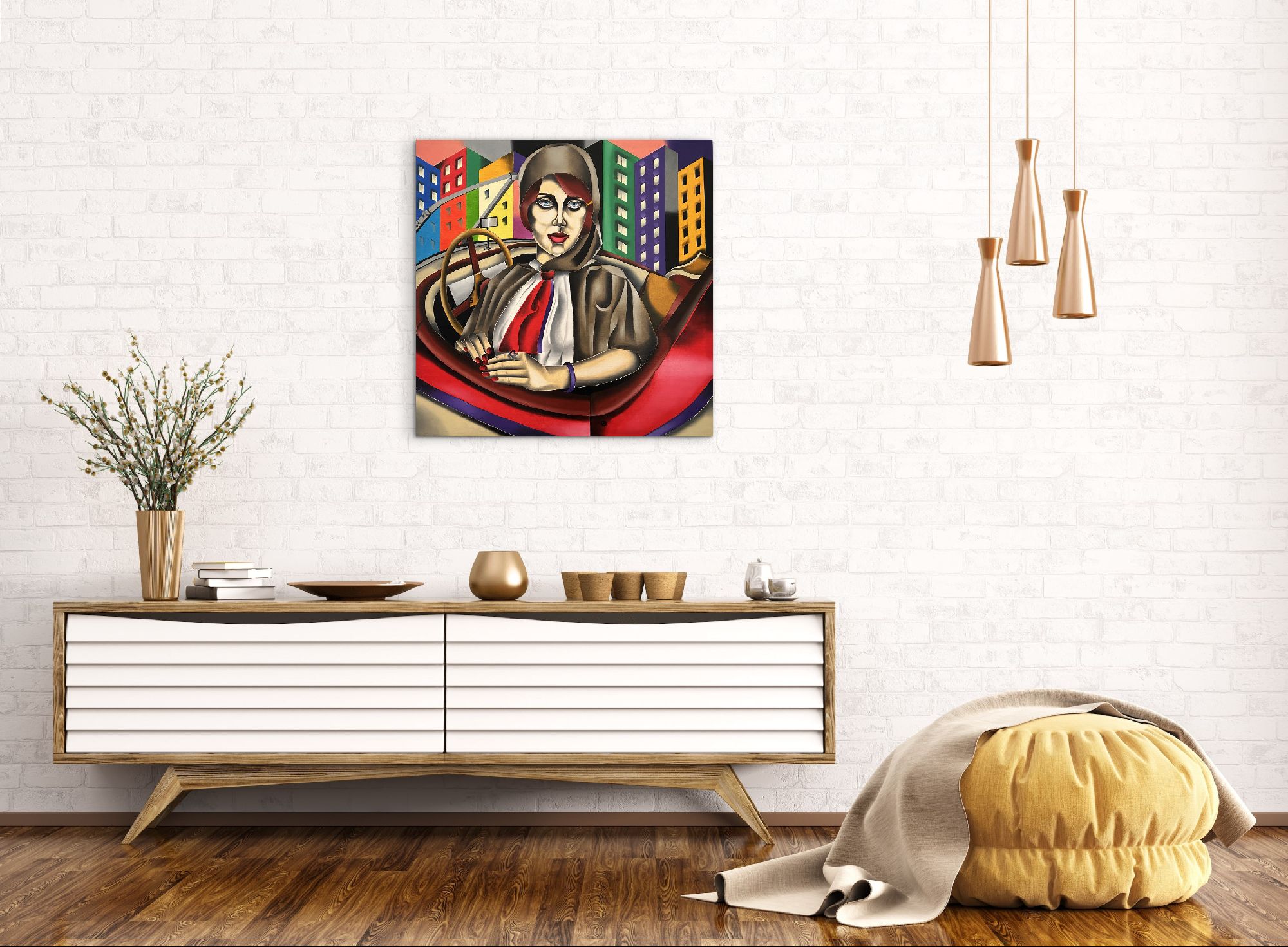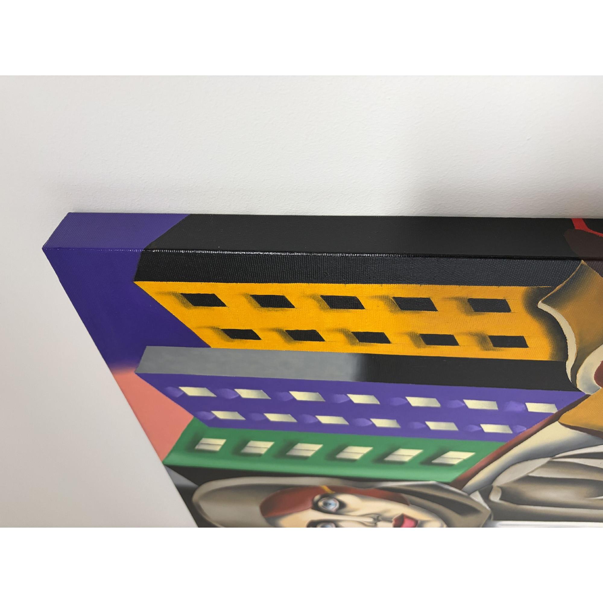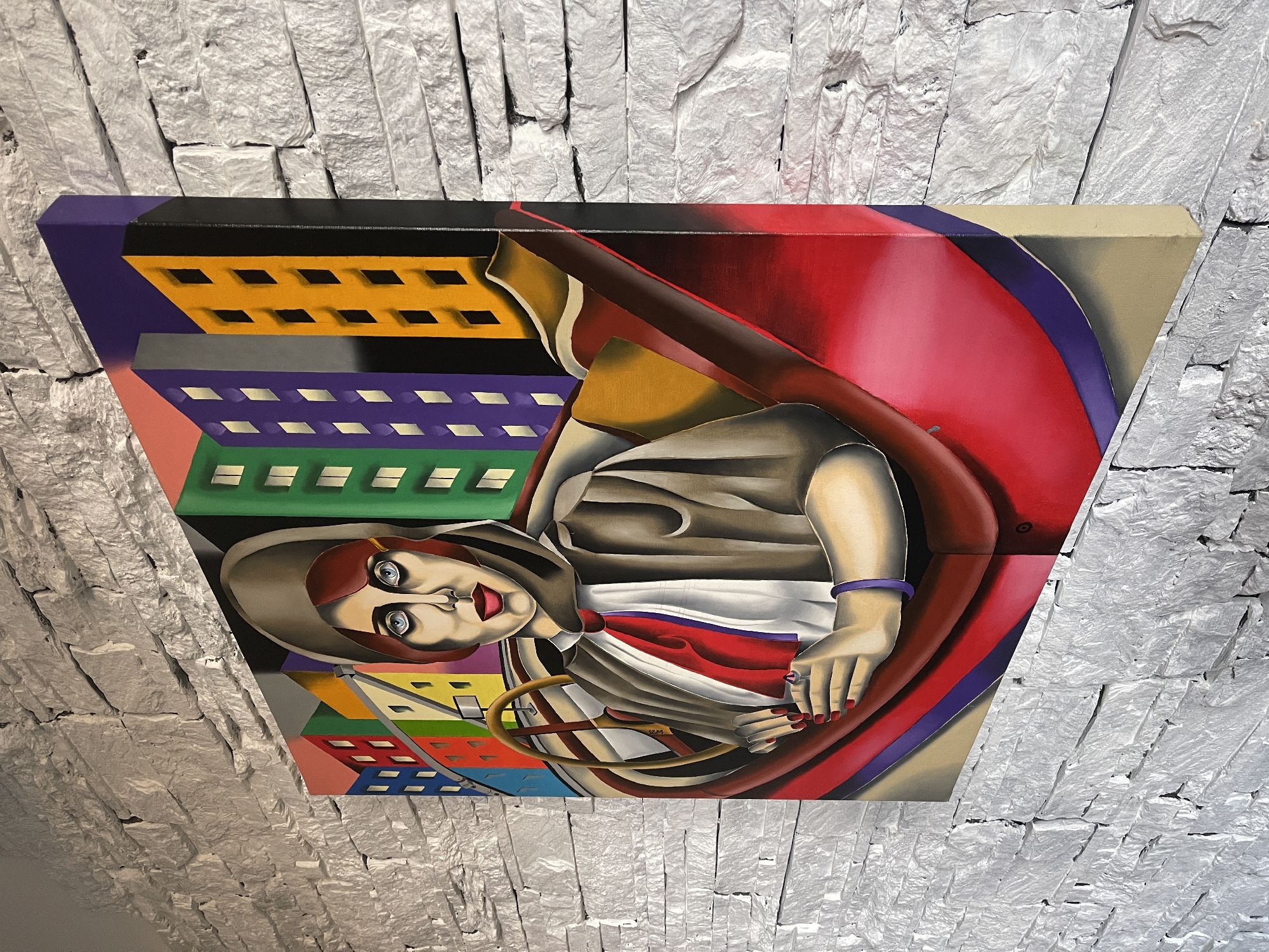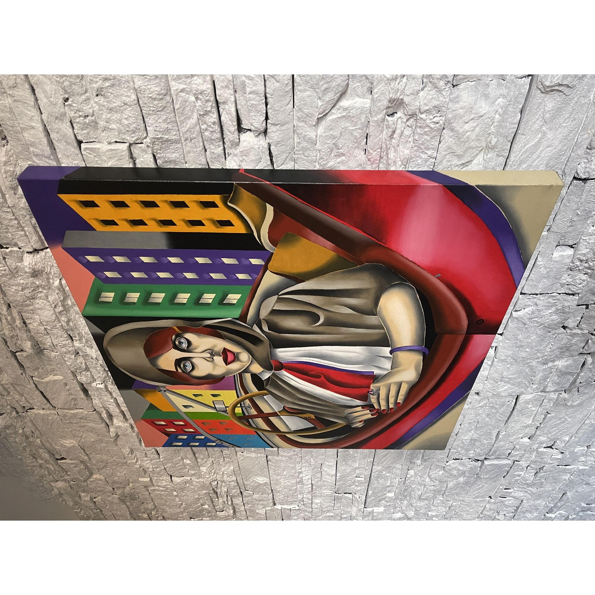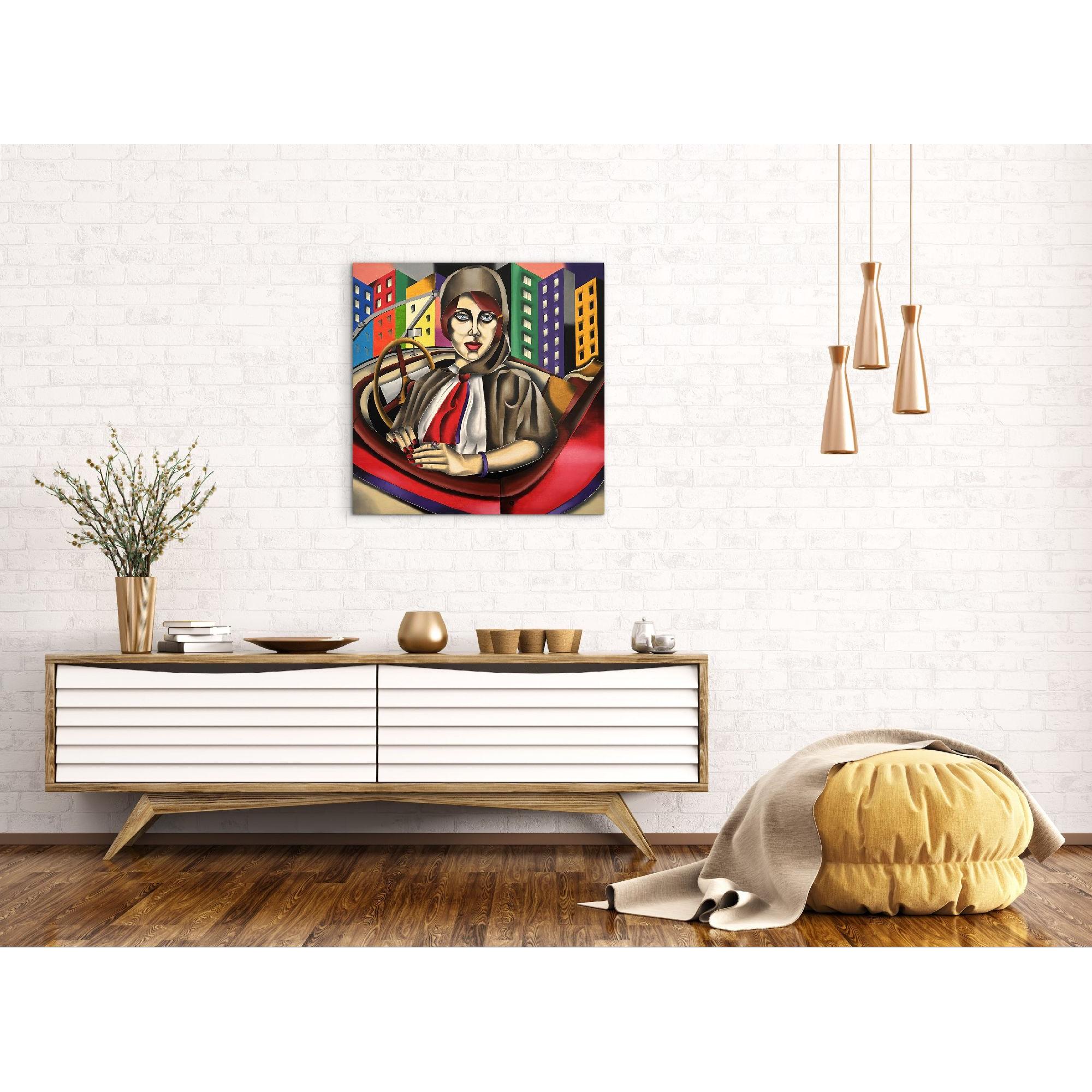 L'immagine presenta un ritratto stilizzato di una donna seduta in un'auto d'epoca, con uno sfondo urbano audace e geometrico che crea un'atmosfera unica.La composizione è strutturata con un'enfasi centrale sulla donna, posta all'interno di quello che sembra essere l'abitacolo di un'auto d'epoca, suggerito da elementi come il volante e la forma della carrozzeria.Lo sguardo della donna è rivolto direttamente allo spettatore, creando un forte contatto visivo.L'ambientazione urbana sullo sfondo è composta da edifici colorati, disposti in modo geometrico e piatto, che contrastano con le forme morbide della figura femminile e dell'auto.L'illuminazione è uniforme, senza ombre definite, contribuendo all'effetto di astrazione.
