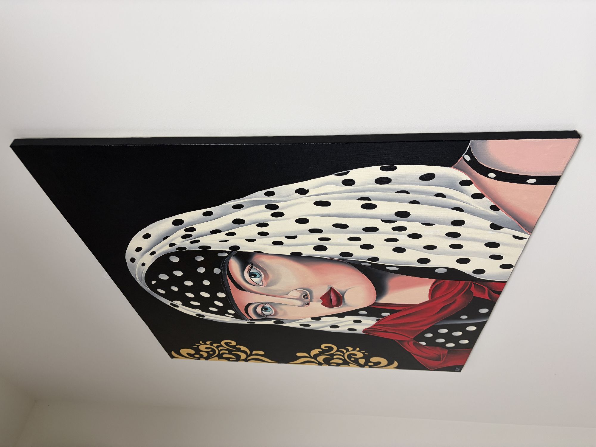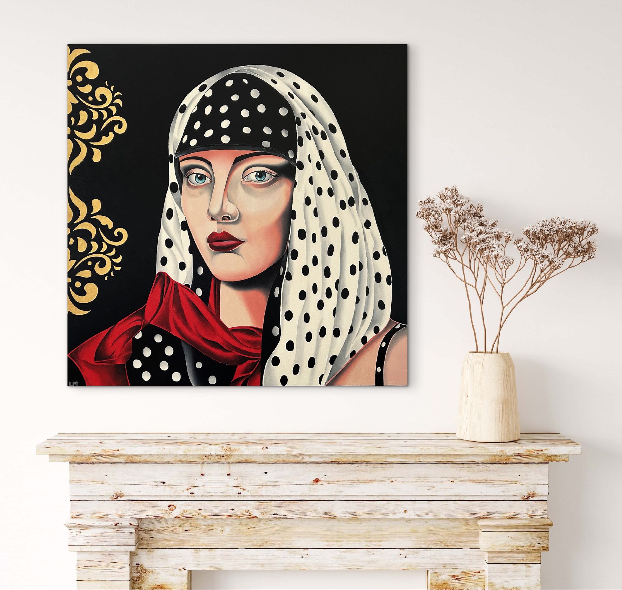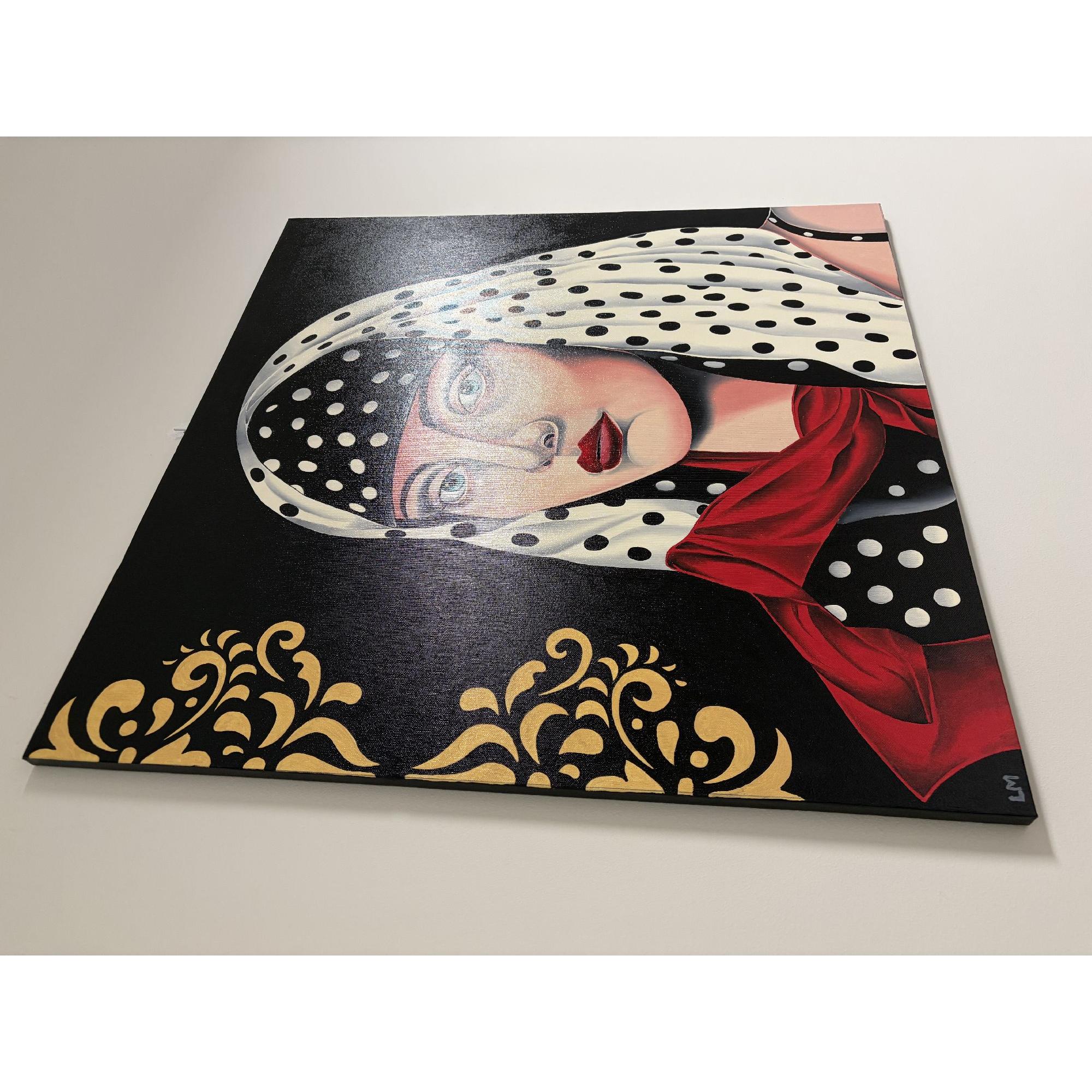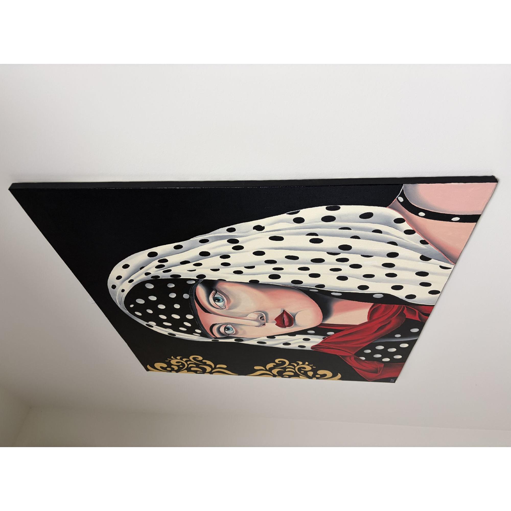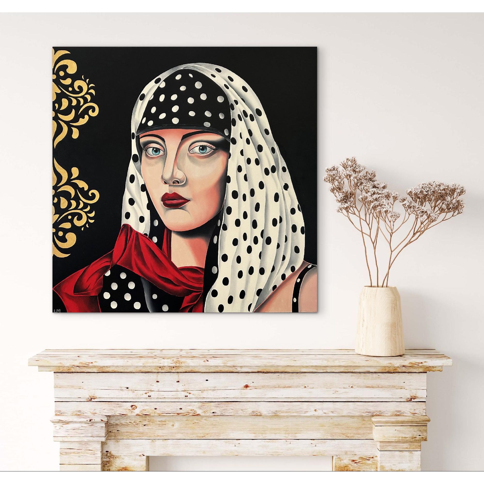 Un'opera pittorica dallo stile sofisticato ritrae una donna con un foulard a pois bianchi e neri, arricchita da dettagli dorati sullo sfondo nero.La composizione è strutturata in modo da concentrare l'attenzione sullo sguardo della donna, posizionata centralmente rispetto al quadro.Il suo volto occupa gran parte della scena, con la testa avvolta in un foulard bianco a pois neri che contrasta con lo sfondo nero. Un drappeggio di tessuto rosso, anch'esso a pois, incornicia le spalle e aggiunge un elemento di colore vibrante.Sul lato sinistro, un motivo decorativo dorato completa la composizione. L'inquadratura è ravvicinata, concentrandosi sul volto e sulle spalle della figura femminile.