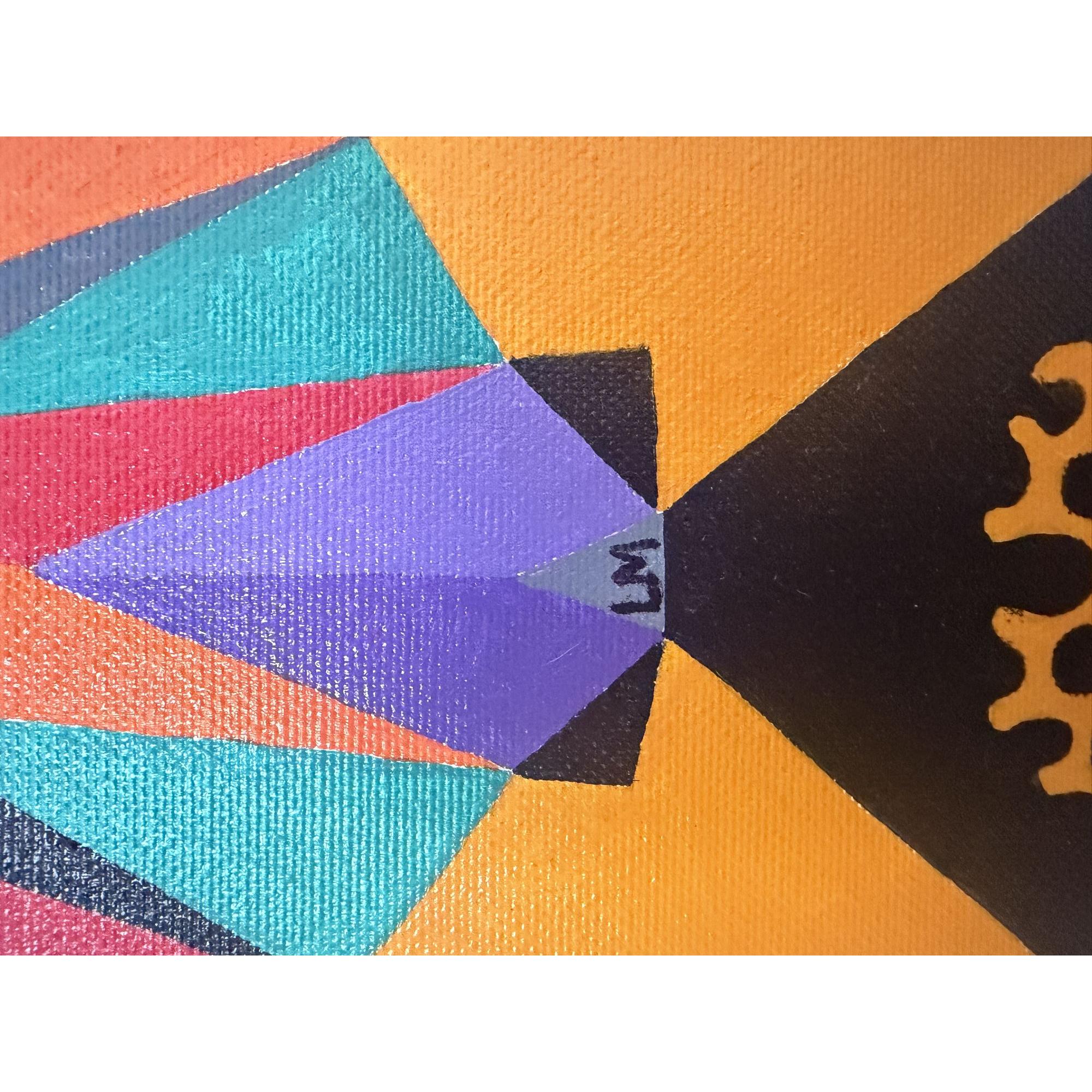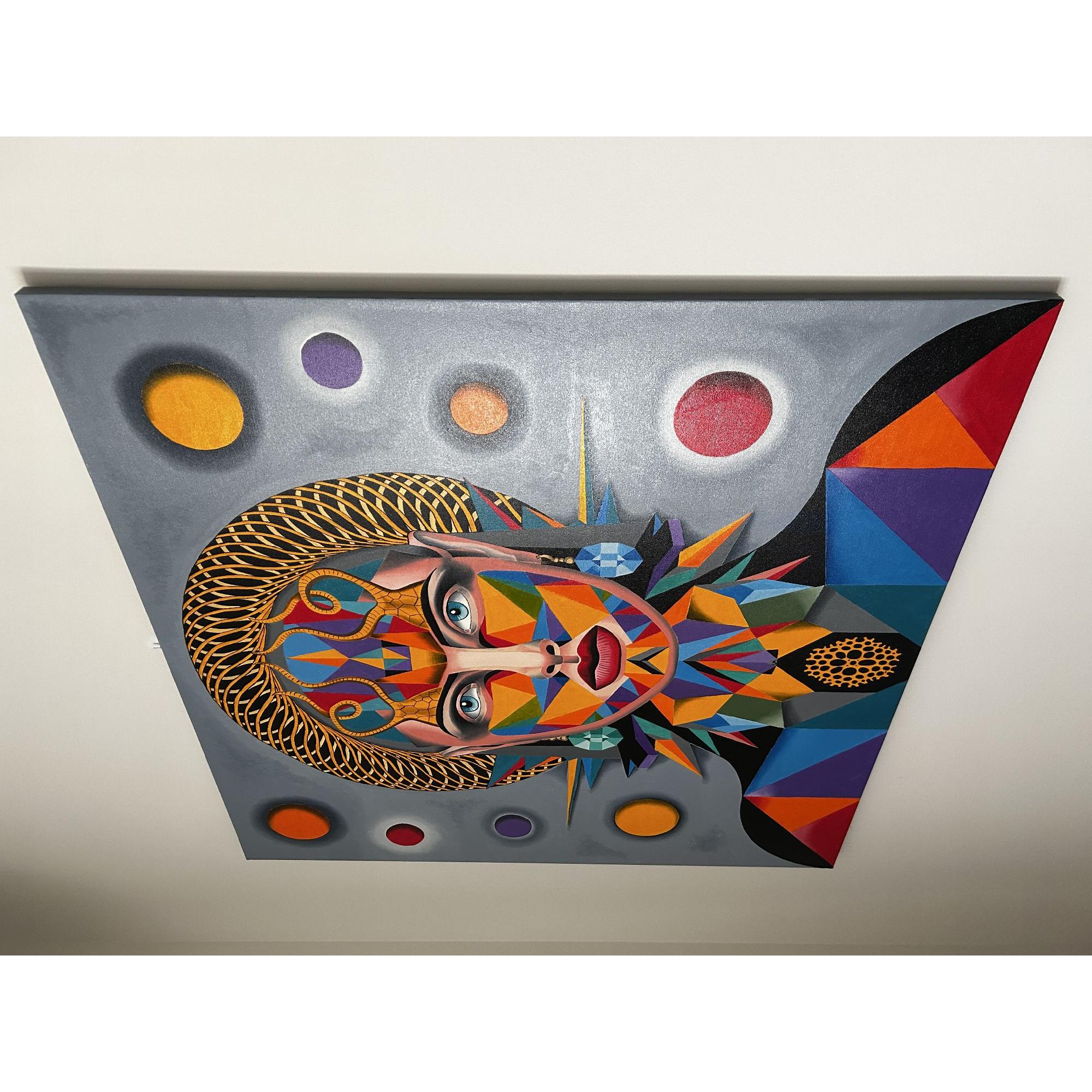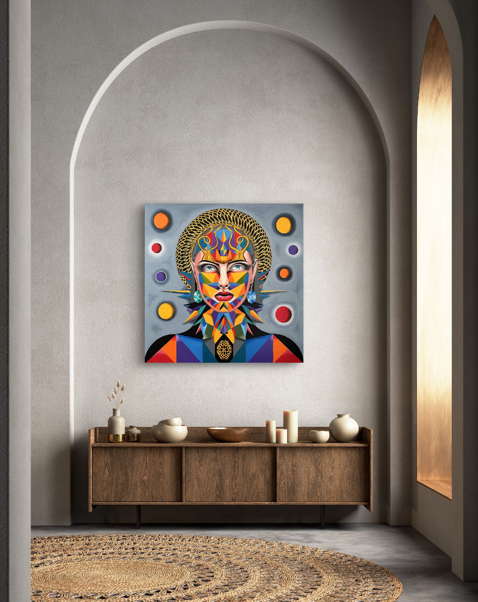 Un ritratto stilizzato di una donna presenta un'estetica geometrica e colorata, con dettagli complessi e un'aura mistica che cattura l'attenzione dello spettatore.La composizione è simmetrica e frontale, con il volto della donna al centro, incorniciato da una struttura a rete dorata e da cerchi colorati sullo sfondo grigio.La sua figura è adornata da forme geometriche multicolori, che si sovrappongono e si intersecano, creando un'immagine visivamente ricca e complessa. L'uso della simmetria e della frontalità conferisce alla scena un senso di stabilità e potere.Elementi triangolari e lineari si irradiano dal collo, contribuendo alla sua presenza imponente