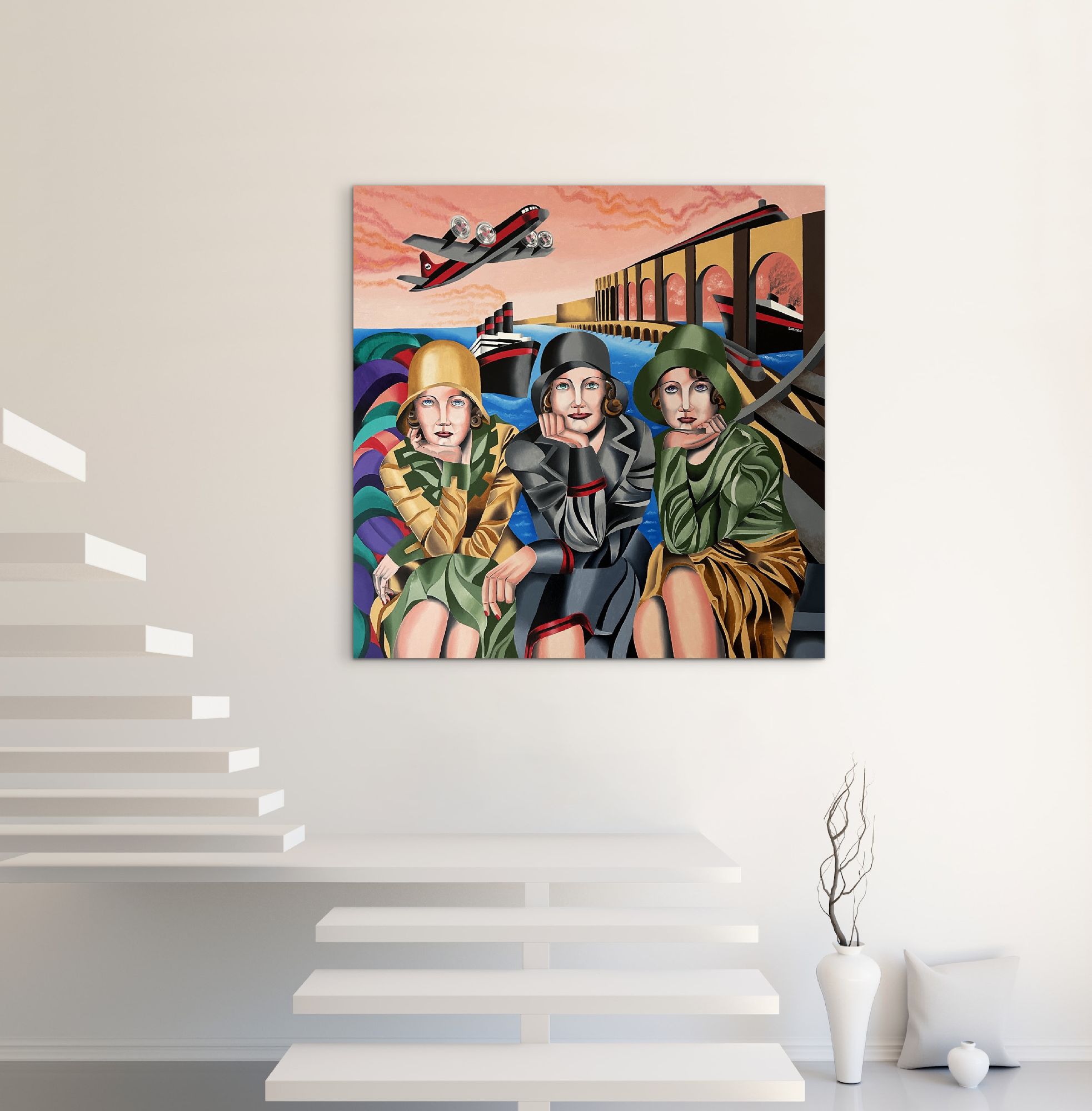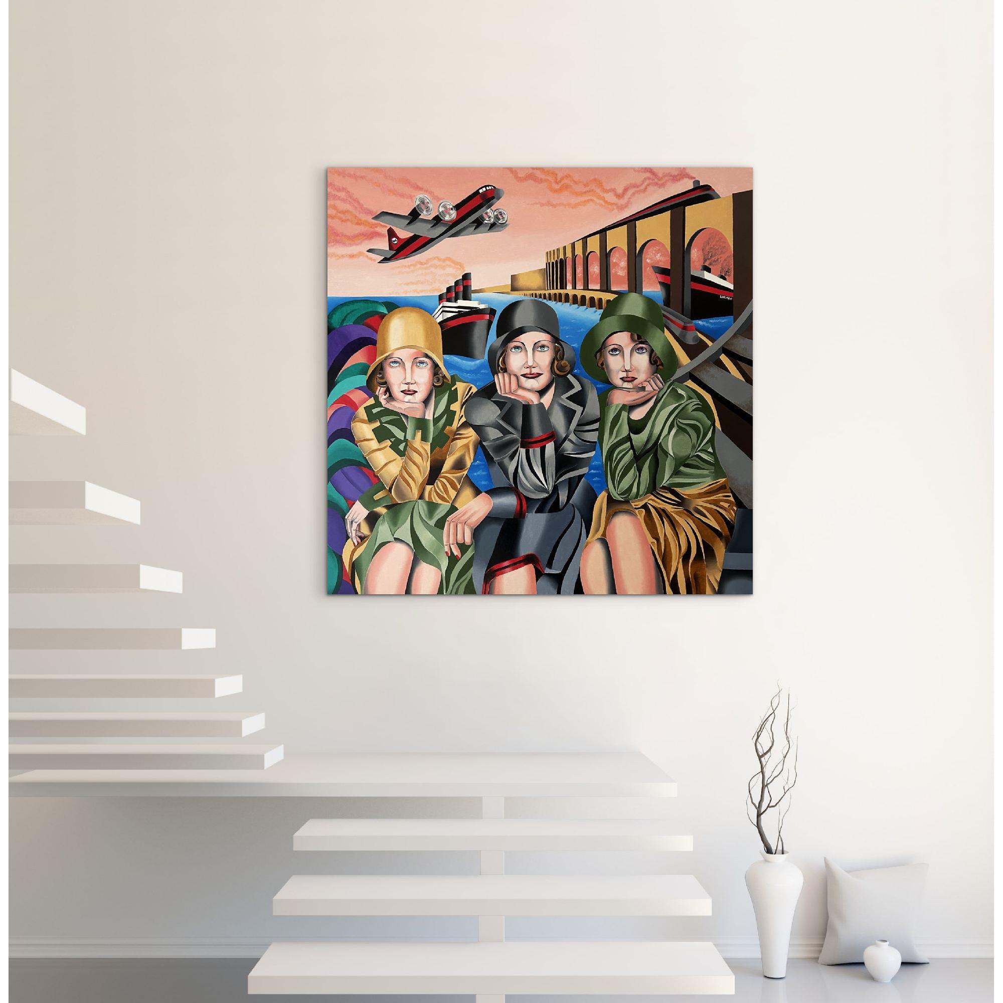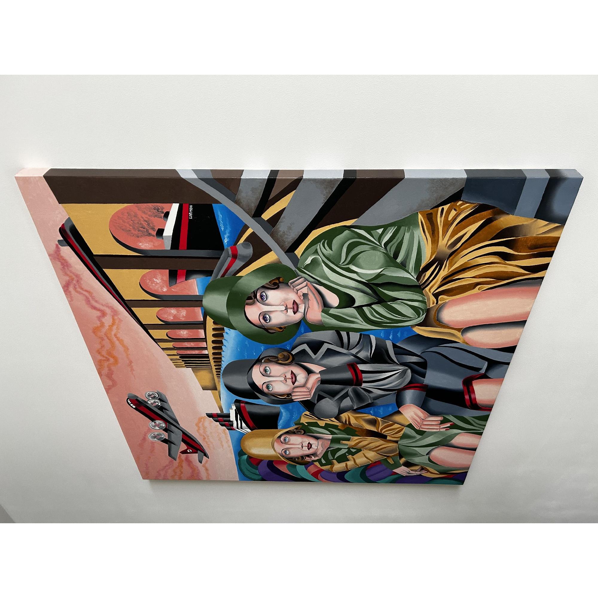 Questo vivido dipinto stilizzato raffigura tre donne sedute in primo piano, ciascuna con il mento appoggiato su una mano e lo sguardo rivolto verso l'osservatore.Indossano eleganti abiti d'ispirazione vintage: cappotti, cappelli a cloche e audaci motivi geometrici nei toni dell'oro, del grigio e del verde.Lo sfondo è una scena onirica di acque azzurre, ampi archi architettonici e transatlantici stilizzati.Un aereo con eliche rotanti vola attraverso un cielo drammatico striato di nuvole rosa.Il dipinto fonde elementi dell'Art Déco e del Cubismo, infondendo alla composizione un senso di nostalgia, movimento e unità.