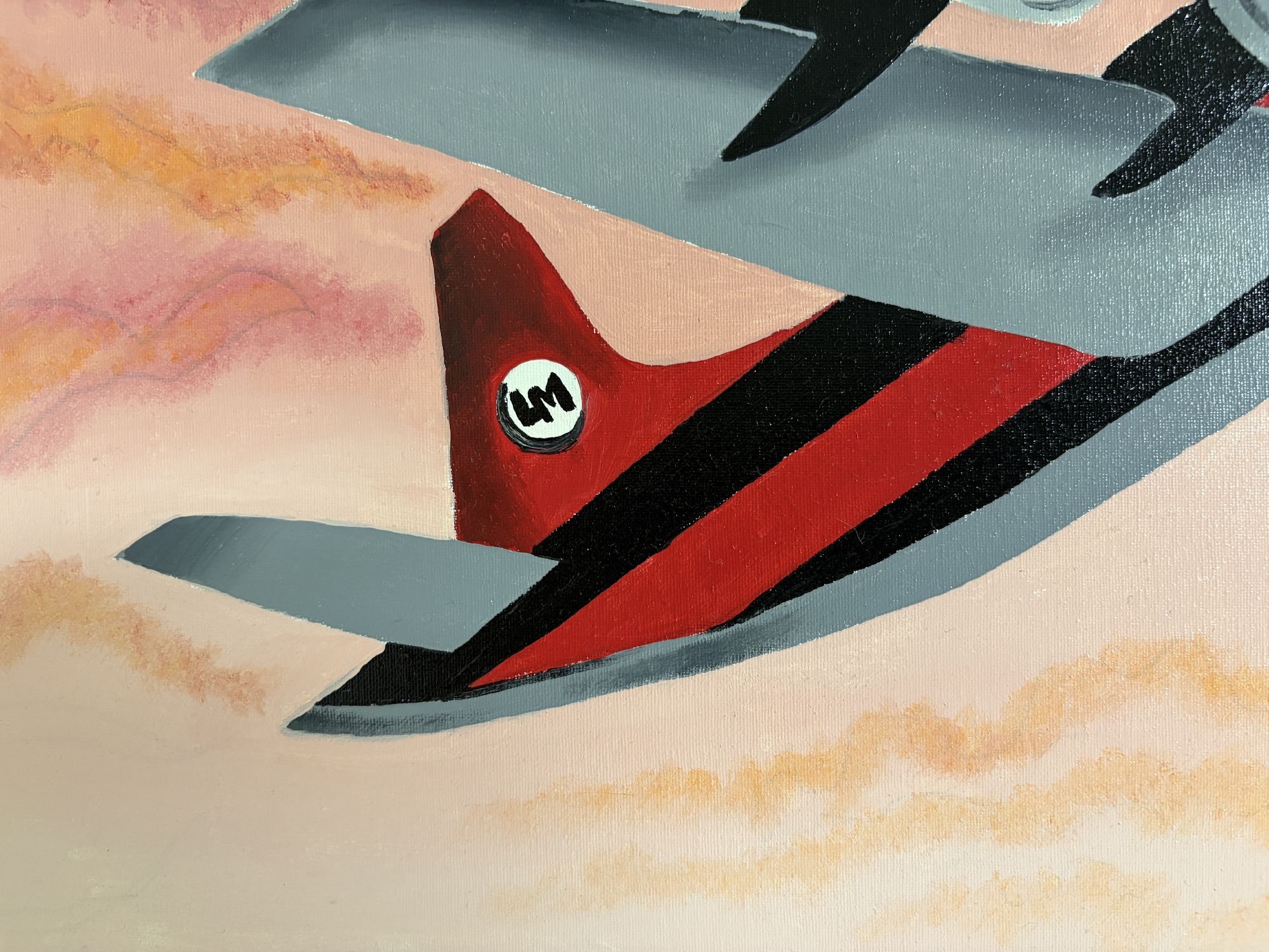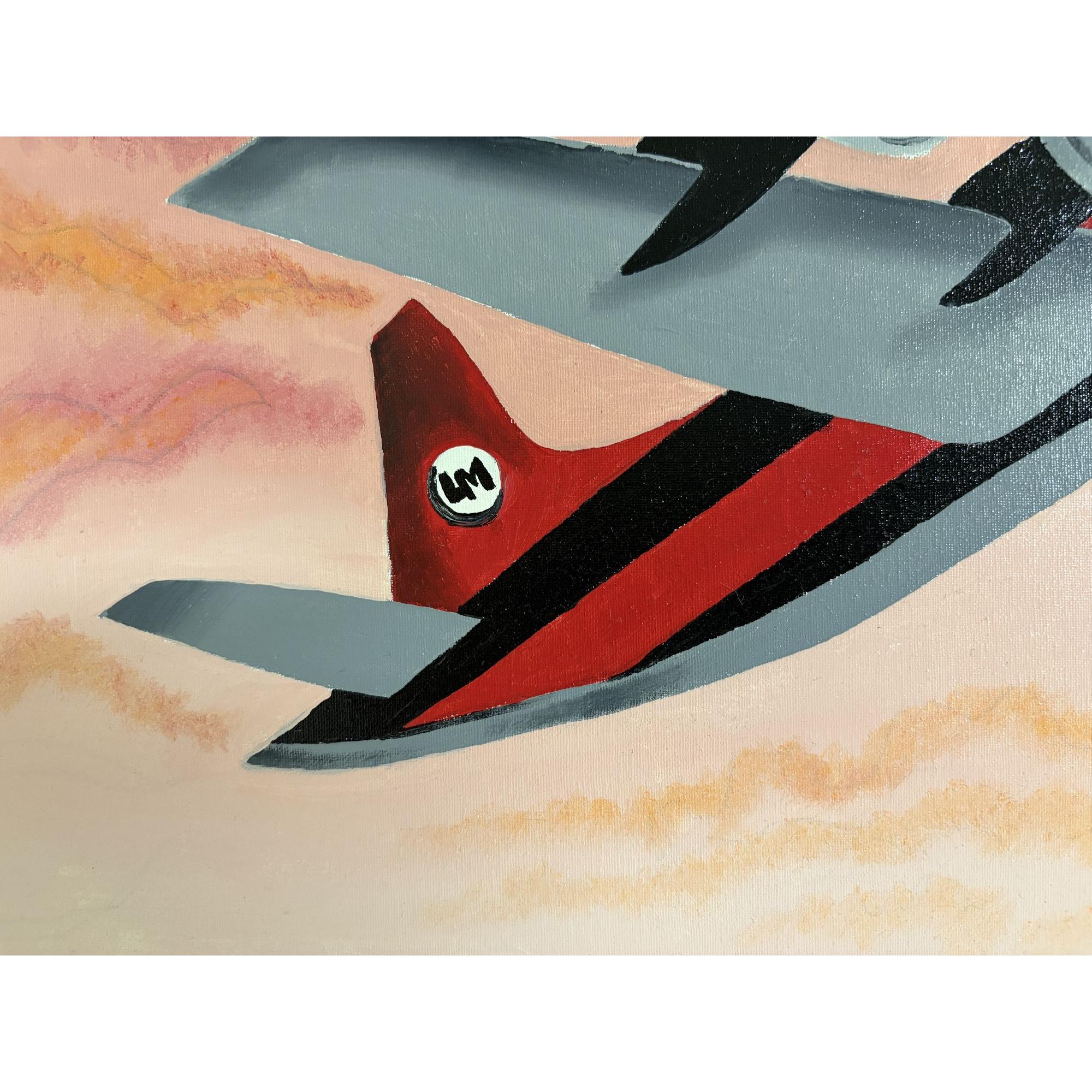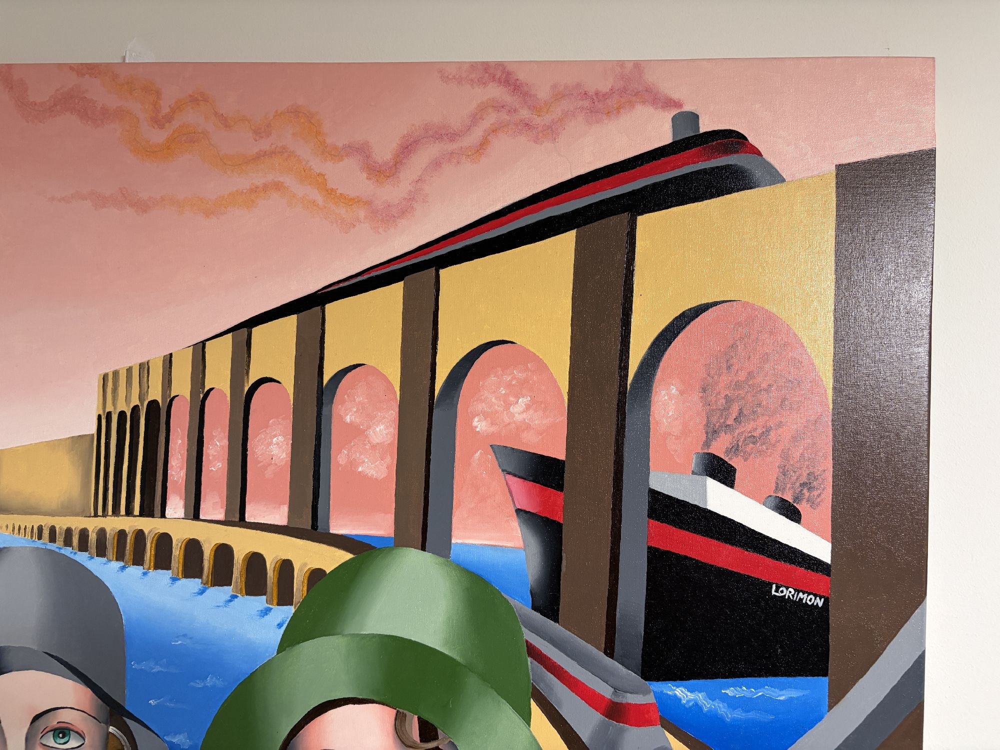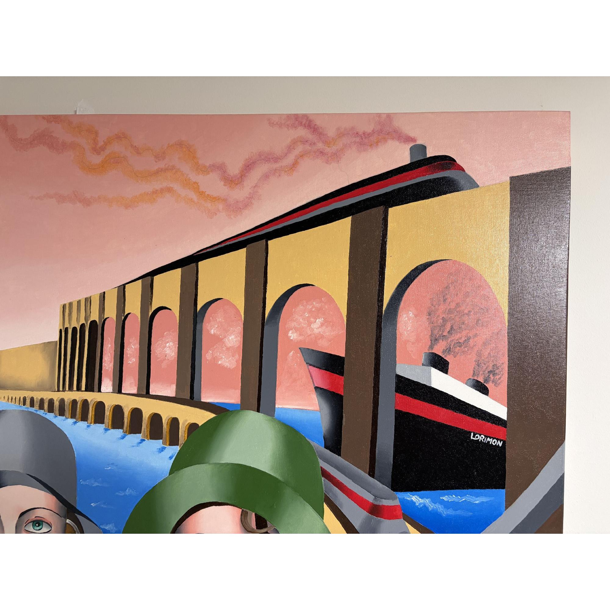 Questo vivido dipinto stilizzato raffigura tre donne sedute in primo piano, ciascuna con il mento appoggiato su una mano e lo sguardo rivolto verso l'osservatore.Indossano eleganti abiti d'ispirazione vintage: cappotti, cappelli a cloche e audaci motivi geometrici nei toni dell'oro, del grigio e del verde.Lo sfondo è una scena onirica di acque azzurre, ampi archi architettonici e transatlantici stilizzati.Un aereo con eliche rotanti vola attraverso un cielo drammatico striato di nuvole rosa.Il dipinto fonde elementi dell'Art Déco e del Cubismo, infondendo alla composizione un senso di nostalgia, movimento e unità.
