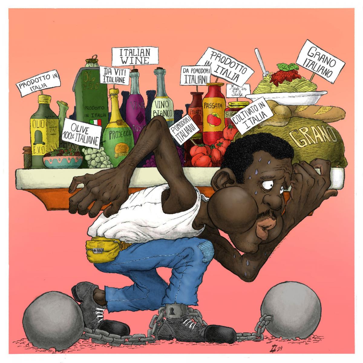 Questa illustrazione è stata pubblicata sul libro" Il Canzoniere delle morti sul lavoro" e vuole far riflettere sul concetto di made in italy, che purtroppo molto spesso è solo una trovata commerciale che nasconde in realtà lo sfruttamento e le condizioni disumane dei lavoratori, molto spesso stranieri, all'interno delle produzioni dei nostri cosiddetti prodotti made in italy