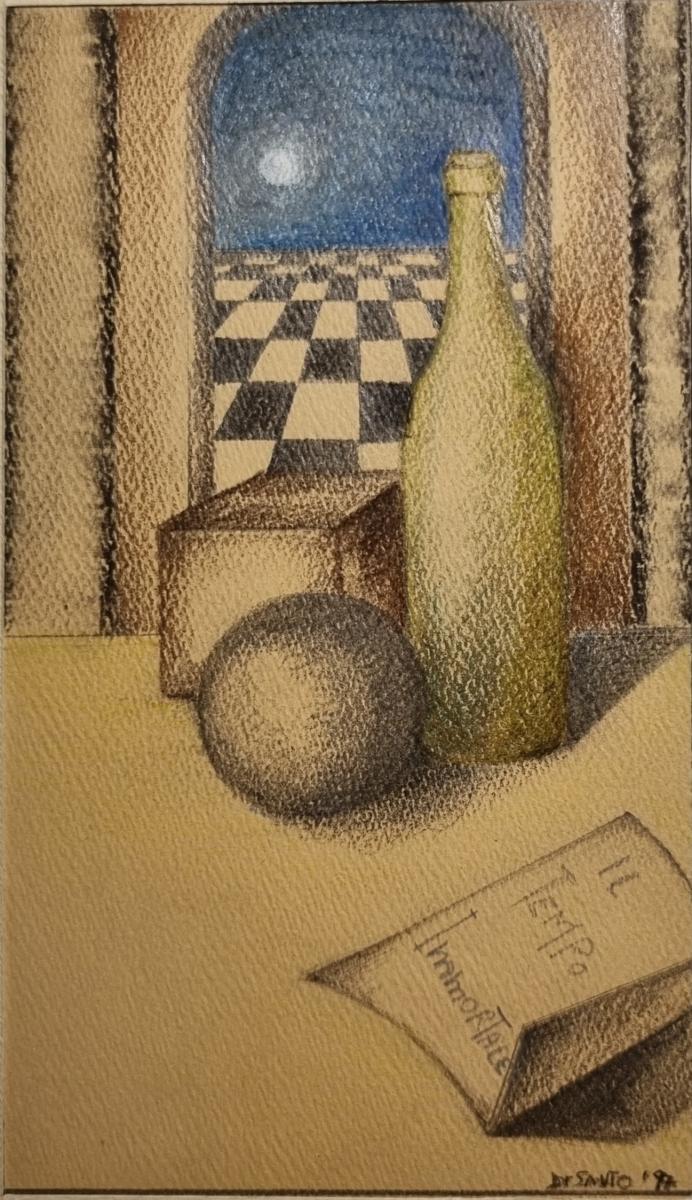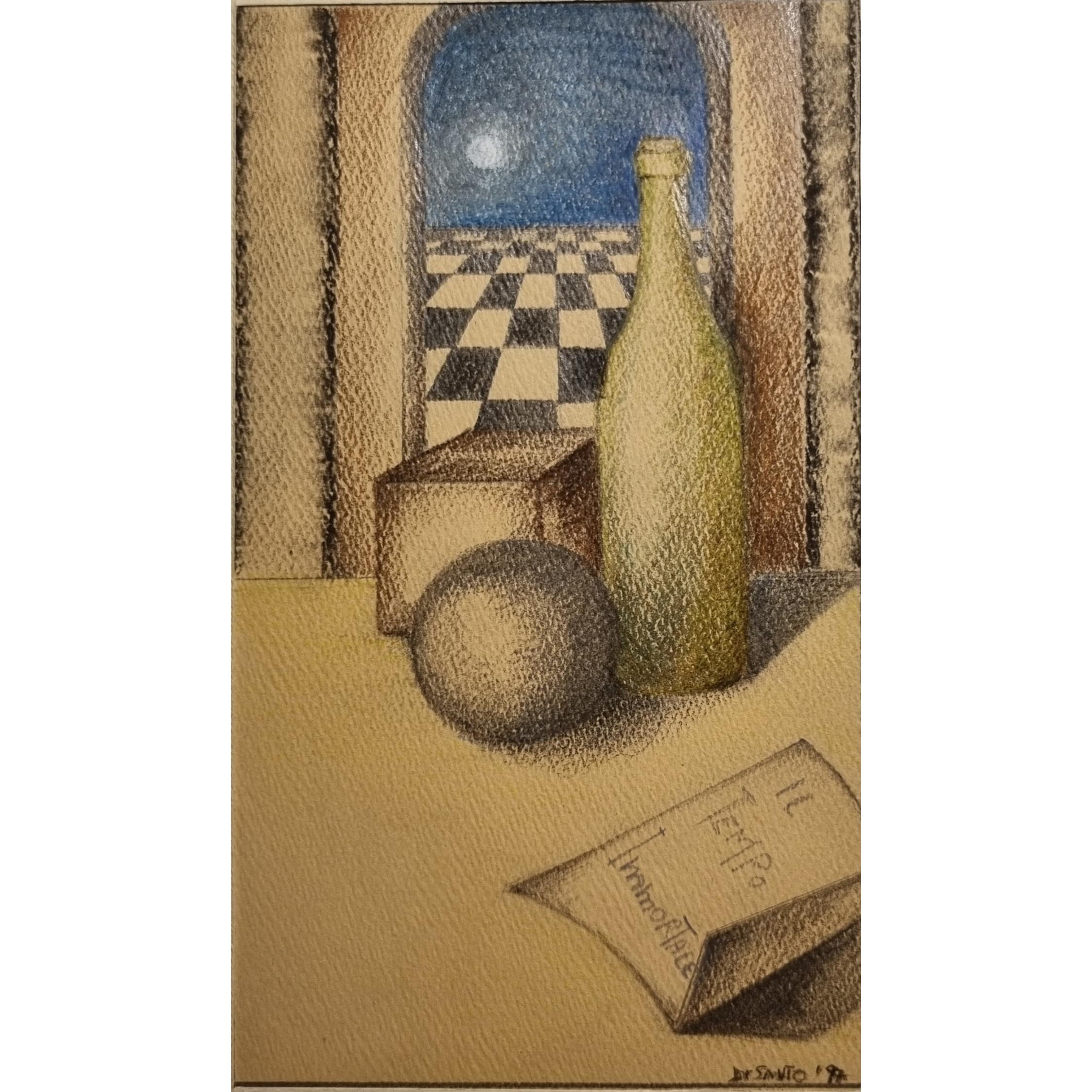 L’opera è una meditazione sul tempo e sulla percezione dello spazio, dove la realtà quotidiana si apre verso una dimensione più profonda e contemplativa. Il tempo che scorre tra ciò che è materiale e presente (gli oggetti sul tavolo) e ciò che è astratto e infinito (lo spazio oltre la finestra).