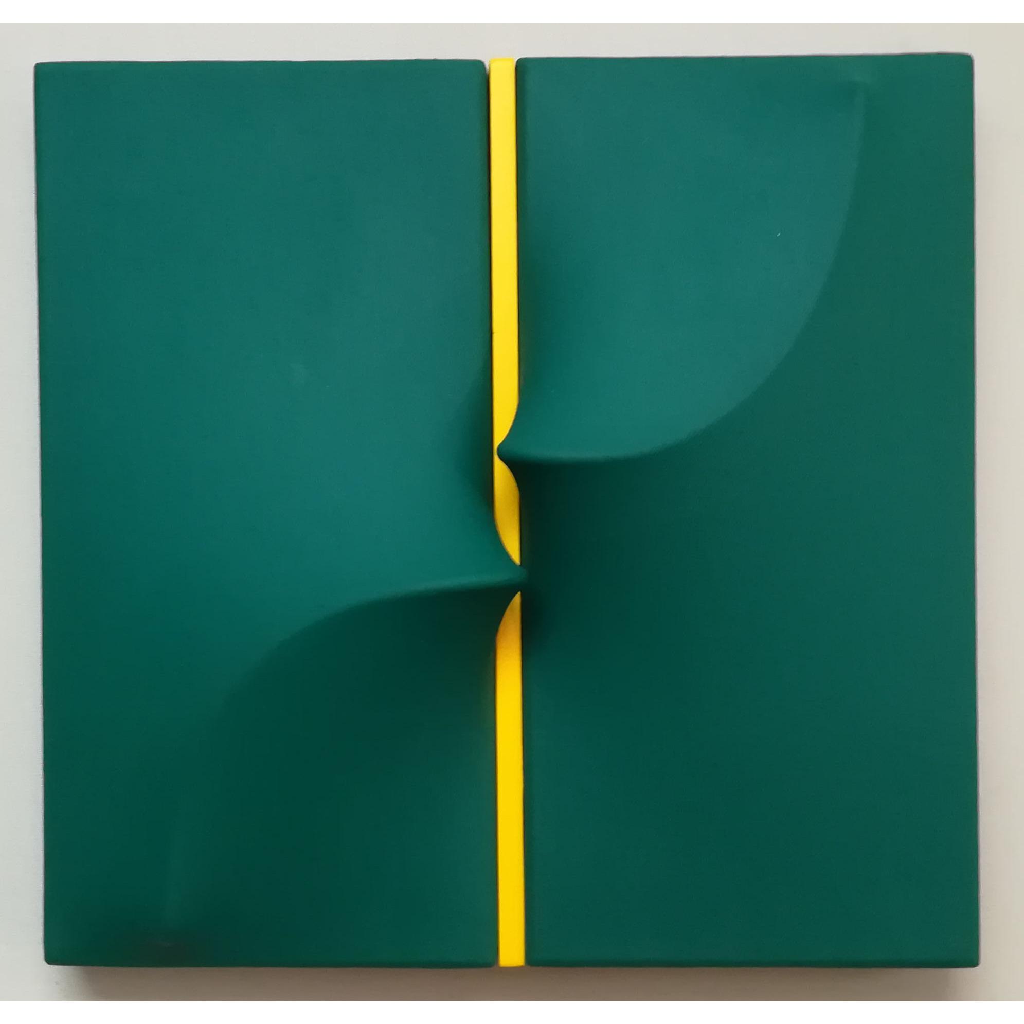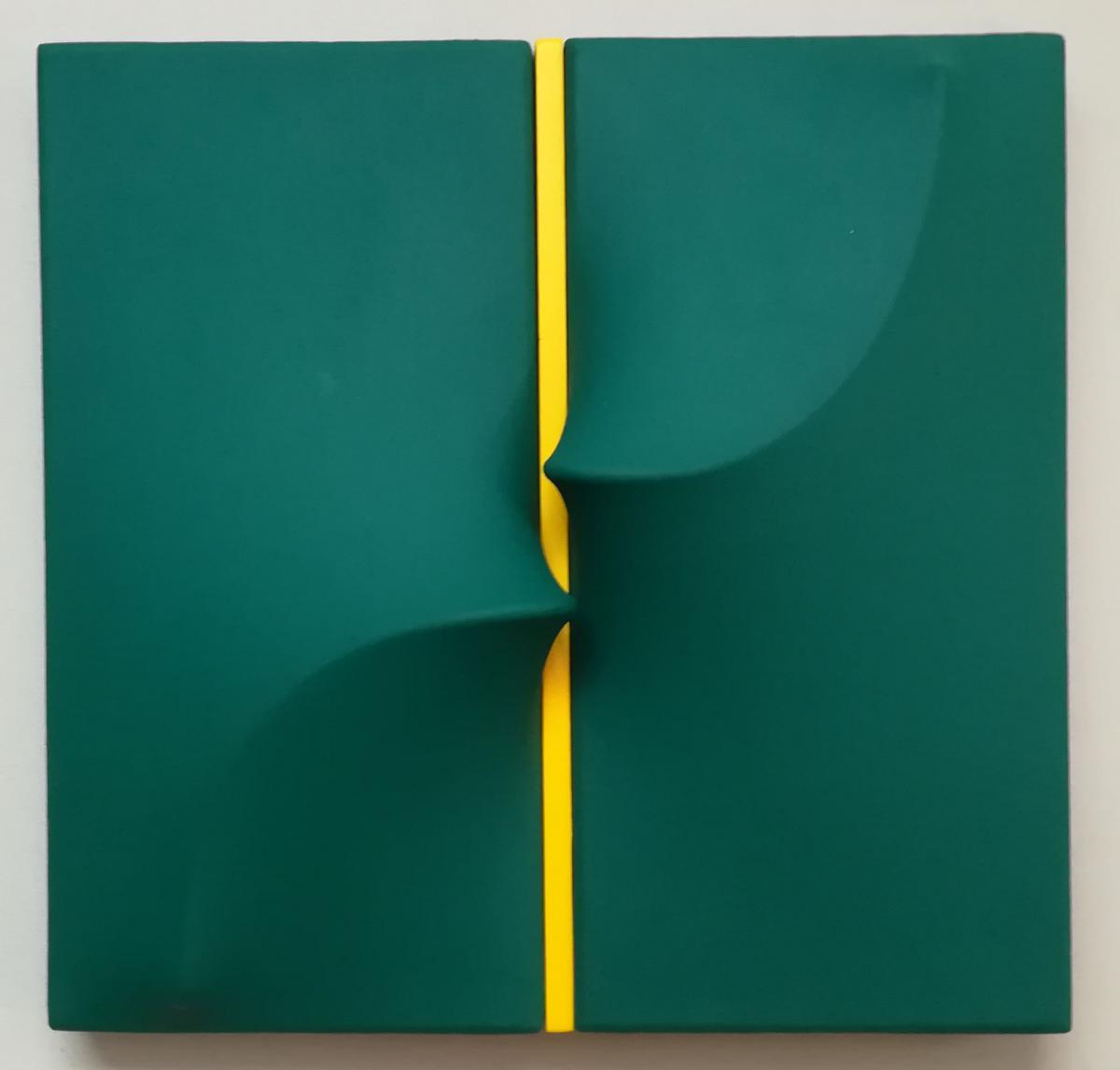 - estroflessione: acrilico verdesu tela estroflessa applicata su tavola con linea gialla,