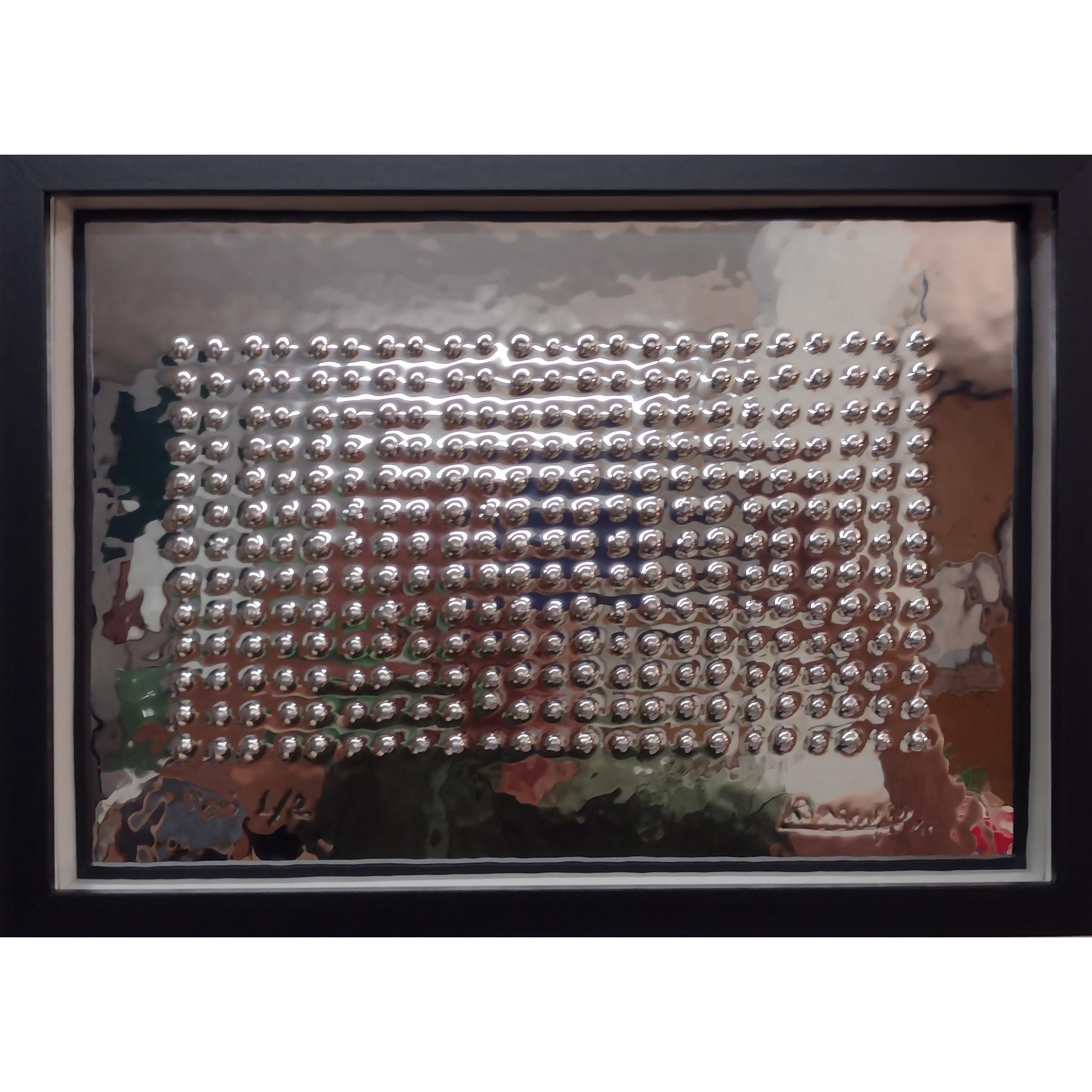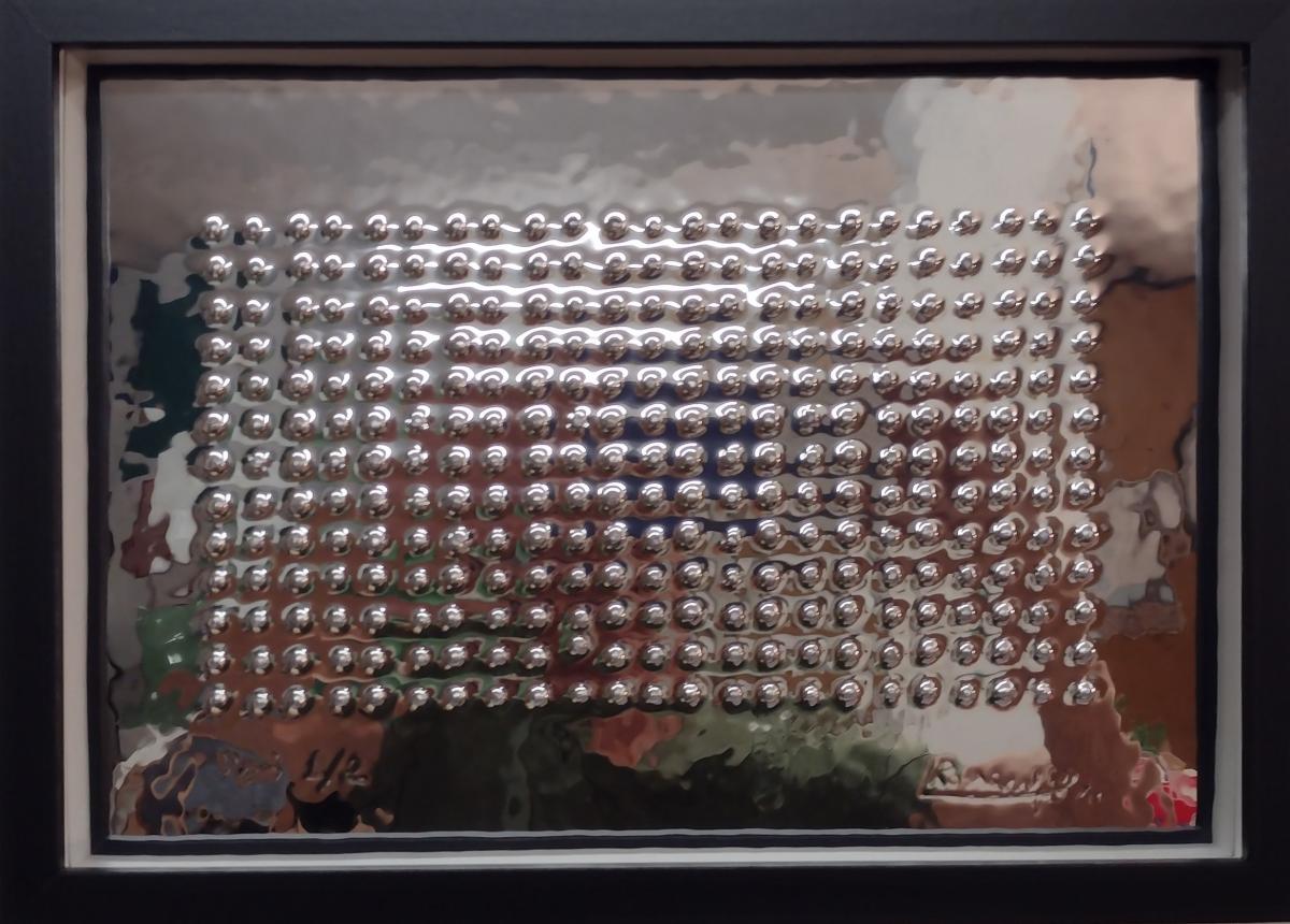 Goffratura (rilievo fatto a mano ) , sottile lastra di alluminio lucidata a specchio ap, 1998