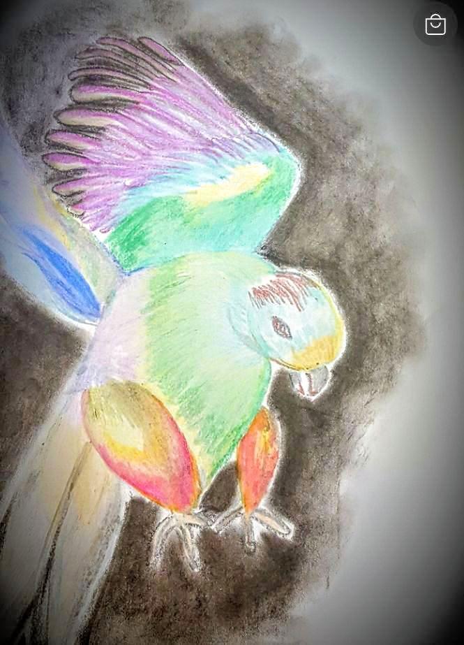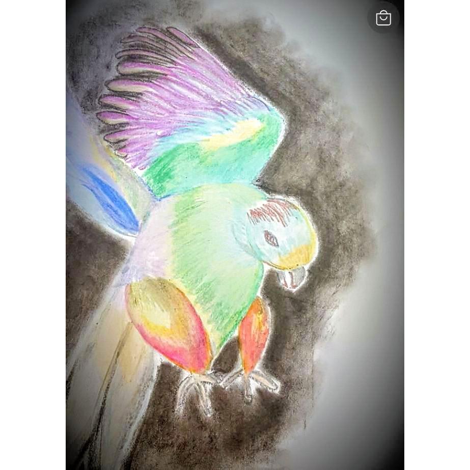 Disegno a matita su carta da fotocopie rappresentante un pappagallo in volo. Anche in questo caso il disegno è senza cornice, che può essere aggiunta a parte su richiesta dell'acquirente. Il prezzo è da intendersi escluse spese di spedizione, che verranno conteggiate supplementari al momento dell'acquisto.