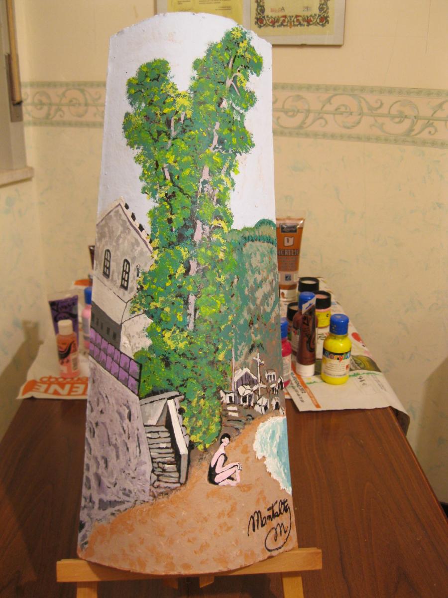 30/11/2012 - Panorama immagginario donna in spiaggia. Come dire di no al mio nipotino sulla richiesta di dipingergli qualcosa sulle tegole? E' stato molto felice quando gliele ho consegnate, queste saranno devolute in beneficenza con il loro ricavato nel sorteggio Natalizio che terranno a scuola.