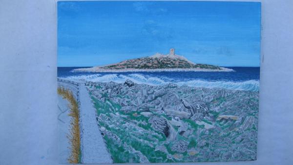 45) - 12 - Definito il cielo e l'isolotto ho cambiato il mare aggiungendo le onde che in quel tratto sono sempre presenti dato le due correnti contrarie, ho anche iniziato la pittura alle scogliere.