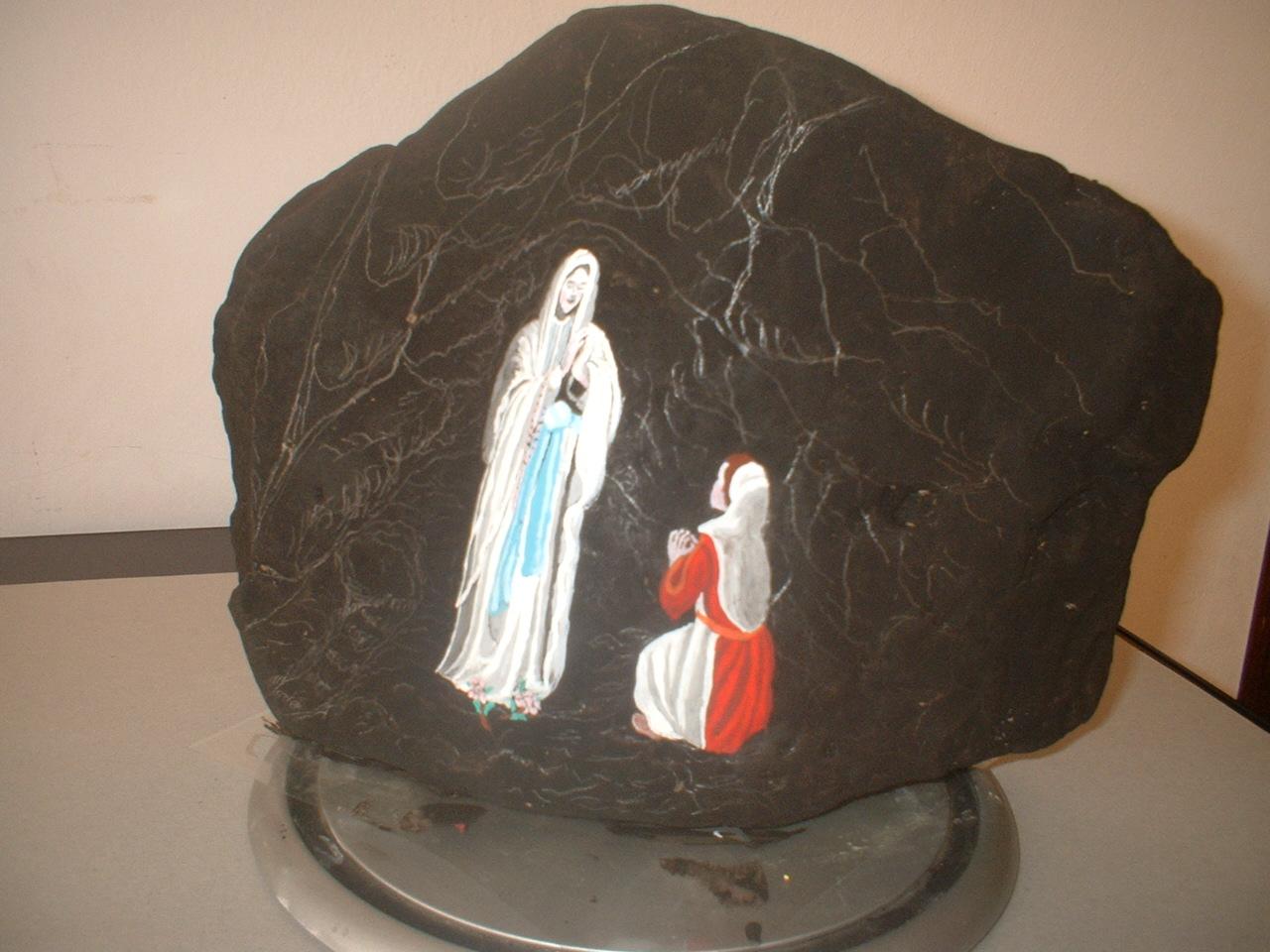 L'artista Michele Montalto, avendo fatto il pellegrinaggio con il treno degli infermi organizzato dall' UNITALSI a Lourdes serbandone un bel ricordo ha voluto segnare con colori acrilici l'immagine della Madonna al momento che era apparsa a Bernadette nella grotta di Massabielle su una pietra che in principio l'aveva fissata su una base in plastica circolare.