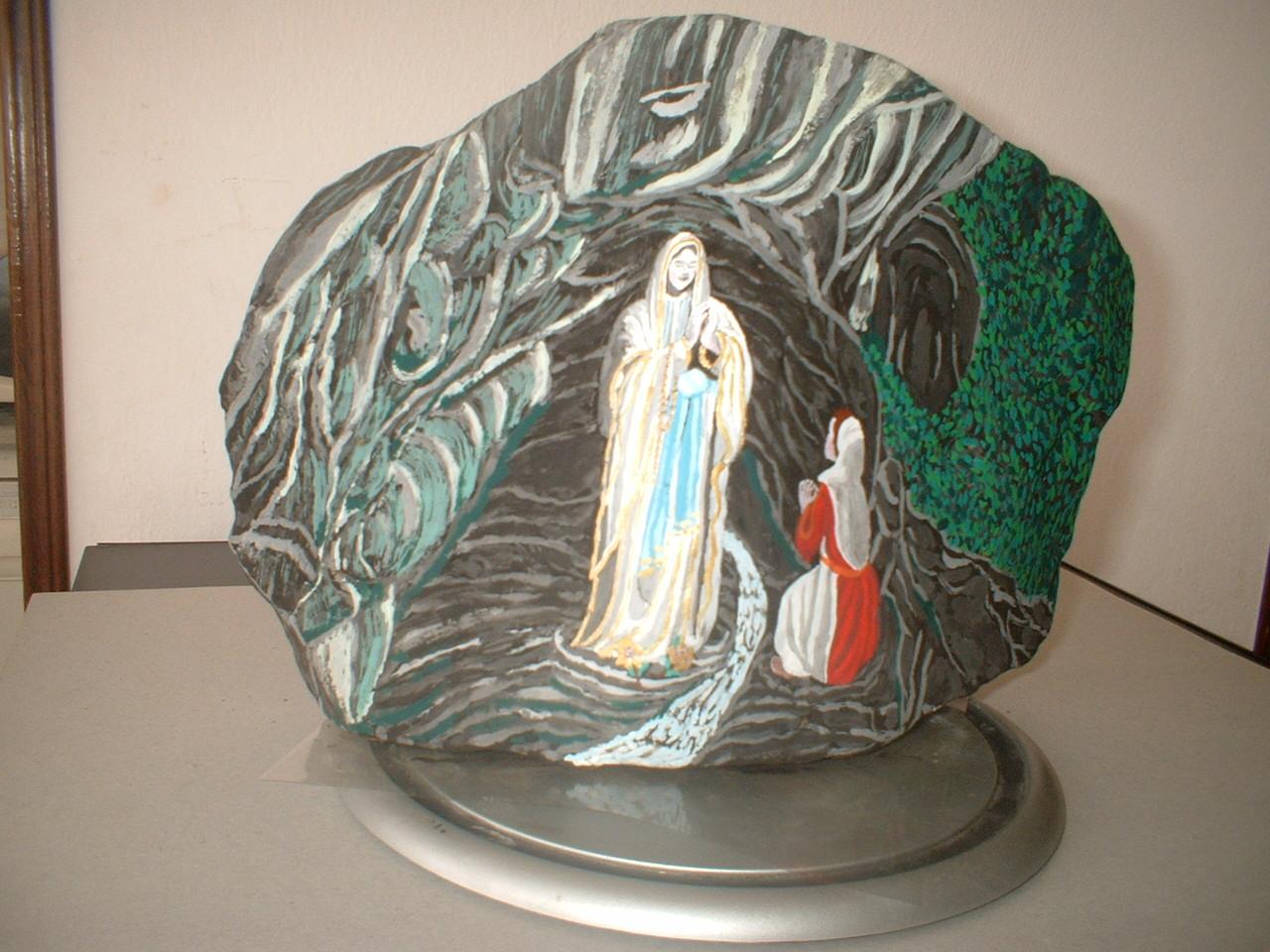 Da tempo maturavo il desiderio di riprodurre la grotta di Massabielle quando la Madonna apparve a Santa Bernadette, ma cercavo un’ispirazione particolare, essa mi si presentò un giorno mentre visitavo le rive del lago di Piana degli Albanesi,( Palermo ) la cosa che mi colpi’ era una grossa pietra di forma piatta da un lato e con dislivello dalla parte opposta, notavo che si reggeva su una base poggiata su un piano, in tre punti, la giravo e la rigiravo, infine la condussi a casa. La ripulii con petrolio e tracciati due punti sulla base praticai due fori da mm 5 con una profondità di cm 3. Preparai un supporto utilizzai la base di un monitor in disuso dove praticai gli stessi fori equidistanti. Preparai due asticine filettate da mm 4 x 45 che tramite dadi e rondelle fissai sul supporto. Capovolsi la pietra sostenendola con degli spessori, e dopo aver provato il supporto colai del cemento liquido sui fori e ve lo innestai. Atteso il tempo d’assorbimento ho dato una mano di colore acrilico in entrambi le facciate. Ho eseguito una tracciatura sulla parete dipinta con acrilico nero( parte con dislivello ) In questa foto mostro la prima fase del dipinto.