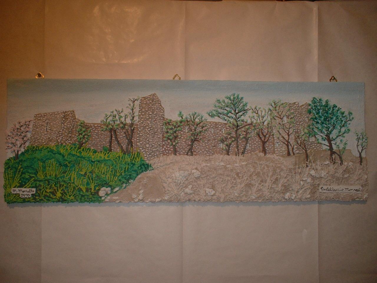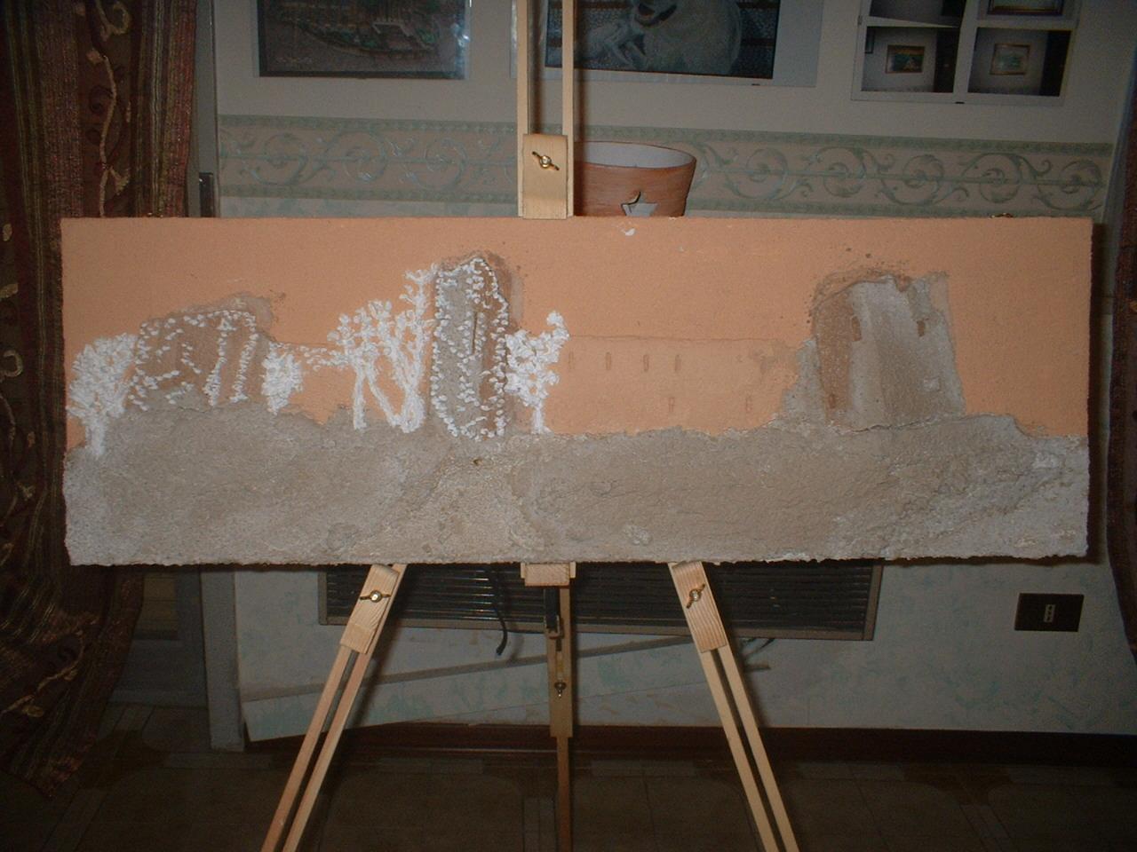 Eseguo delle feritorie sia sulle muraglie che sulle torri. Sulla parte sinistra del Castellaccio, inizio la sovrapposizione, inserendo alcuni alberi, il materiale che li compongono è un impasto formato di polvere di marmo misto con resine.