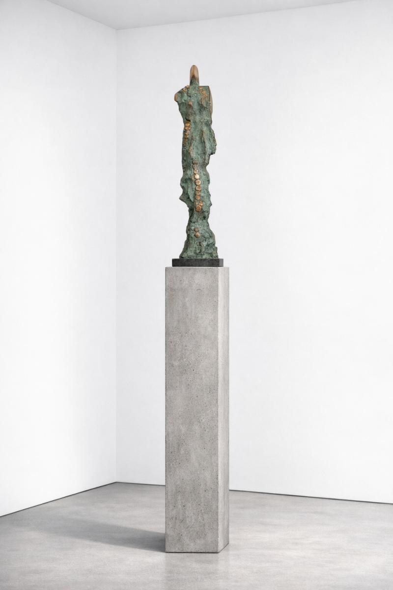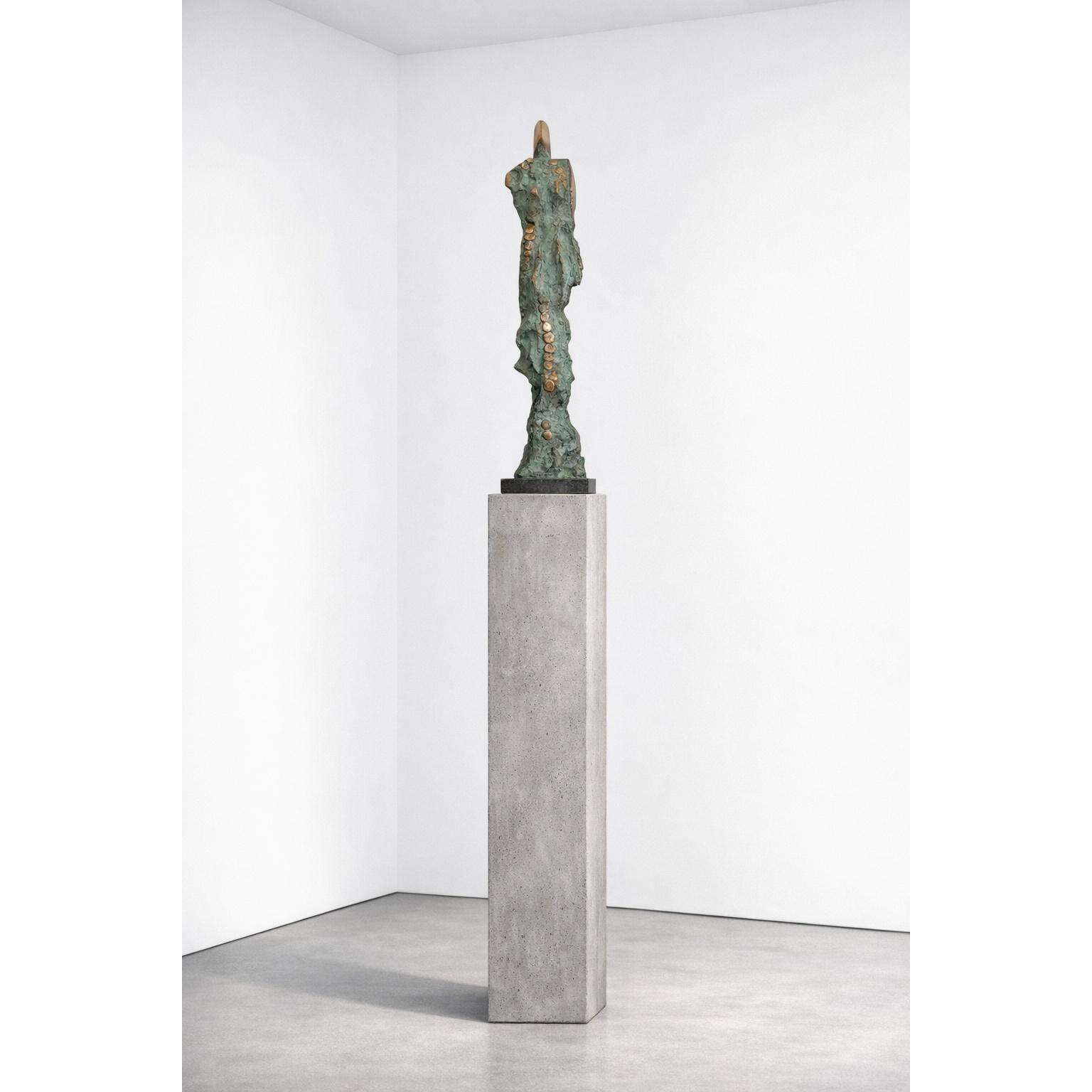 Atena nasce come riflessione sulla condizione femminile e diventa simbolo universale di saggezza e forza. Snella e irregolare, la figura si erge come una colonna di memoria e resilienza; la sua verticalità esprime tensione verso la luce e la consapevolezza. Il bronzo, materiale antico e guerriero, si trasforma in pelle viva, mentre la patina verde evoca il tempo, le ferite e le conquiste. I dischi frontali, disposti come segni rituali, scandiscono il ritmo di un viaggio: ogni cerchio un frammento di storia, un pensiero, una voce. La base in pietra radica la figura nella realtà contemporanea, amplificando il dialogo tra materia e spirito. Atena ritrae la donna non come un'icona, ma come un principio attivo che costruisce, difende e genera: un intimo monumento alla dignità e al potere del femminile