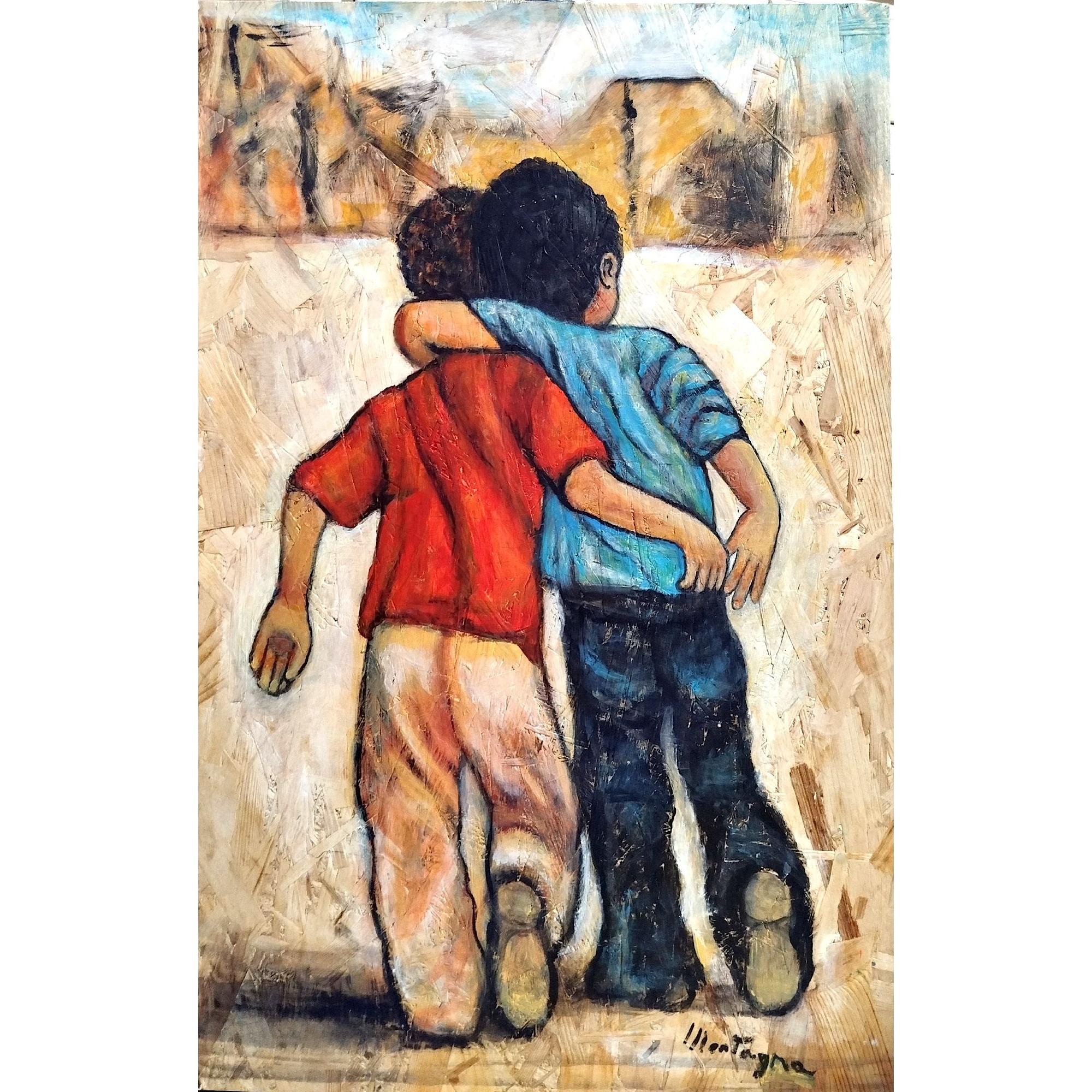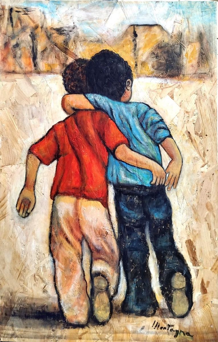 In quest'opera, ho impiegato i colori acrilici per catturare l'essenza dell'amicizia pura ed eterna che nasce in qualunque contesto. Il mio intento espressionistico mi ha guidato a enfatizzare i colori vivaci e le forme audaci, rappresentando due figure avvinghiate in un abbraccio fraterno con uno sfondo indefinito che evoca un contesto difficile, problematico e povero. Per questo ho scelto di usare un supporto grezzo come un pannello in Legno OSB-3 fenolico. Il mio intento è trasmettere il significato profondo di un sentimento come l'amicizia, la forza e l'energia positiva che viene dall'unione umana capace di solidarietà, affetto e supporto reciproco.