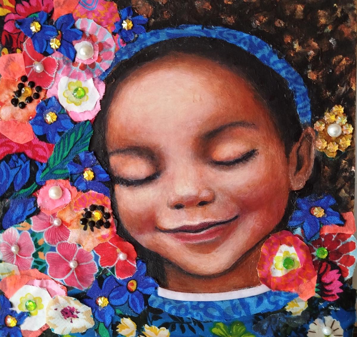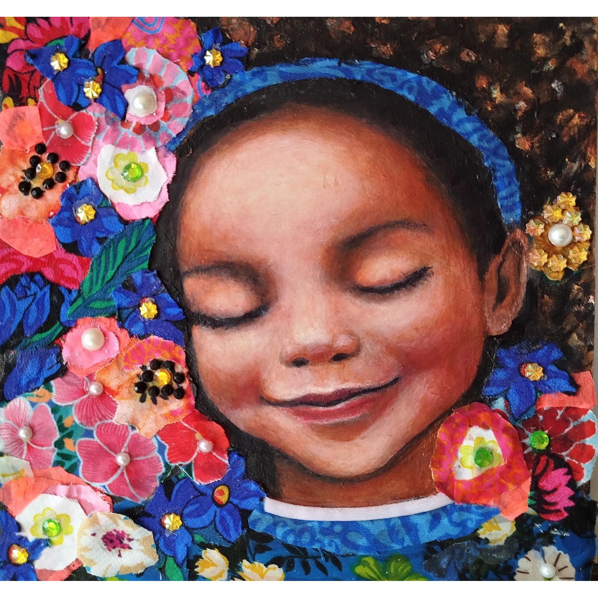 In questo dipinto, ho esplorato la dolcezza e la tenerezza dell'infanzia, mescolando acrilici e tecniche di collage per creare un'atmosfera vivace e colorata. Il soggetto, una bambina sorridente circondata da un mare di fiori in fiore, rappresenta la fiducia e la tranquillità che può provare una bambina in braccio alla sua mamma. Ogni petalo e sorriso sono pennellate di serenità e affetto che trasmettono la fiducia e la positività di chi sta abbandonandosi al sonno in totale sicurezza . Quest'opera, piena di energia e calore, porterà un soffio di freschezza e allegria intorno a sé.
