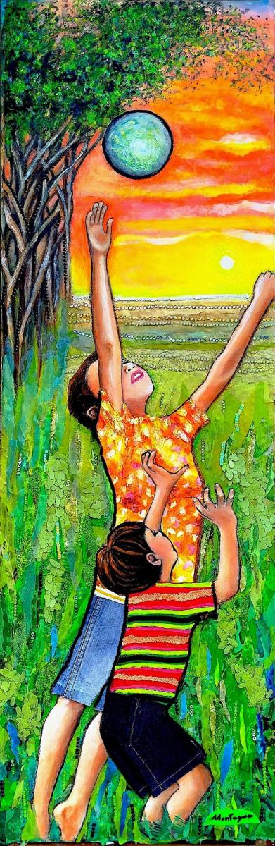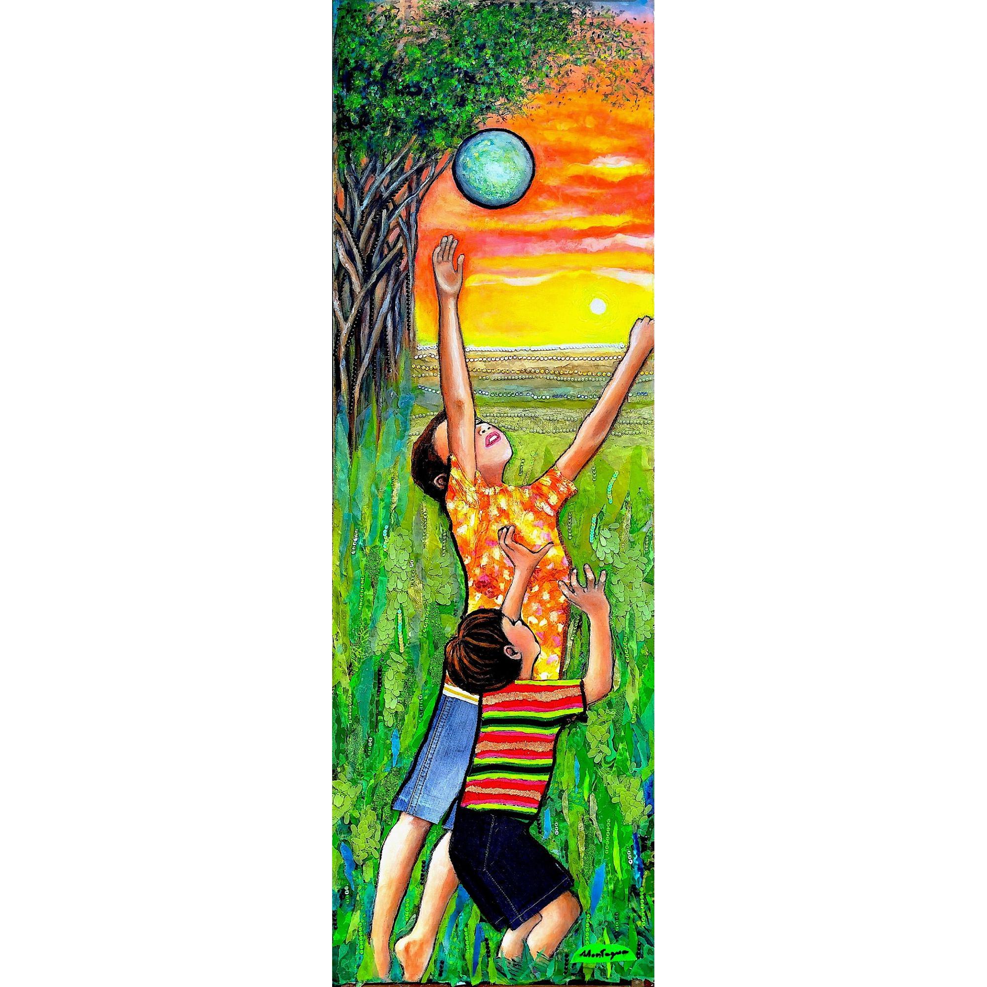 Questa opera rappresenta la gioia pura e spensierata del gioco infantile. L'immagine cattura un momento in cui due bambini giocano con la palla incuranti del tempo che passa e della sera che si avvicina, tendendo le braccia verso il cielo vibrante del tramonto per contendersi la vittoria. L'uso di acrilico e collage intensifica il senso di sogno e di immersione in una realtà che annulla lo spazio e il tempo. È un inno alla gioia e alla spensieratezza che spesso appartengono solo all'infanzia e che si esprimono in un'energia vitale e vivace che arreda ogni spazio con un tocco di ottimismo e colore.