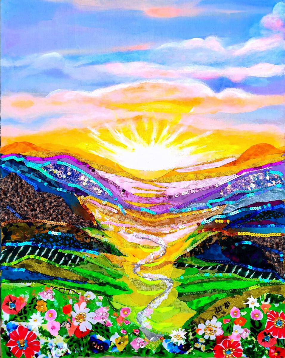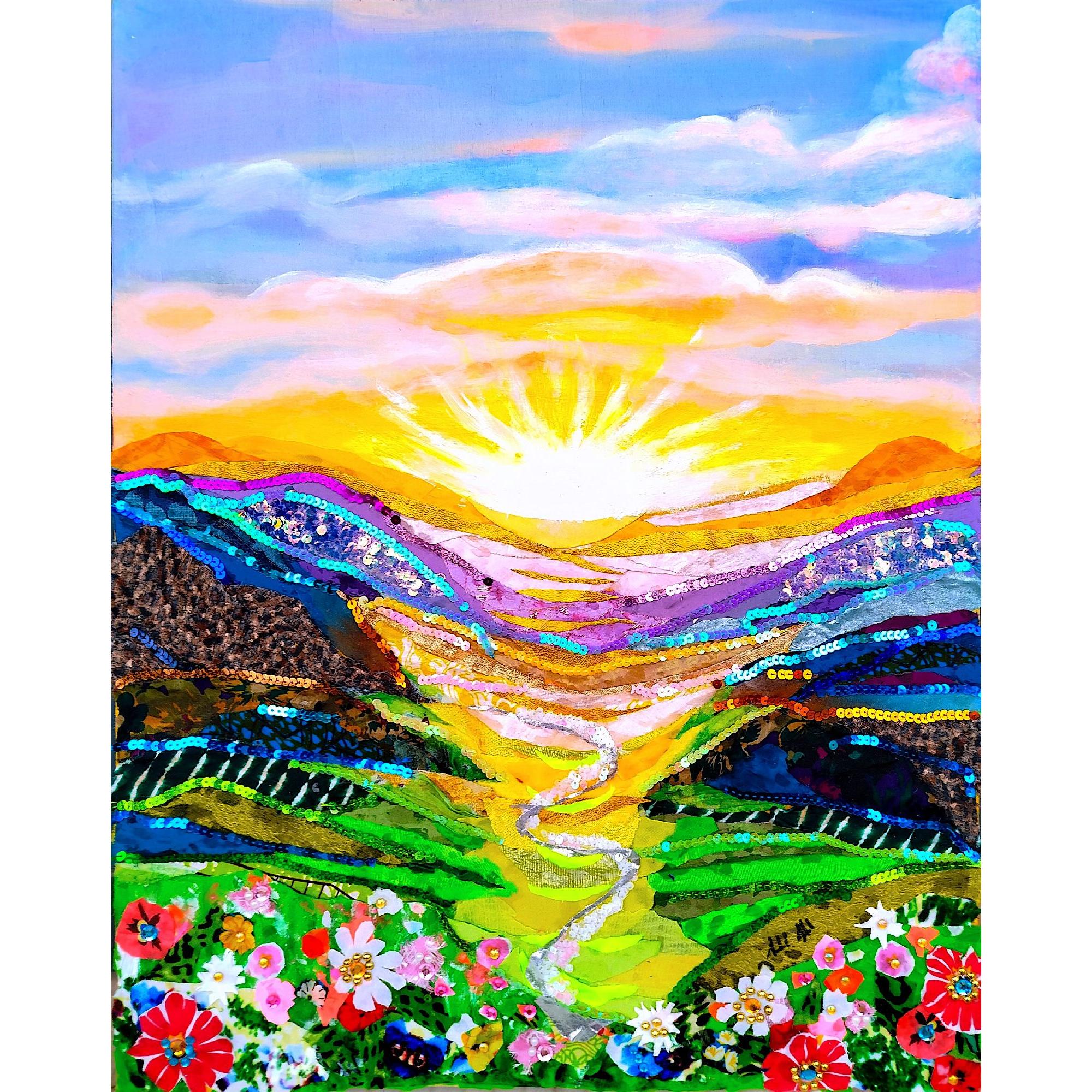 Ho voluto catturare l’essenza di un tramonto che avvolge dolcemente la natura. Attraverso acrilici vivaci e il collage, ho espresso la suggestione della luce serale che risveglia emozioni di pace, speranza e rinascita e si riflette nelle acque del fiume che attraversa la vallata. Questo dipinto porta energia positiva e calore, trasformando ogni ambiente in un abbraccio luminoso e vibrante di vita.