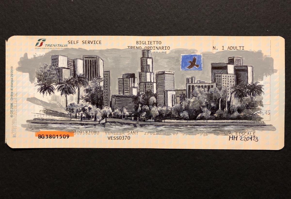 Piccolo dipinto su ticket ferroviario originale e obliterato
