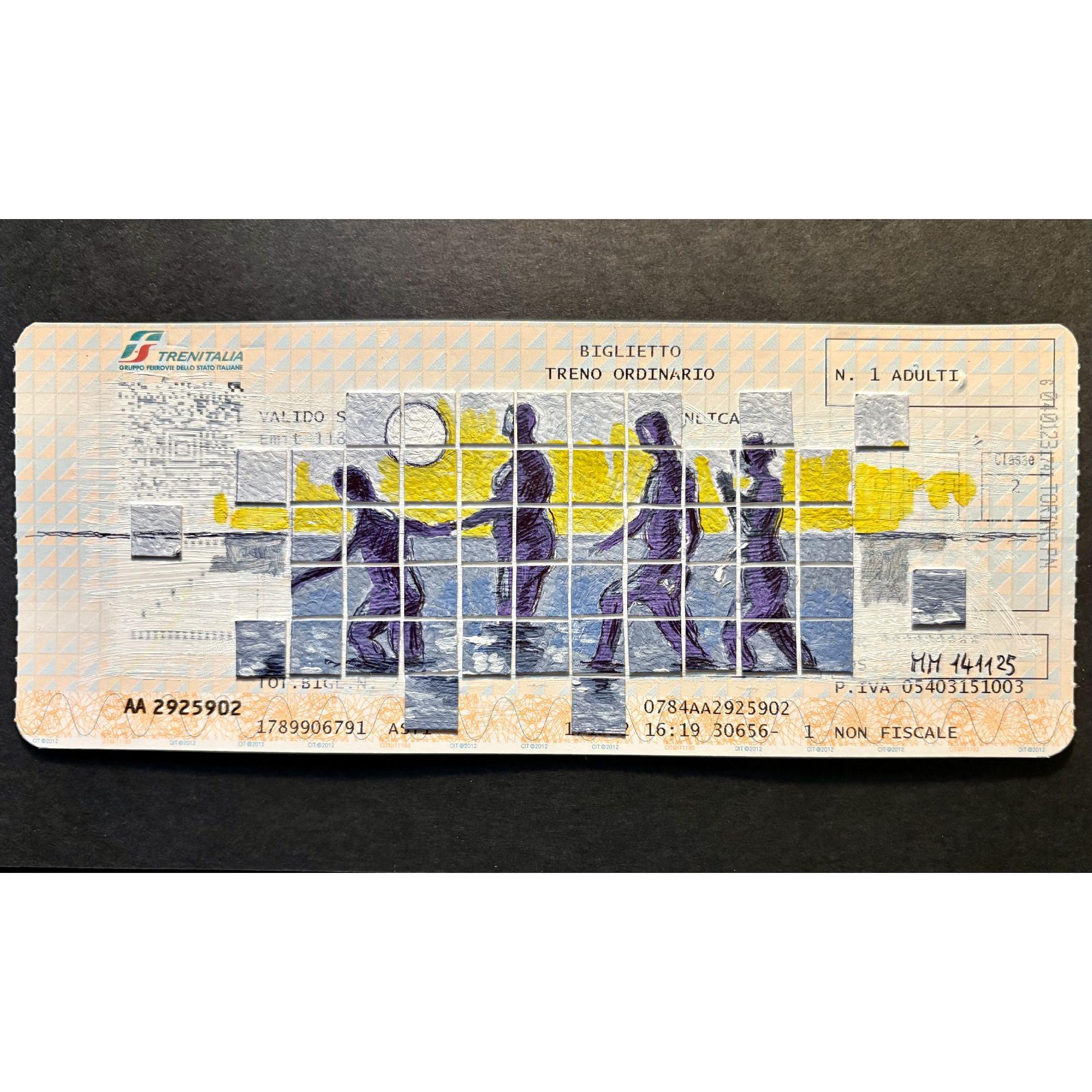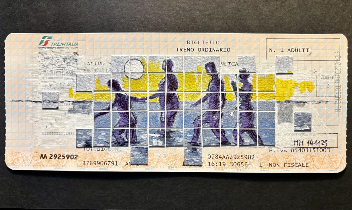 Penna, tempera e collage, Ticket ferroviario, 2025