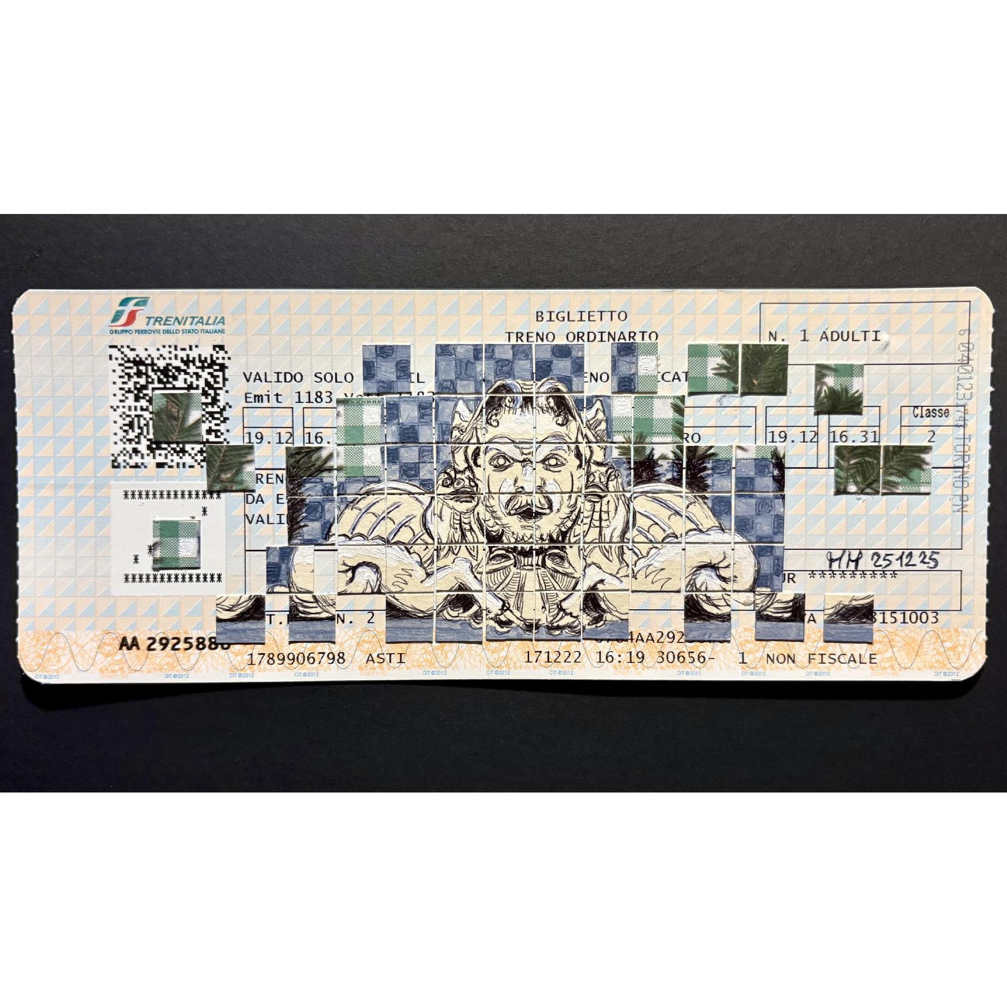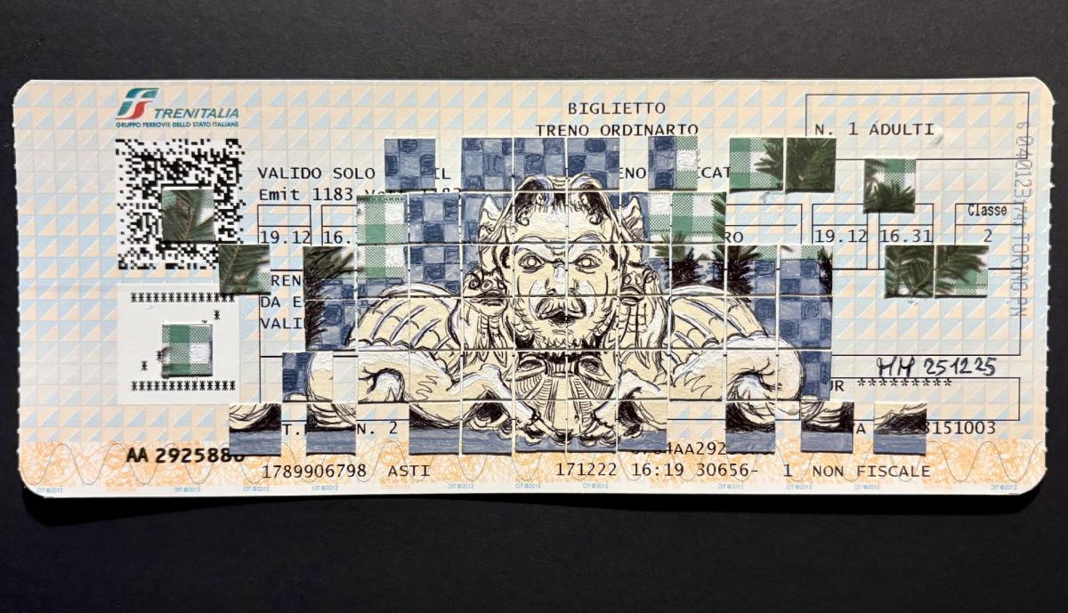 Penna, tempera e collage, Ticket ferroviario, 2025