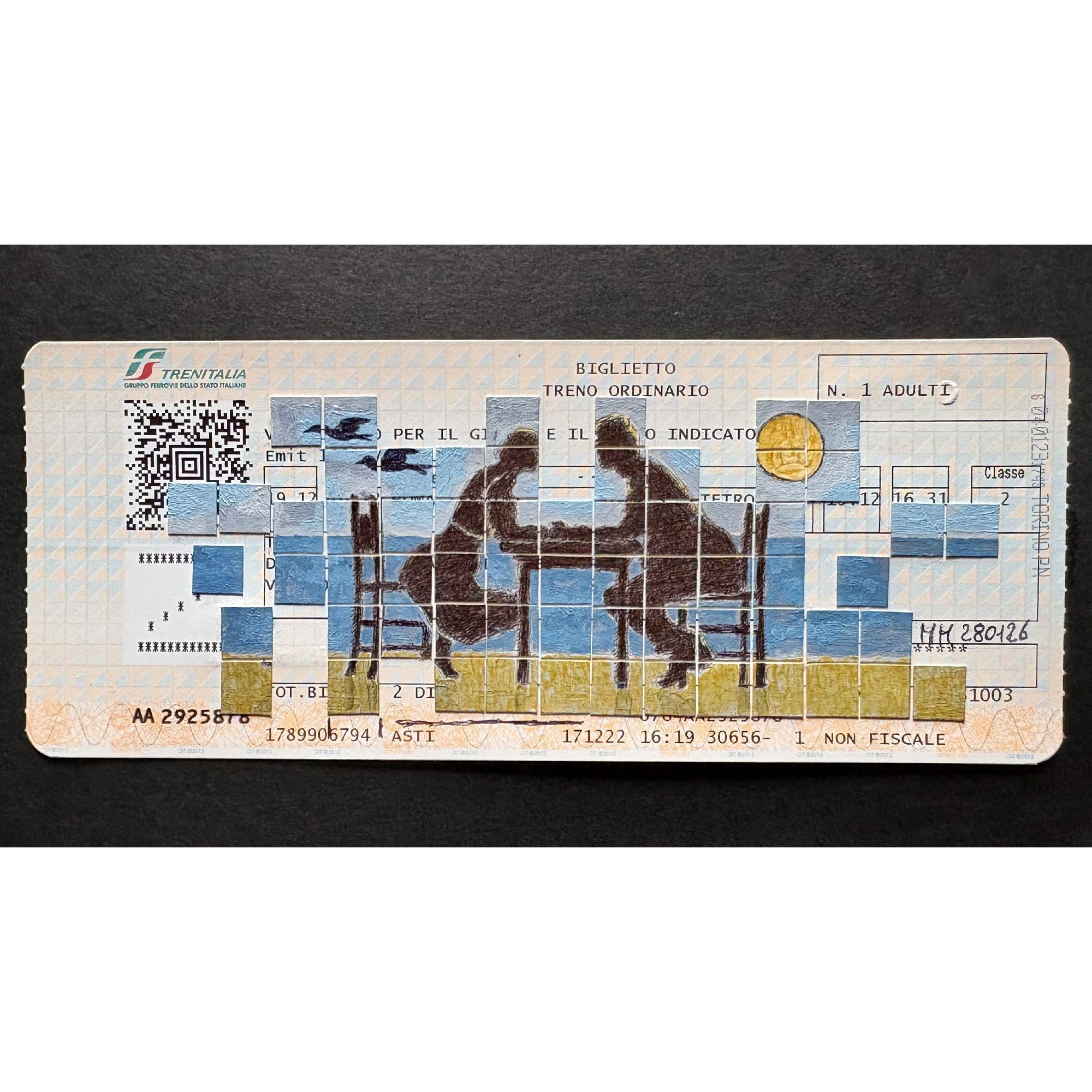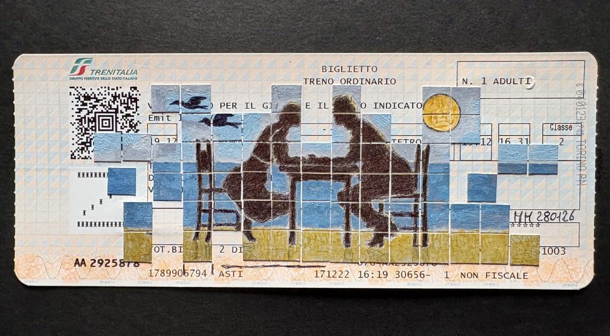 Penna, tempera e collage, Ticket ferroviario, 2026