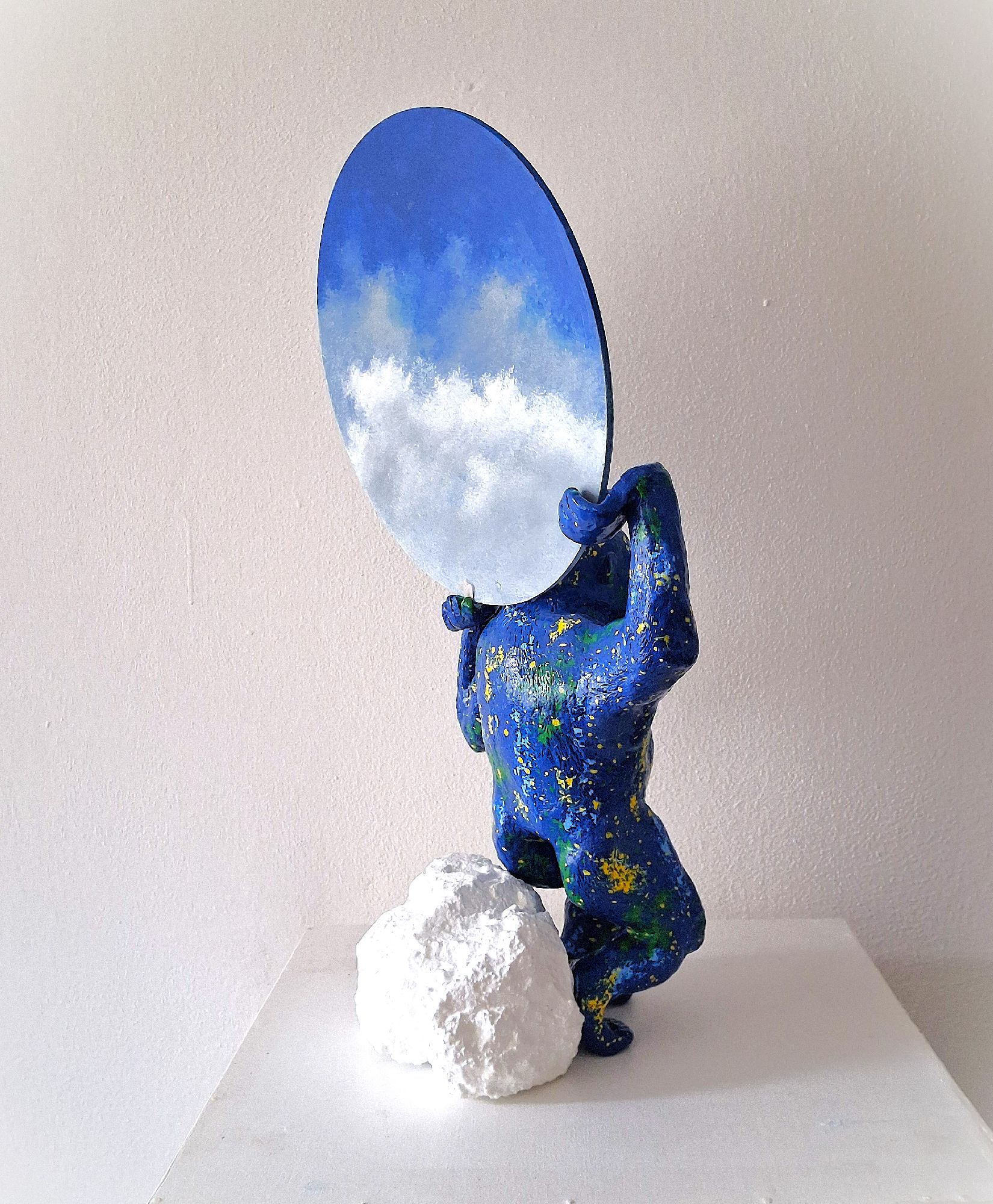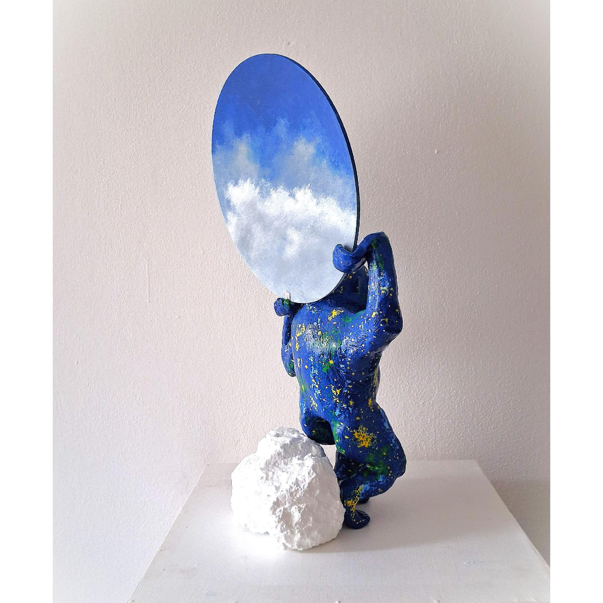 Il disco che solleva – un cielo realistico, luminoso e sospeso – crea un dialogo tra peso e leggerezza, tra materia e immaginazione.Un’opera che cattura lo sguardo e porta con sé una forte presenza scenica, ideale per collezionisti, ambienti moderni, studi creativi o spazi espositivi.