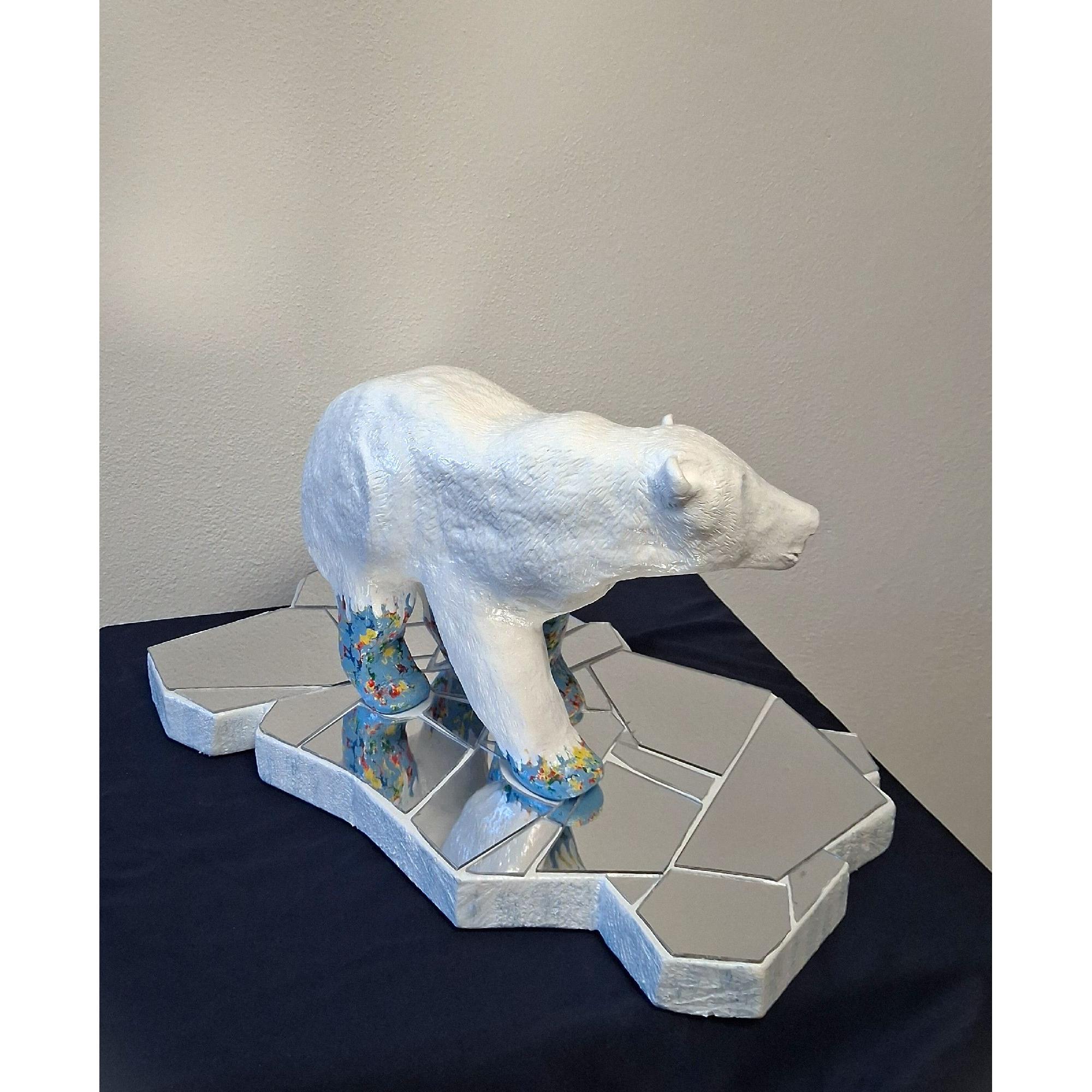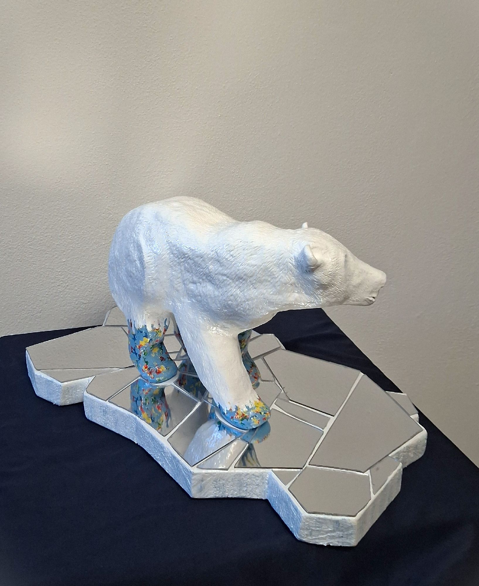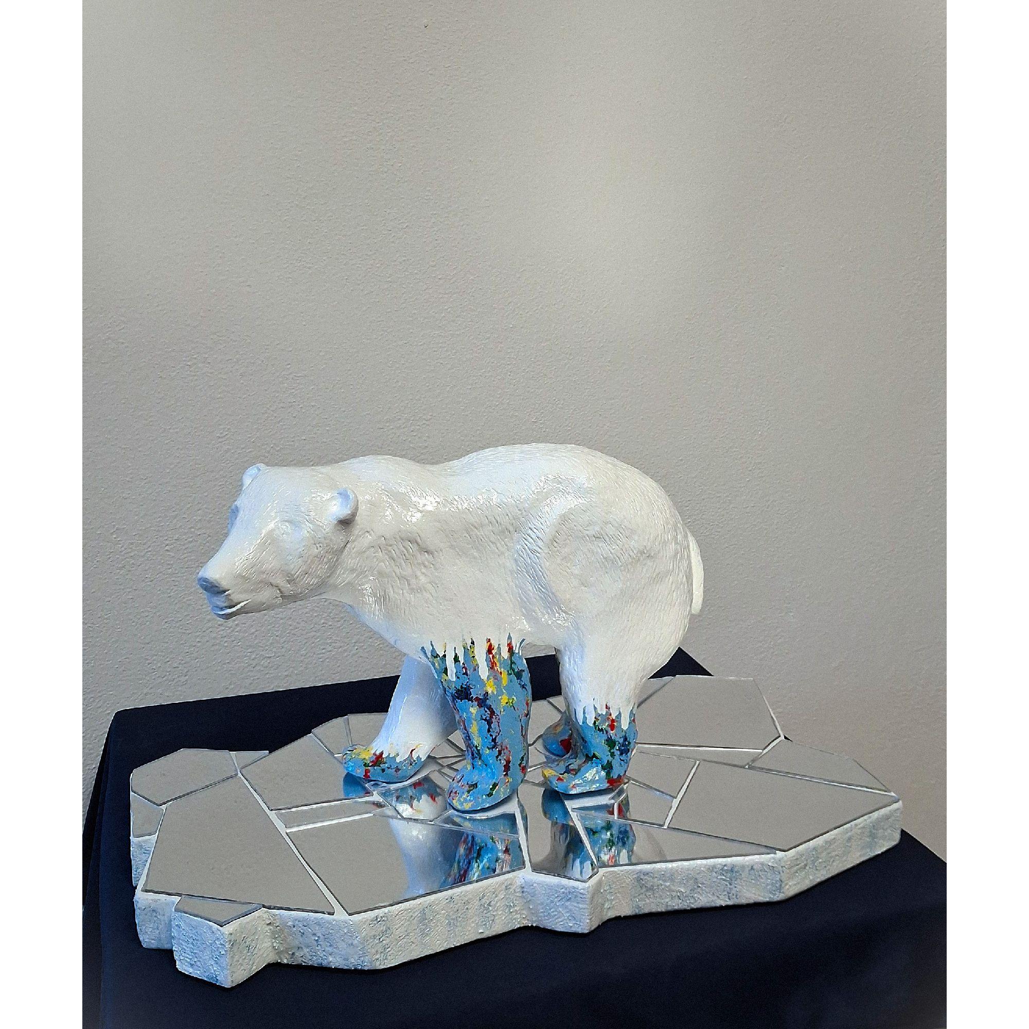 Titolo:Alla deriva.Argilla su specchi.Misure: base cm.23x40. H cm.24.Un orso polare in equilibrio su un frammento di ghiaccio non è solo un’immagine poetica, è il ritratto di un mondo che si assottiglia. Il ghiaccio che si spezza, la deriva, l’incertezza del passo raccontano ciò che il riscaldamento globale sta già cancellando.Questa scultura nasce come un piccolo atto di resistenza. L’argilla diventa memoria di ciò che rischiamo di perdere, ma anche invito a guardare con più attenzione il nostro impatto sul pianeta. L’orso, con le sue tracce di colore, porta addosso i segni del cambiamento: fragili, intensi, inevitabili.È un’opera che parla di responsabilità e di cura. Un promemoria silenzioso che ci ricorda quanto ogni gesto, ogni scelta, possa contribuire a proteggere ciò che non ha voce.