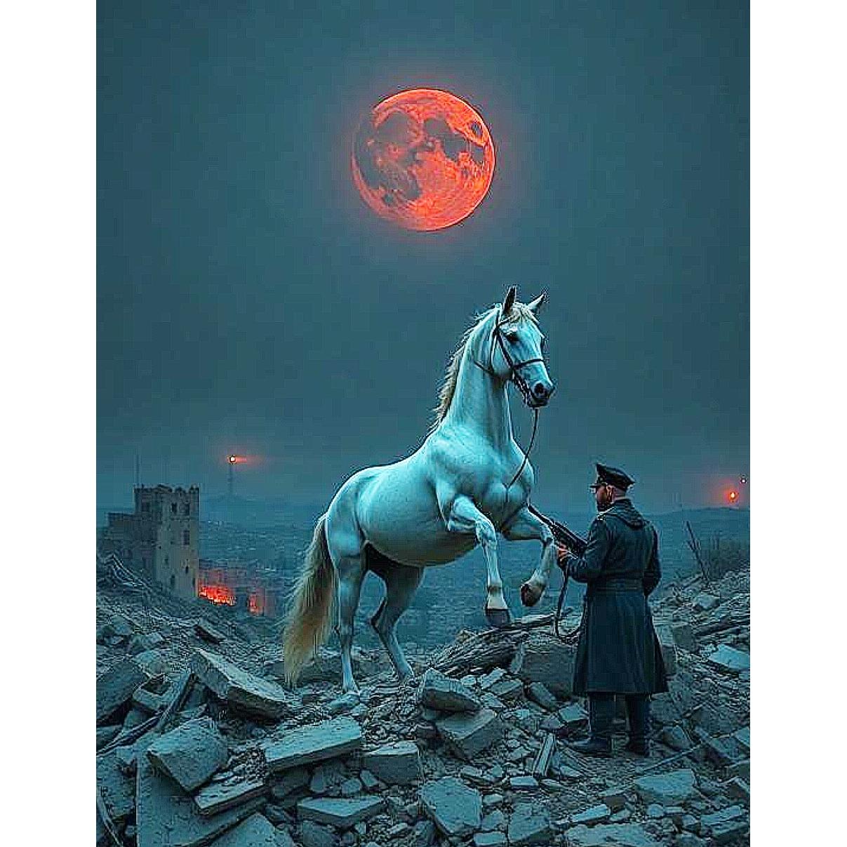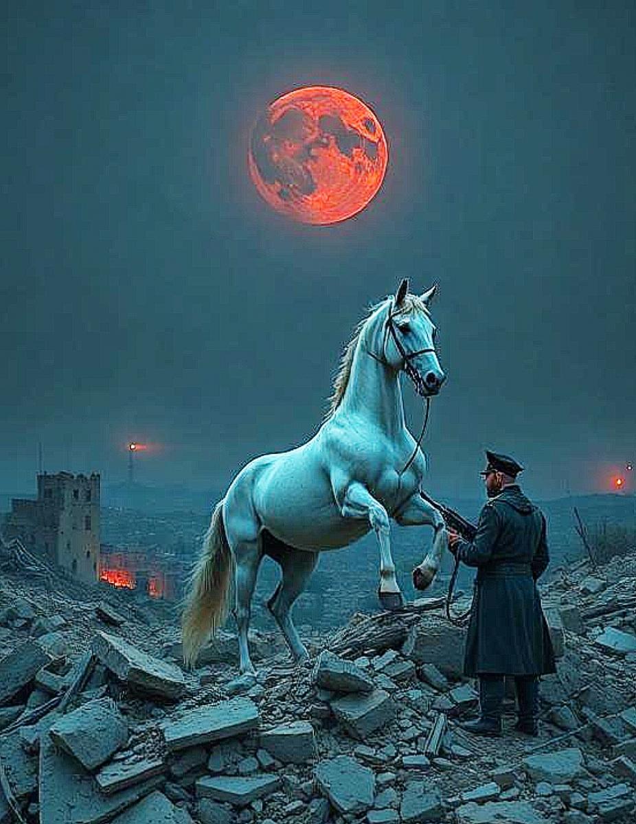 Teatro di guerra. Gaza. Il cavallo bianco impone la sua candida bellezza al soldato armato. Invito alla pace e alla sua bellezza