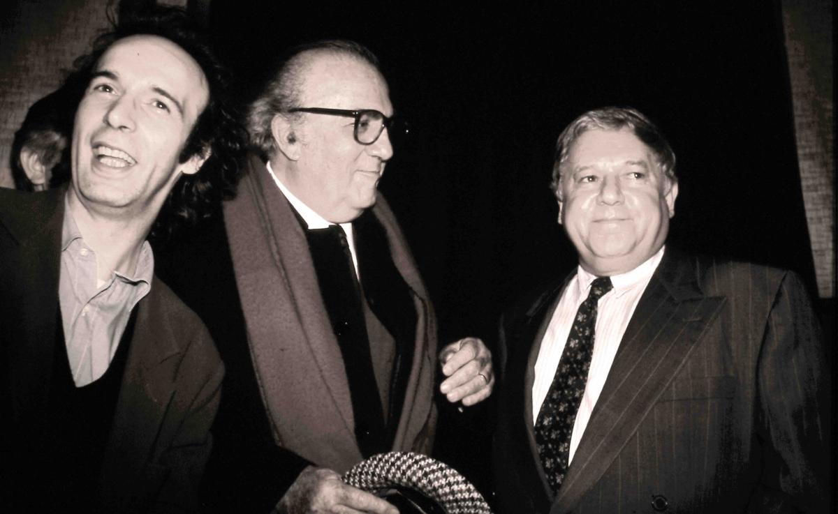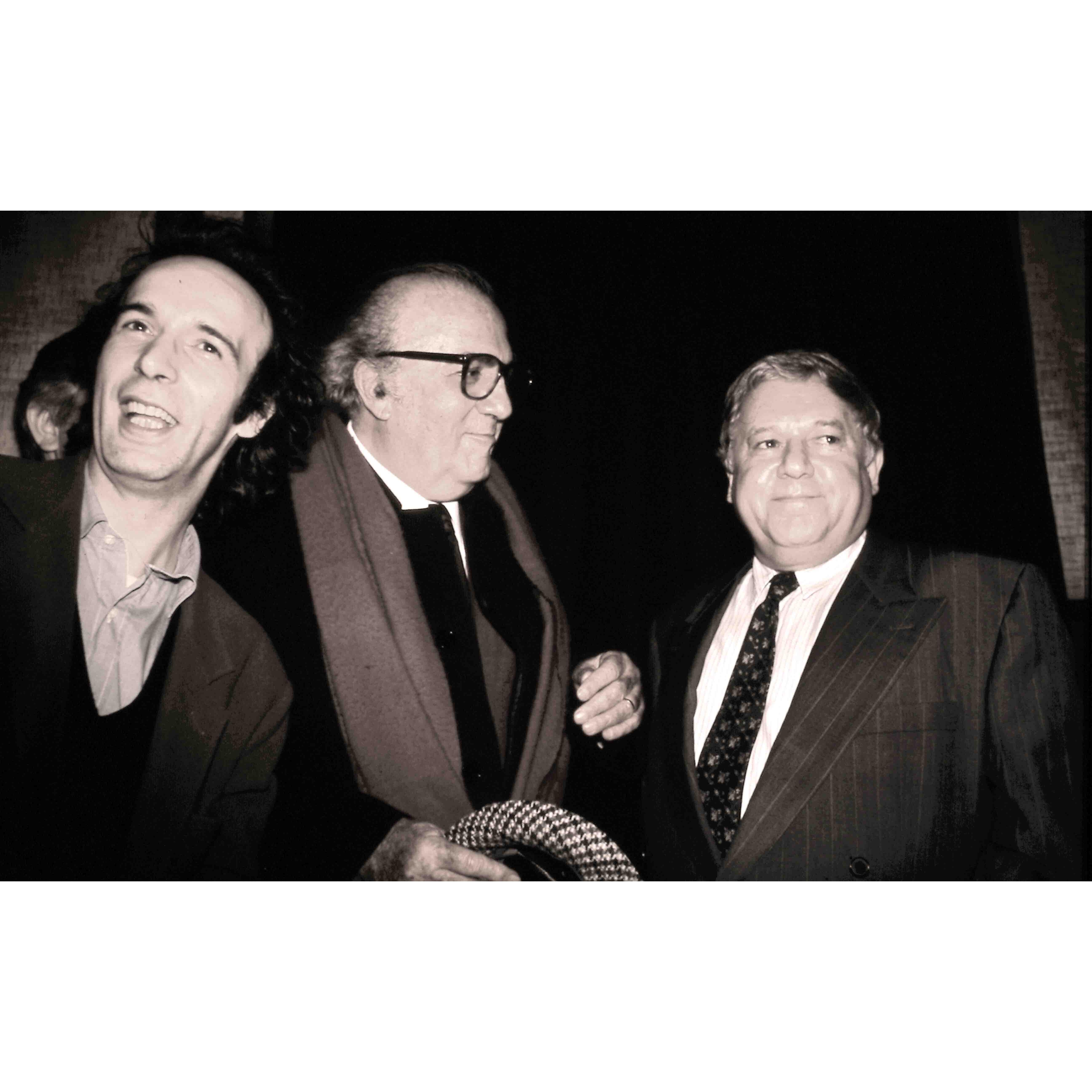Fellini, Benigni e Villagio alla presentazione del film "La voce della luna".