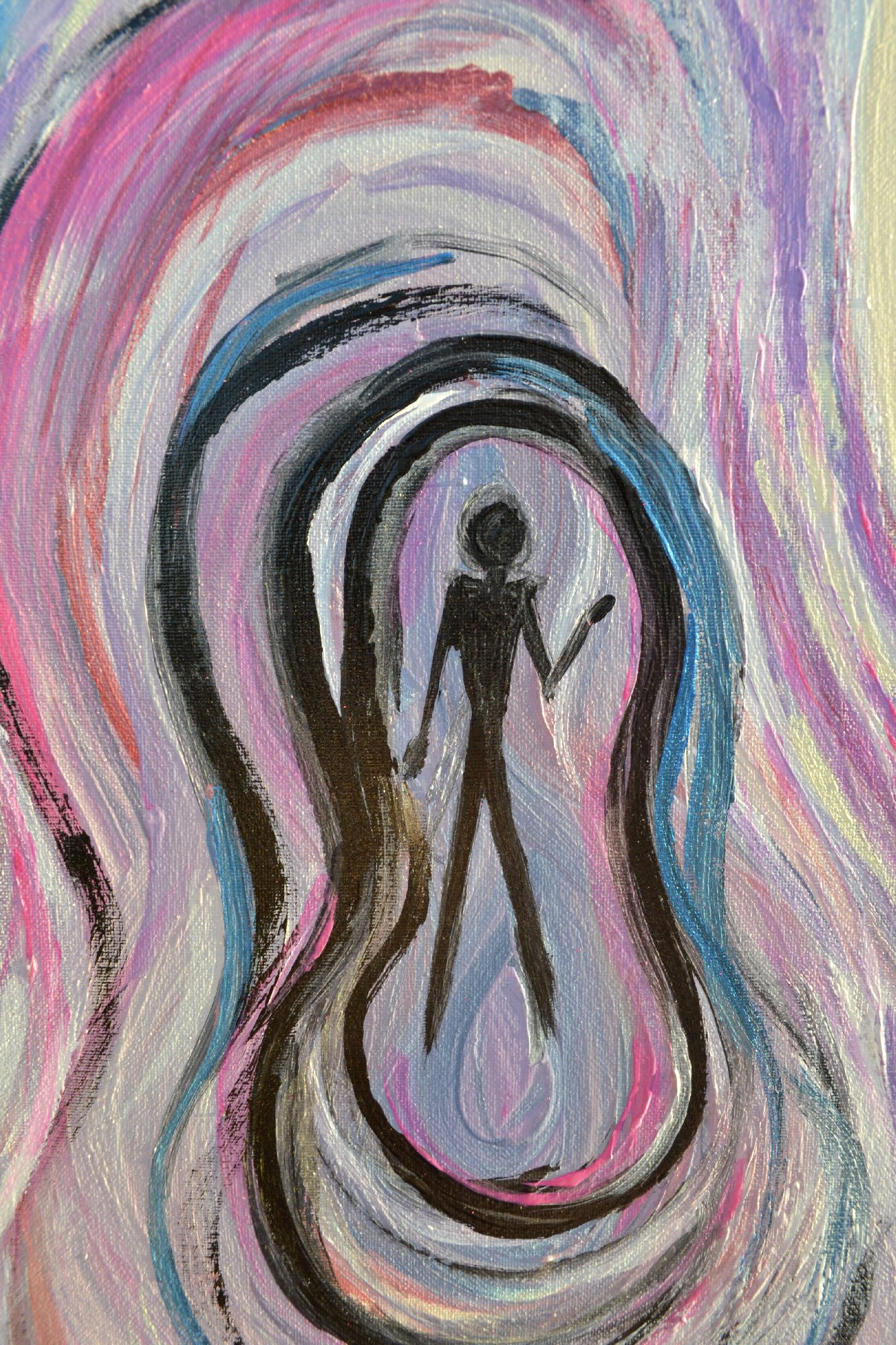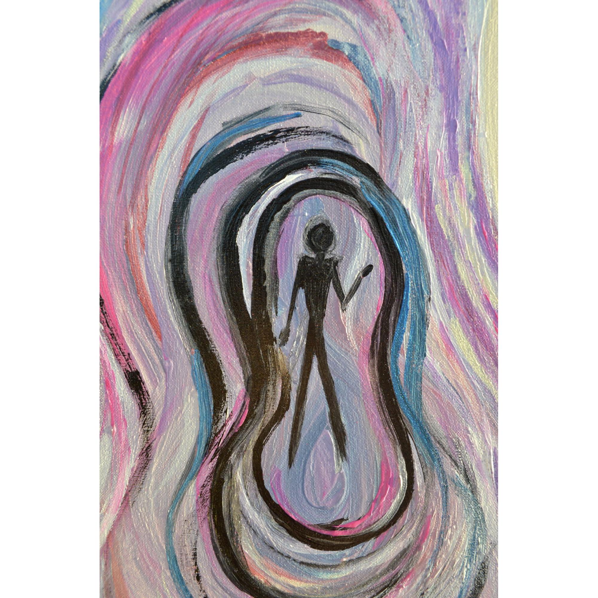 Essere differenti è un viaggio sospeso, un movimento lento dentro una capsula che attraversa il tempo e lo spazio dell’anima. Al centro della tela, una figura nera, senza volto né identità, si staglia come un’ombra universale: un riflesso in cui ognuno può specchiarsi. Attorno a lei, strati di blu e viola si intrecciano come membrane di luce e introspezione, evocando l’intimo, il segreto, l’essenza stessa dell’essere. Lo sfondo di un giallo etereo, quasi vibrante di vuoto, dilata lo spazio e ci proietta in un universo sospeso, infinito e immaginifico. Un pattern delicato, che si ripete con leggerezza, abbraccia la figura e sembra scandire un ritmo segreto: quello di un tempo interiore che si ripete e si trasforma, silenzioso e potente. L’opera non racconta una storia definita: invita piuttosto a perdersi nella propria riflessione, a riconoscersi nell’ombra e nei colori, a contemplare l’essere come esperienza al contempo personale e universale.