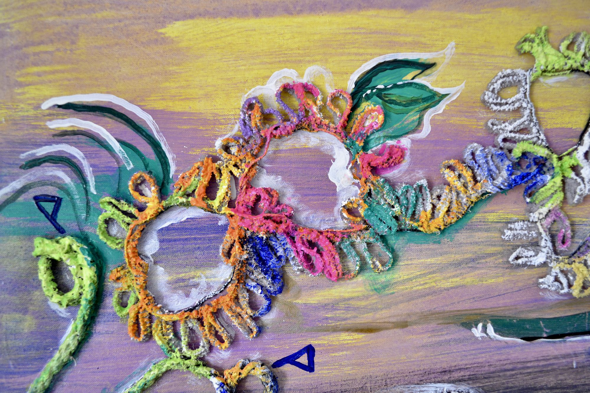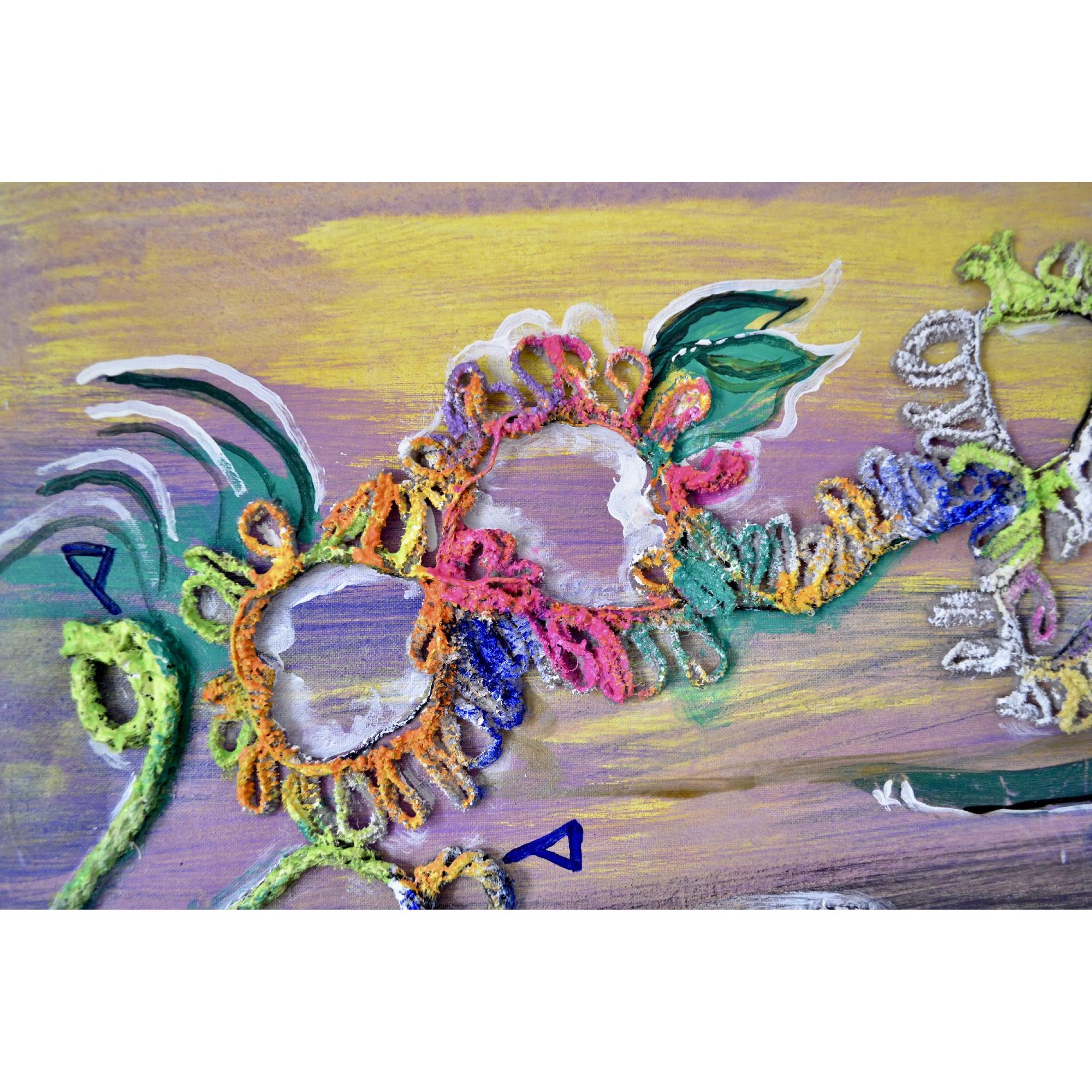 Ma Vie questa opera racchiude la molteplicità dei sentimenti vissuti dall’artista. La matericità del lavoro conferisce rilievo e presenza, mentre la varietà dei fili utilizzati diventa strumento espressivo: ogni filo racconta, anzi dà forma, ai diversi periodi che hanno segnato e contraddistinto questa vita.