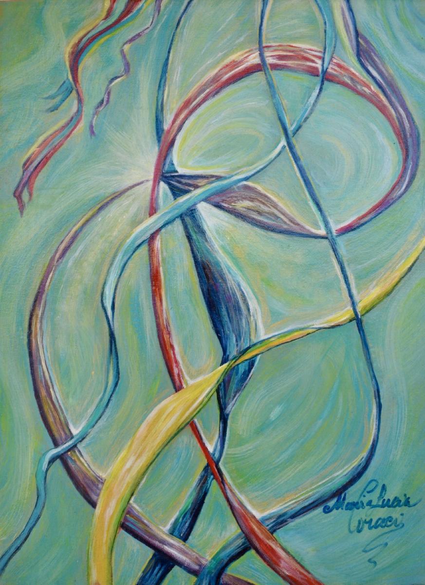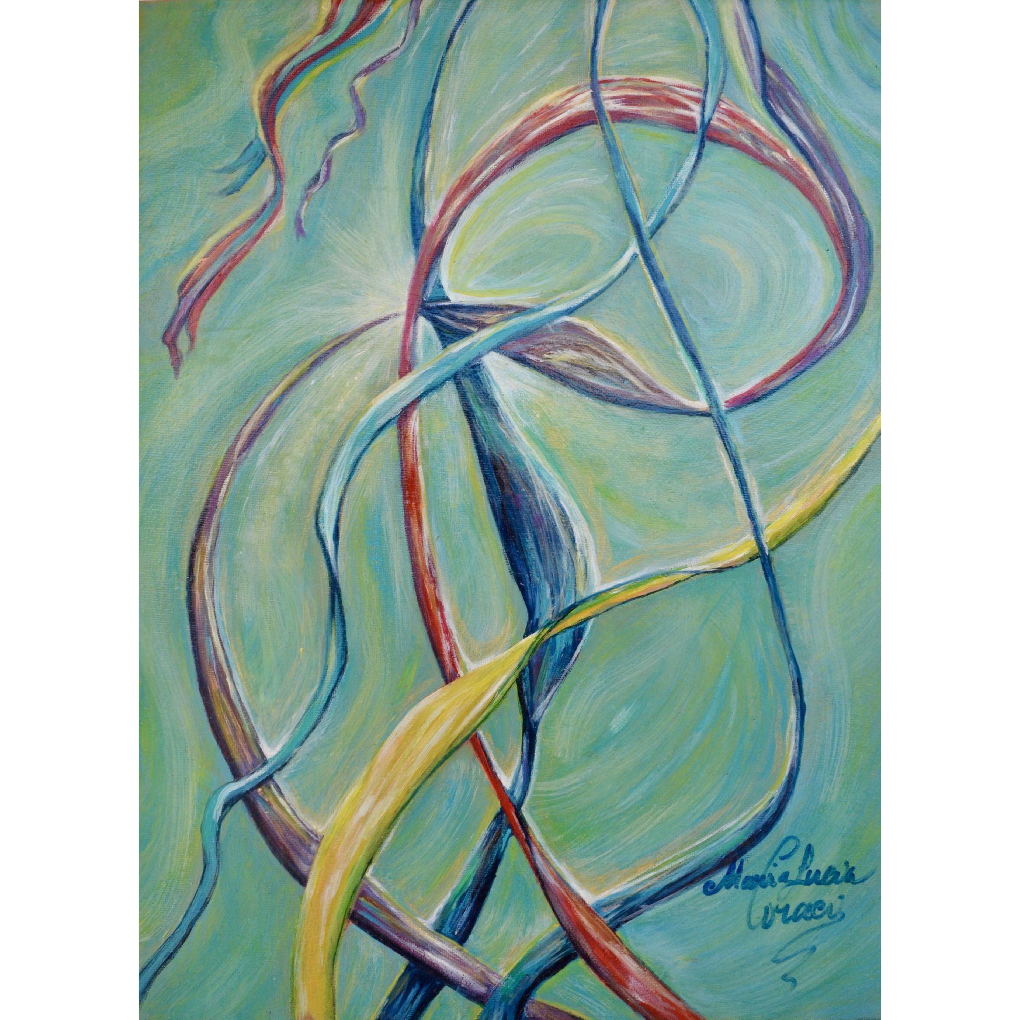 Nastri al vento. L’elegante rappresentazione sboccia in una giornata soleggiata, quando il vento leggero accarezza l’aria e i nastri, sospinti da questa brezza gentile, si lasciano muovere liberamente. Nel loro movimento si intrecciano geometrie policromatiche, che danzano tra luce e ombra, creando un ritmo visivo delicato e armonioso. Ogni piega, ogni curva dei nastri sembra raccontare una storia di leggerezza e di libertà, un’armonia sospesa tra natura e immaginazione, dove il colore diventa ritmo e il movimento poesia.