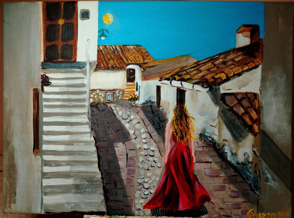 L'opera "La via del pane" rappresenta una felice sintesi tra la narrazione figurativa tradizionale e una sensibilità cromatica moderna e vibrante.Analisi Stilistica e Critica. Il Simbolismo del Cammino: La figura femminile, colta di spalle mentre risale la china, diventa metafora del percorso vitale e della ricerca delle radici. Il suo incedere verso l'alto conferisce alla composizione una tensione ascendente e spirituale.L'Espressionismo del Colore: L'uso del rosso puro per l'abito è una scelta audace che rompe la staticità del borgo, trasformando il soggetto in un cuore pulsante di energia e passione. Questo contrasto con l'azzurro zenitale del cielo crea un'armonia cromatica di forte impatto visivo.Architettura e Memoria: La rappresentazione del borgo, con le sue scale irregolari e i tetti in tegole, non è una semplice veduta paesaggistica, ma una ricostruzione poetica della memoria rurale. Le mura, rese con una stesura materica e densa, sembrano conservare il calore del sole e la storia delle generazioni passate.Luce e Atmosfera: La presenza dell'astro dorato in un cielo privo di nuvole suggerisce un tempo sospeso, quasi mitologico, che giustifica il titolo evocativo. Il "pane" non è mostrato, ma è evocato dalla terra, dalle case e dalla fatica quotidiana suggerita dalla salita.
