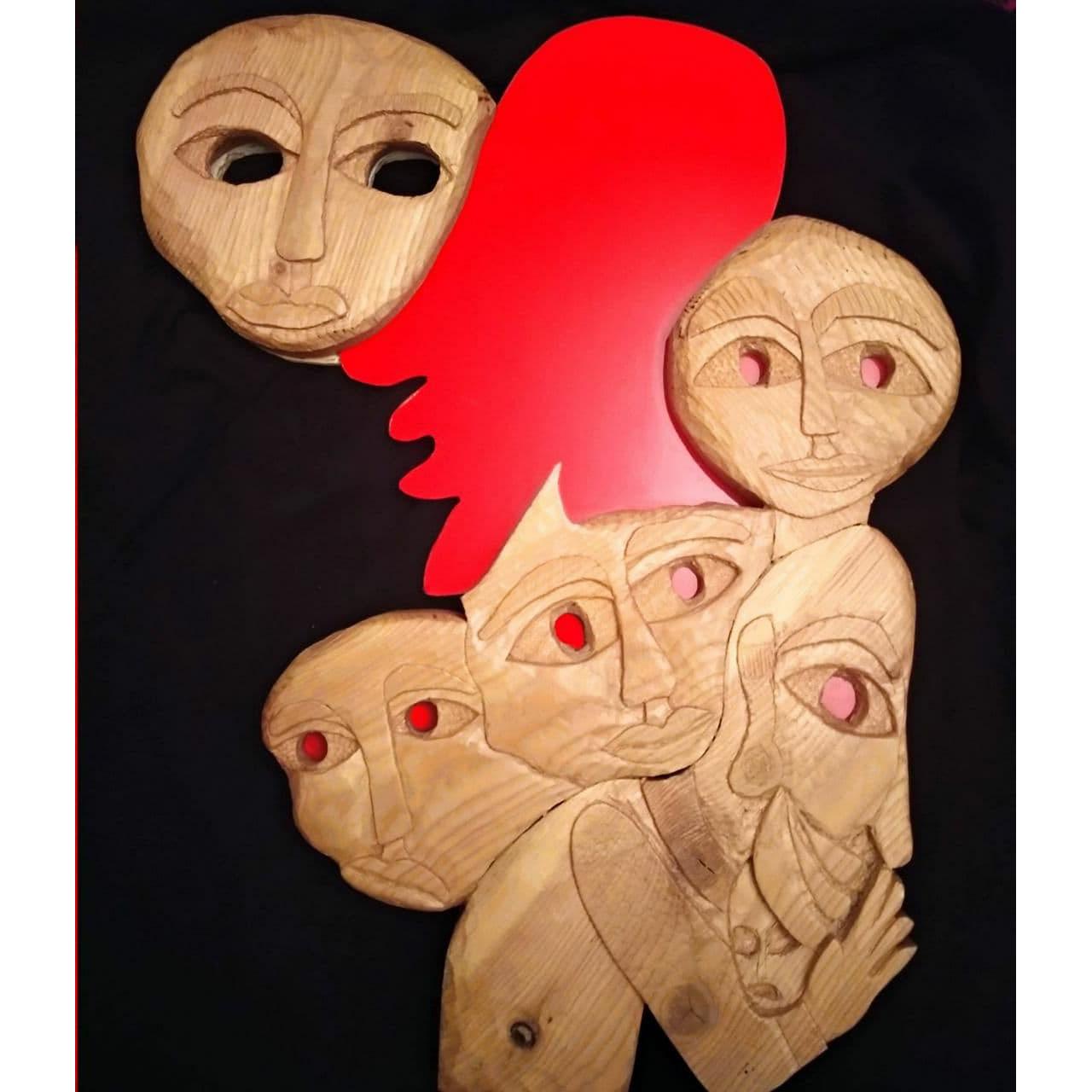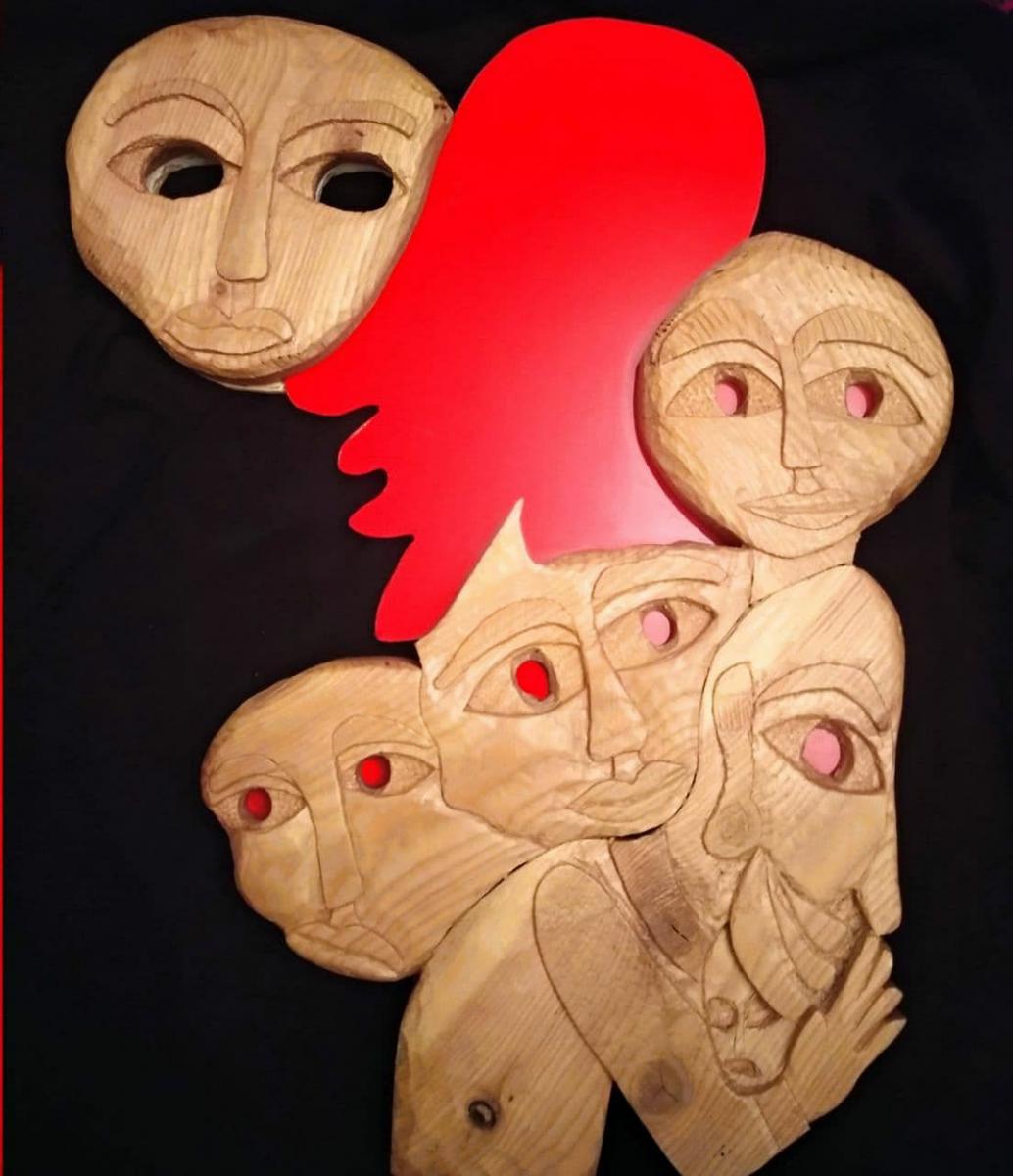 Scultura lignea in pino cembro realizzata in tre pezzi e con una testa di profilo in plexiglass rosso inserito tra le sculture in legno e fissate tramite un pannello posteriore di legno con chiodi e colla.