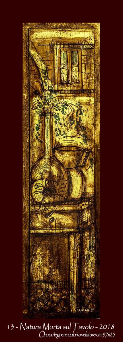 13 - Natura Morta sul Tavolo - 2018 - Oro su legno antico e colori a velature cm. 97x25