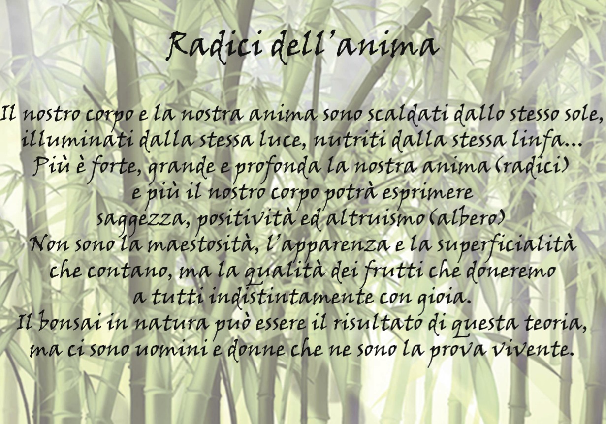 Il nostro corpo e la nostra anima sono scaldati dallo stesso sole. Illuminati dalla stessa luce, nutriti dalla stessa linfa…Più è forte, grande e profonda la nostra anima (radici) e più il nostro corpo potrà esprimere saggezza, positività e altruismo (albero). Non sono la maestosità, l'apparenza e la superficialità che contano, ma la qualità dei frutti che doneremo a tutti indistintamente con gioia. Il bonsai in natura può essere il risultato di questa teoria,ma ci sono uomini e donne che ne sono la prova vivente.