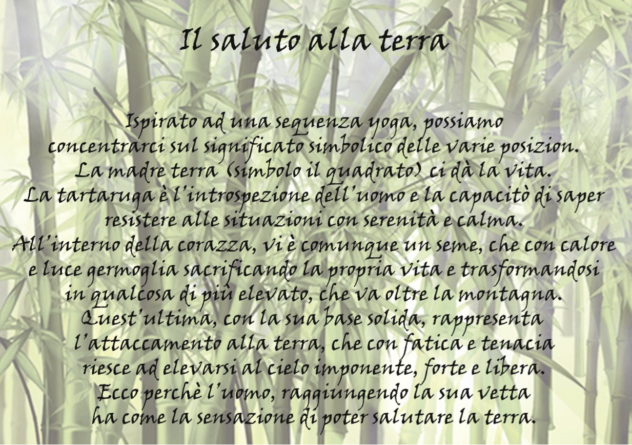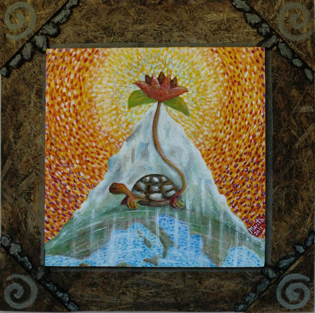 acrilico, tecnica mista, telaIspirato ad una sequenza yoga, possiamo concentrarci sul significato simbolico delle varie posizioni. La madre terra (simbolo il quadrato) ci dà la vita. La tartaruga è l'introspezione dell'uomo e la capacitò di saper resistere alle situazioni con serenità e calma. All'interno della corazza vi è comunque un seme, che con calore e luce germoglia, sacrificando la propria vita e trasformandosi in qualcosa di più elevato, che va oltre la montagna. Quest'ultima con la sua base solida rappresenta l'attaccamento alla terra, che con fatica e tenacia riesce ad elevarsi al cielo. Imponente, forte e libera. Ecco perché l'uomo, raggiungendo la sua vetta, ha come la sensazione di poter salutare la terra.