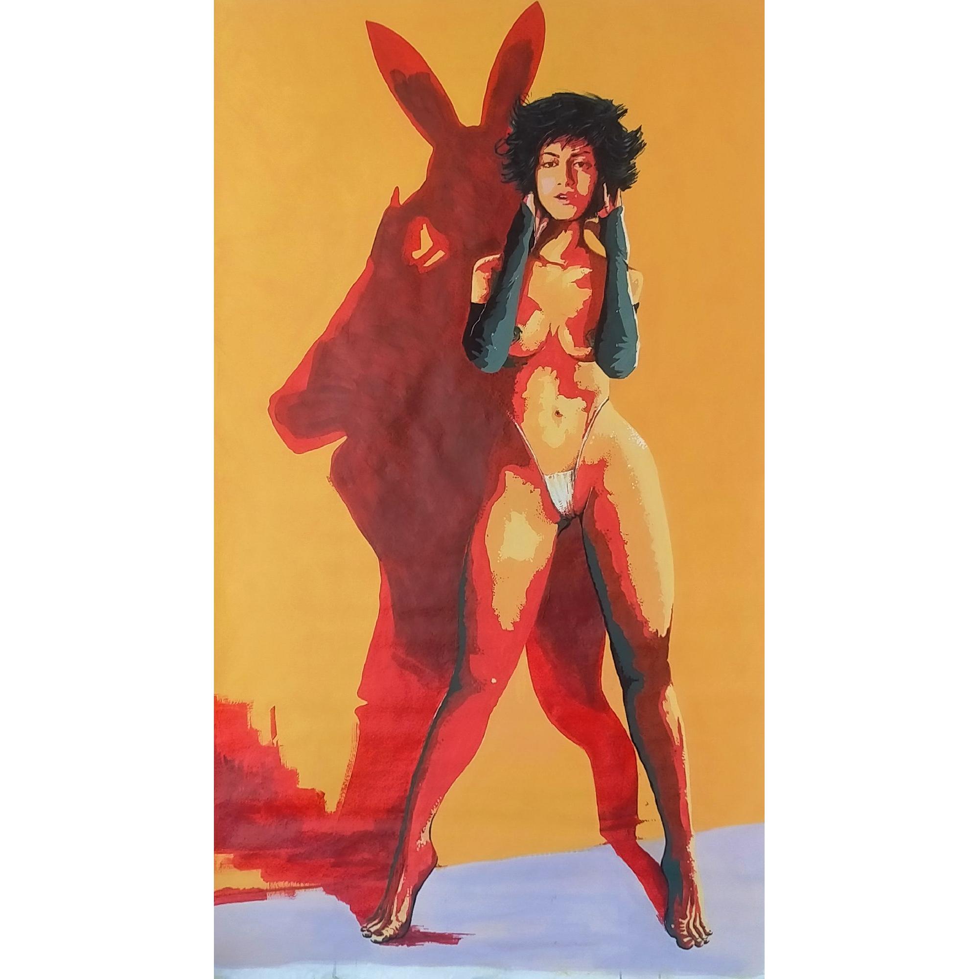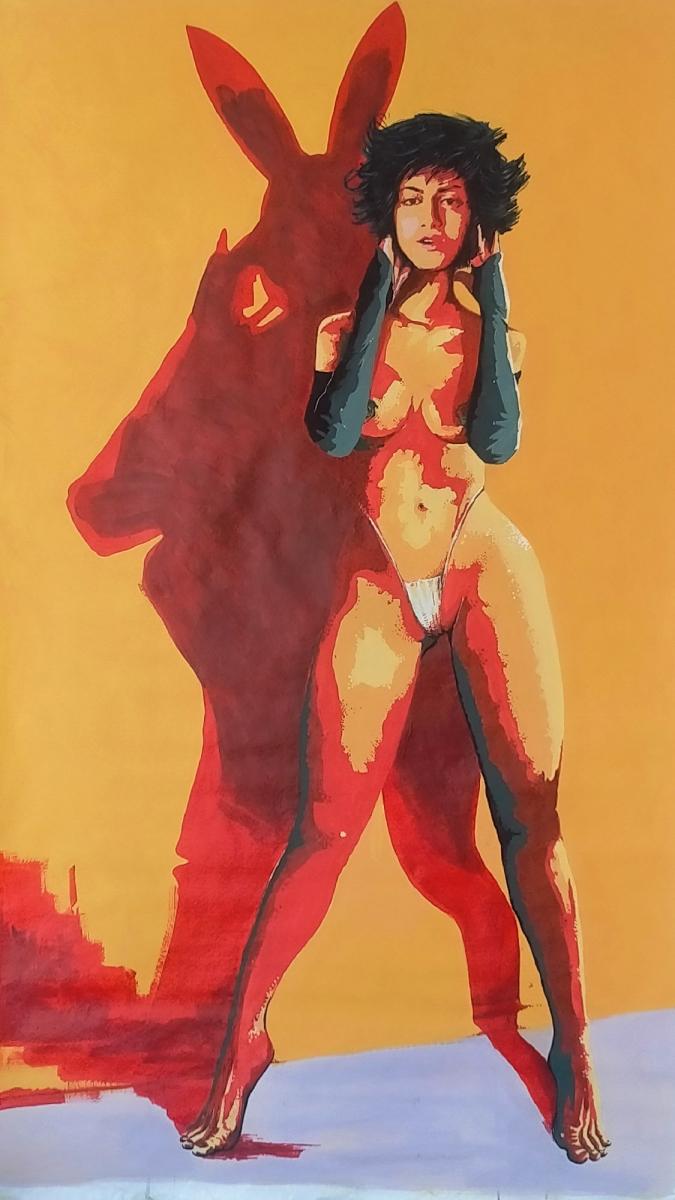 Il dittico indaga la rappresentazione del femminile attraverso una doppia figura speculare, simile nella postura ma dissonante nell’apparato simbolico dell’abbigliamento. L’intervento della luce — elemento apparentemente rivelatore — produce un cortocircuito percettivo: le ombre generate non appartengono ai corpi da cui sembrano scaturire. Le due donne paiono essersi scambiate le rispettive proiezioni, generando uno slittamento identitario che disorienta lo sguardo e ne mette in crisi la logica interpretativa.