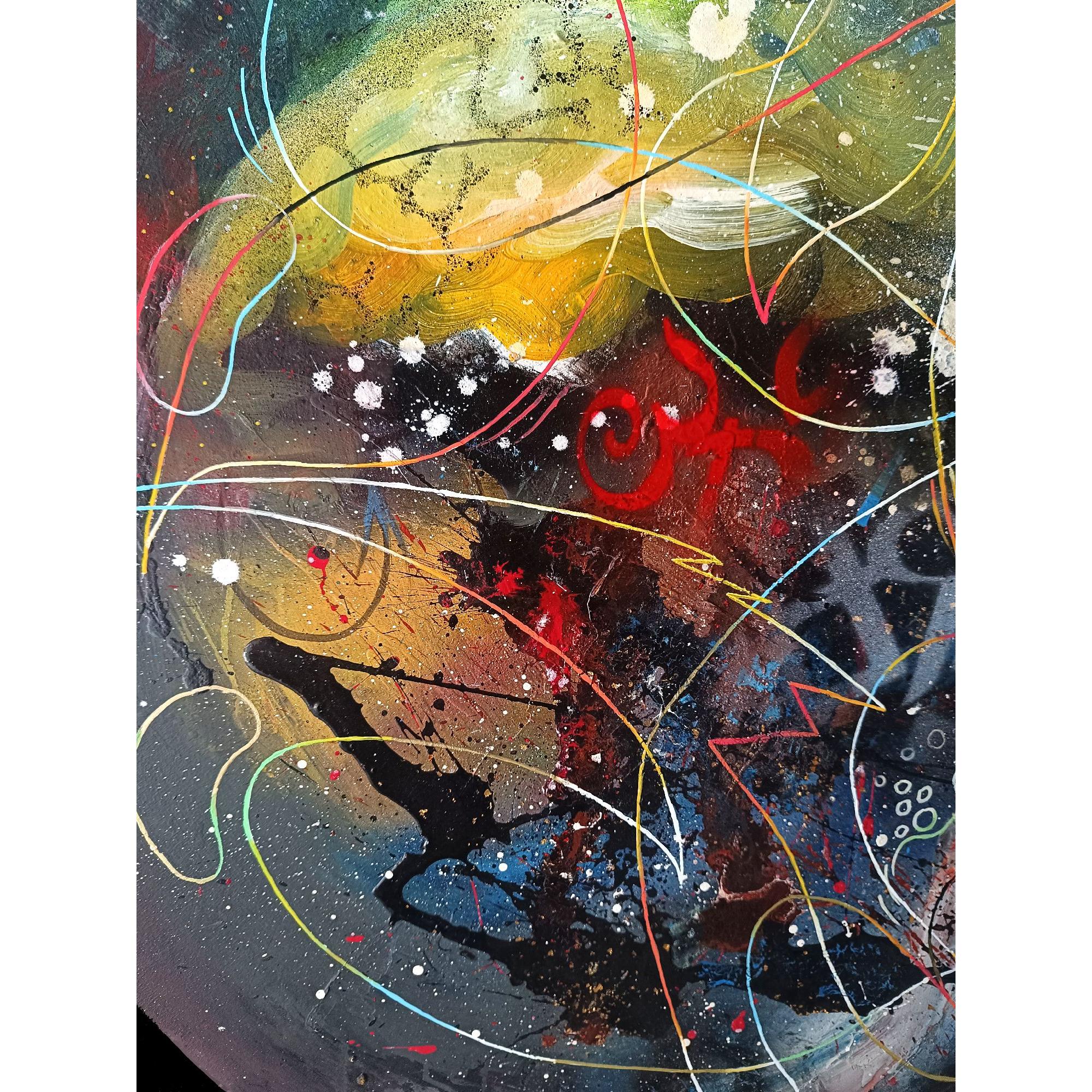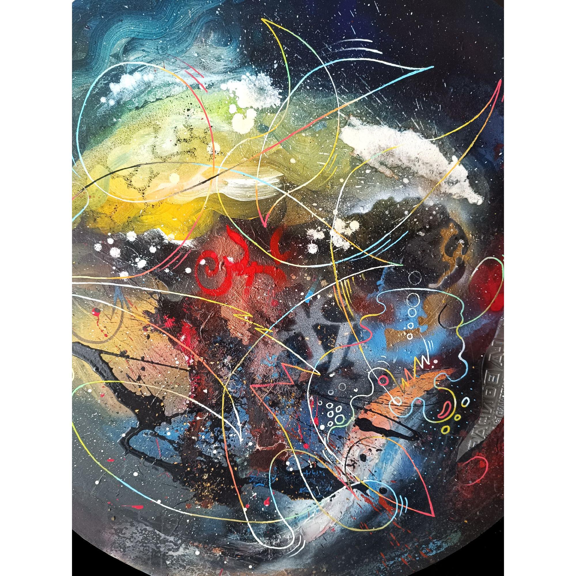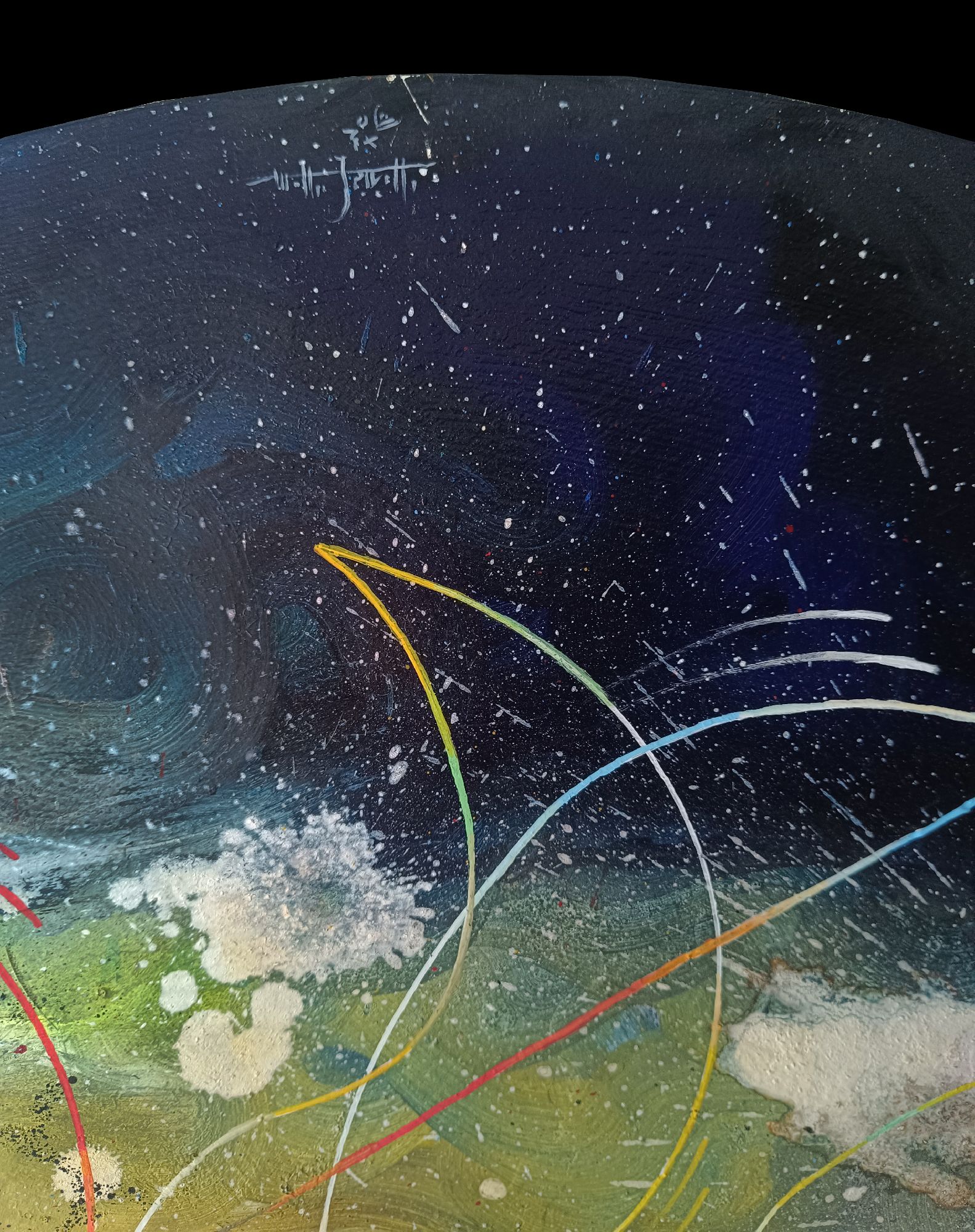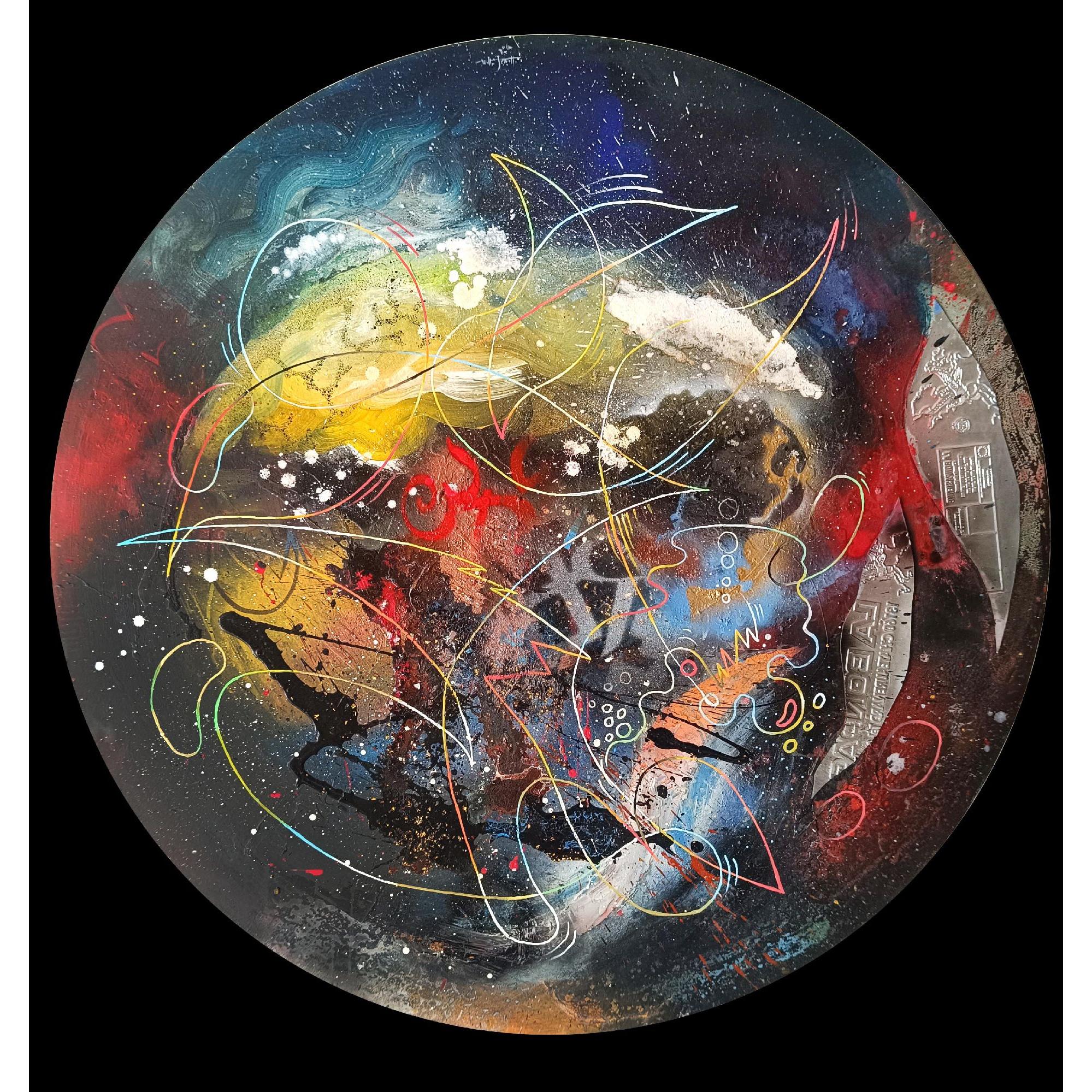 Un viaggio nel cuore del cosmo, dove materia e energia si fondono in un equilibrio dinamico. Le traiettorie luminose attraversano la superficie come orbite segrete, intrecciandosi con campi di colore che vibrano di vita. L’opera è una visione planetaria, un universo pulsante in cui caos e armonia convivono, invitando lo spettatore a immergersi nella potenza creatrice dell’infinito.