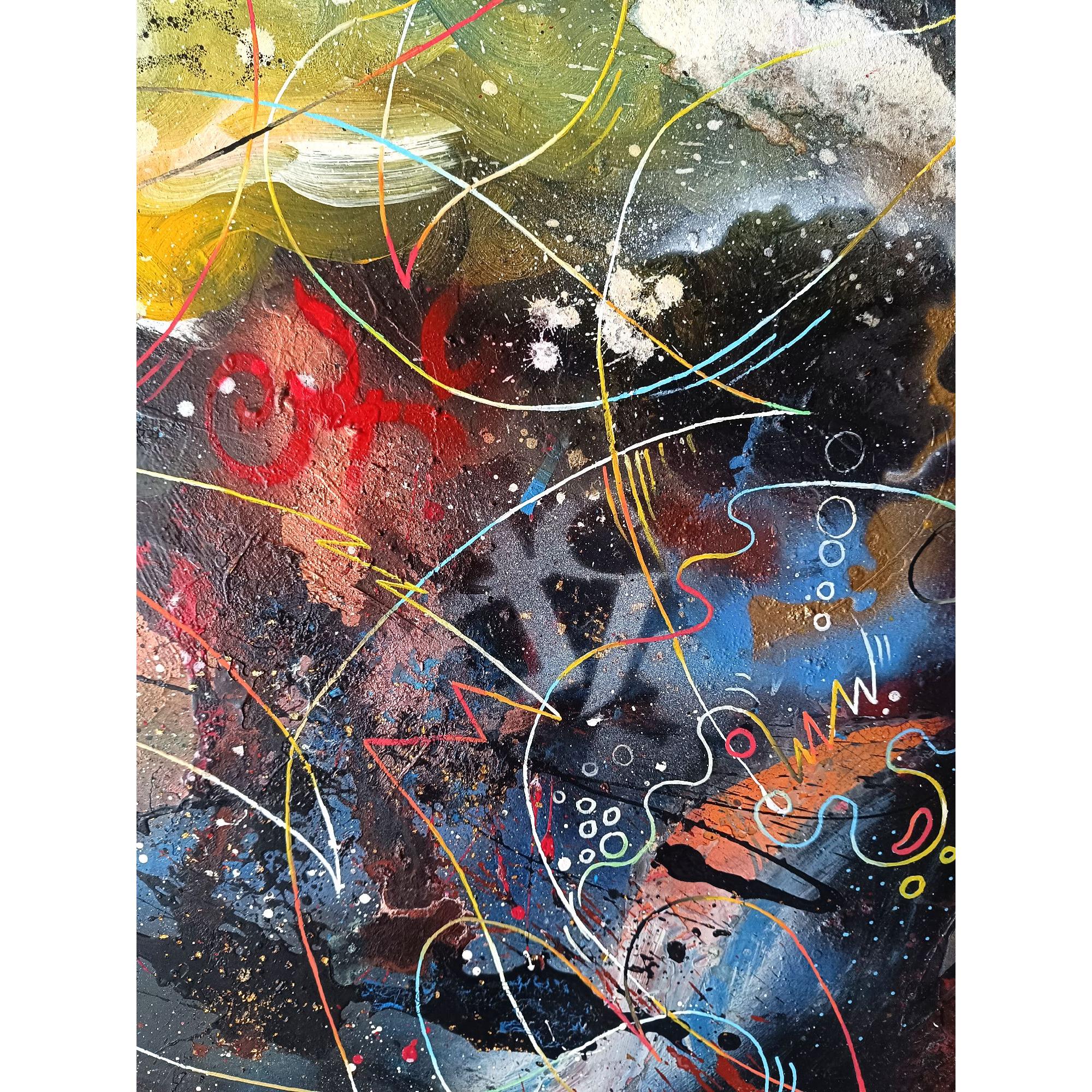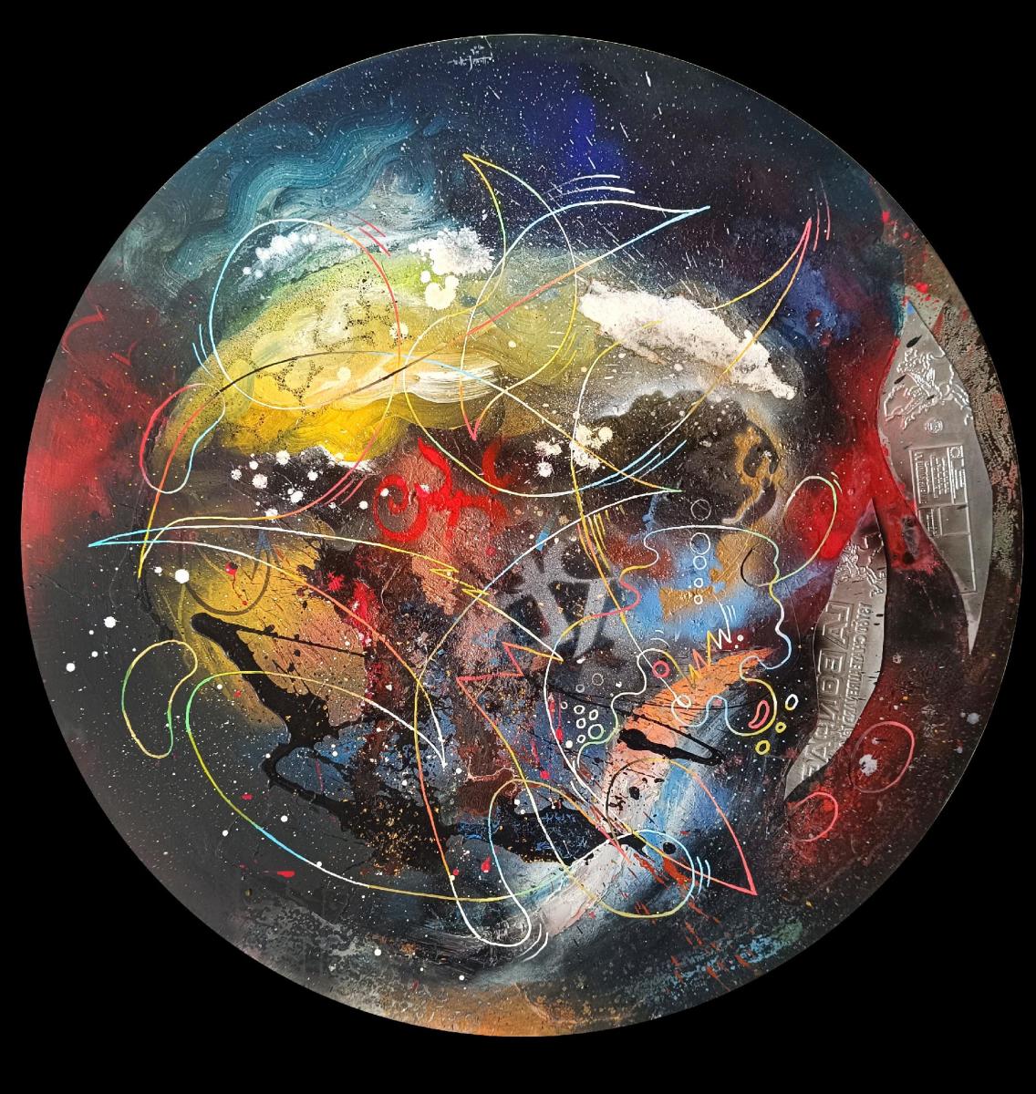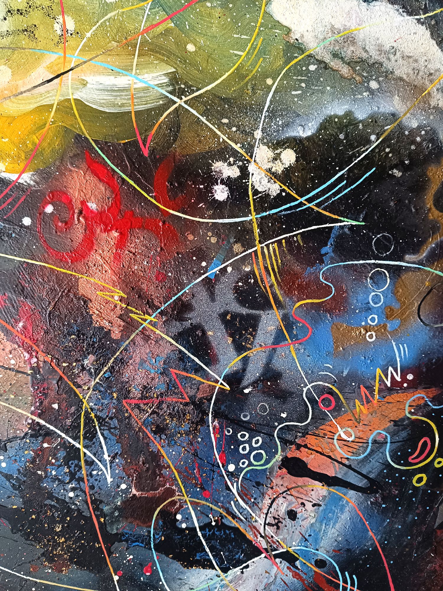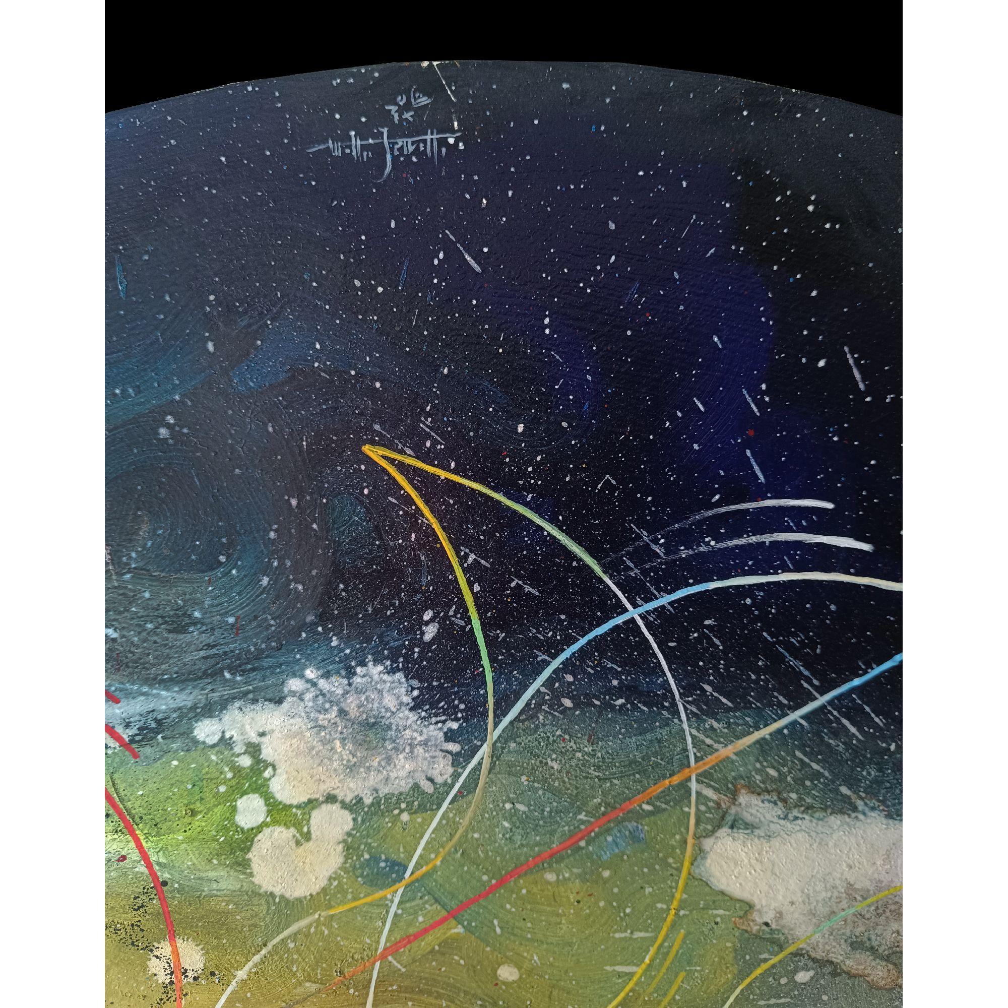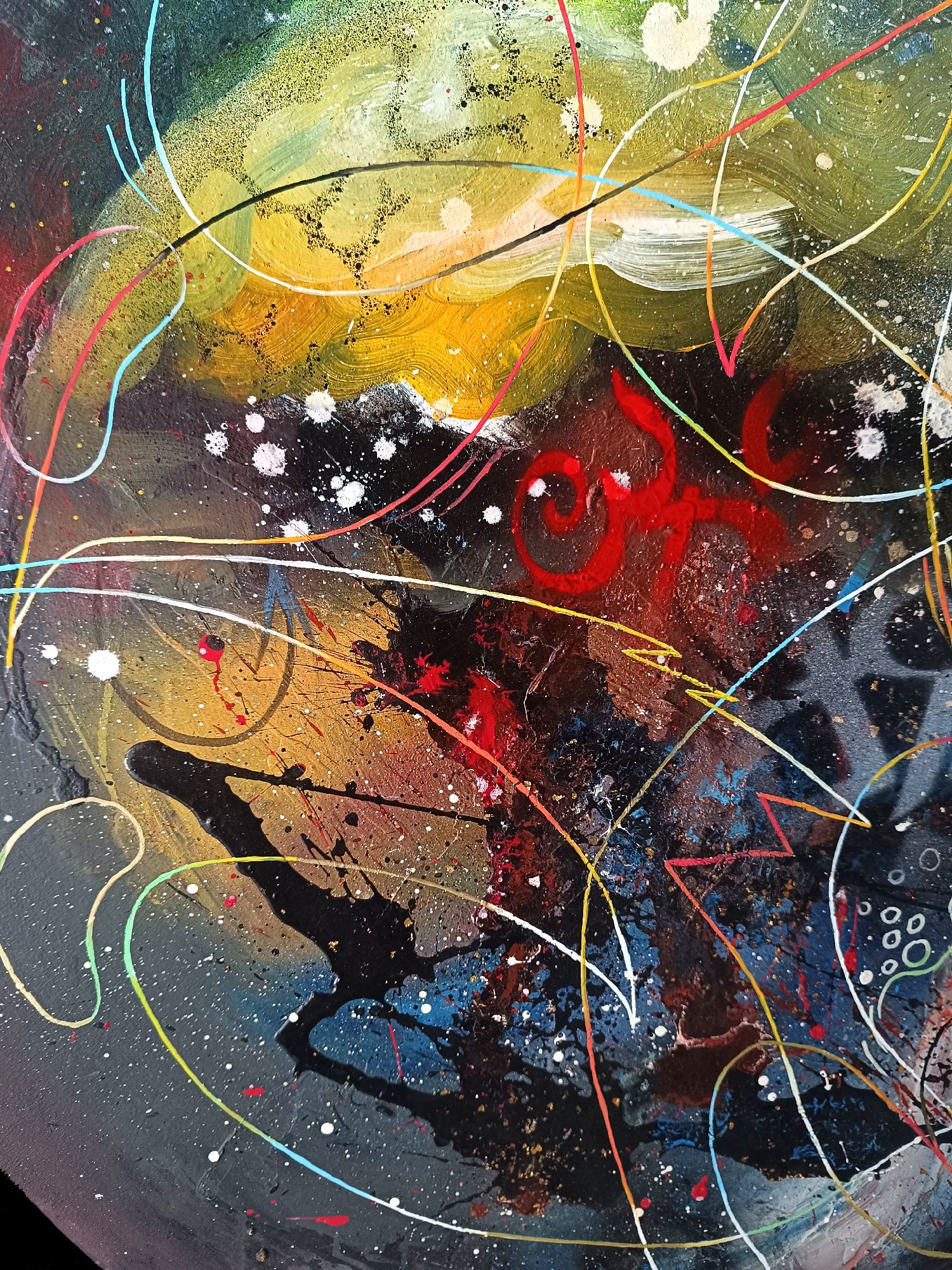 Un viaggio nel cuore del cosmo, dove materia e energia si fondono in un equilibrio dinamico. Le traiettorie luminose attraversano la superficie come orbite segrete, intrecciandosi con campi di colore che vibrano di vita. L’opera è una visione planetaria, un universo pulsante in cui caos e armonia convivono, invitando lo spettatore a immergersi nella potenza creatrice dell’infinito.
