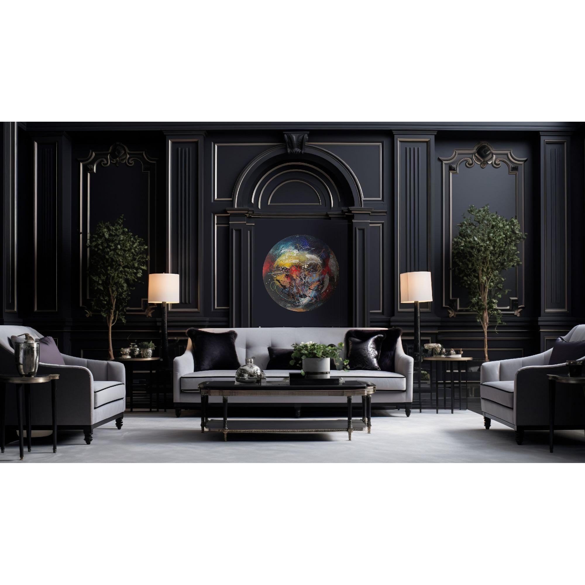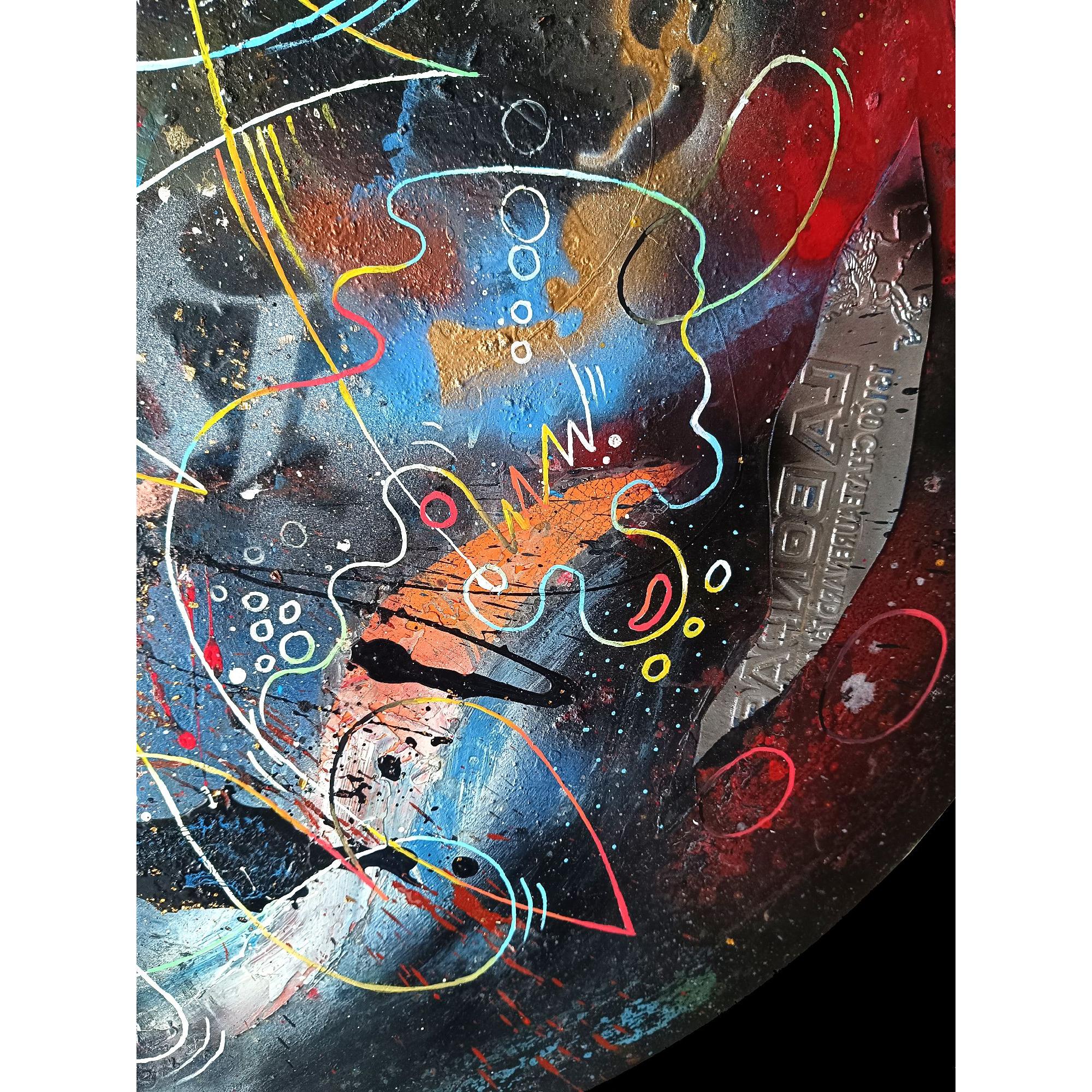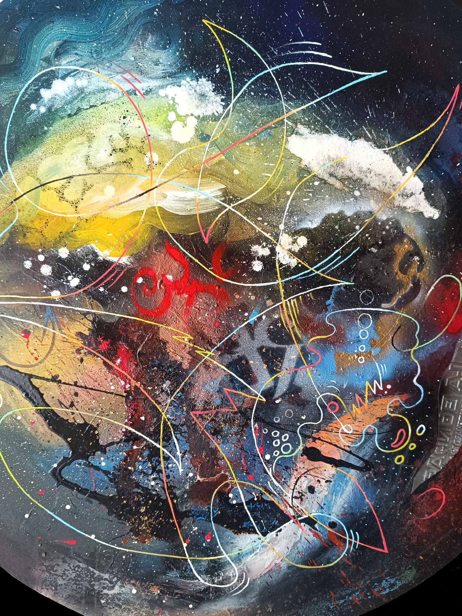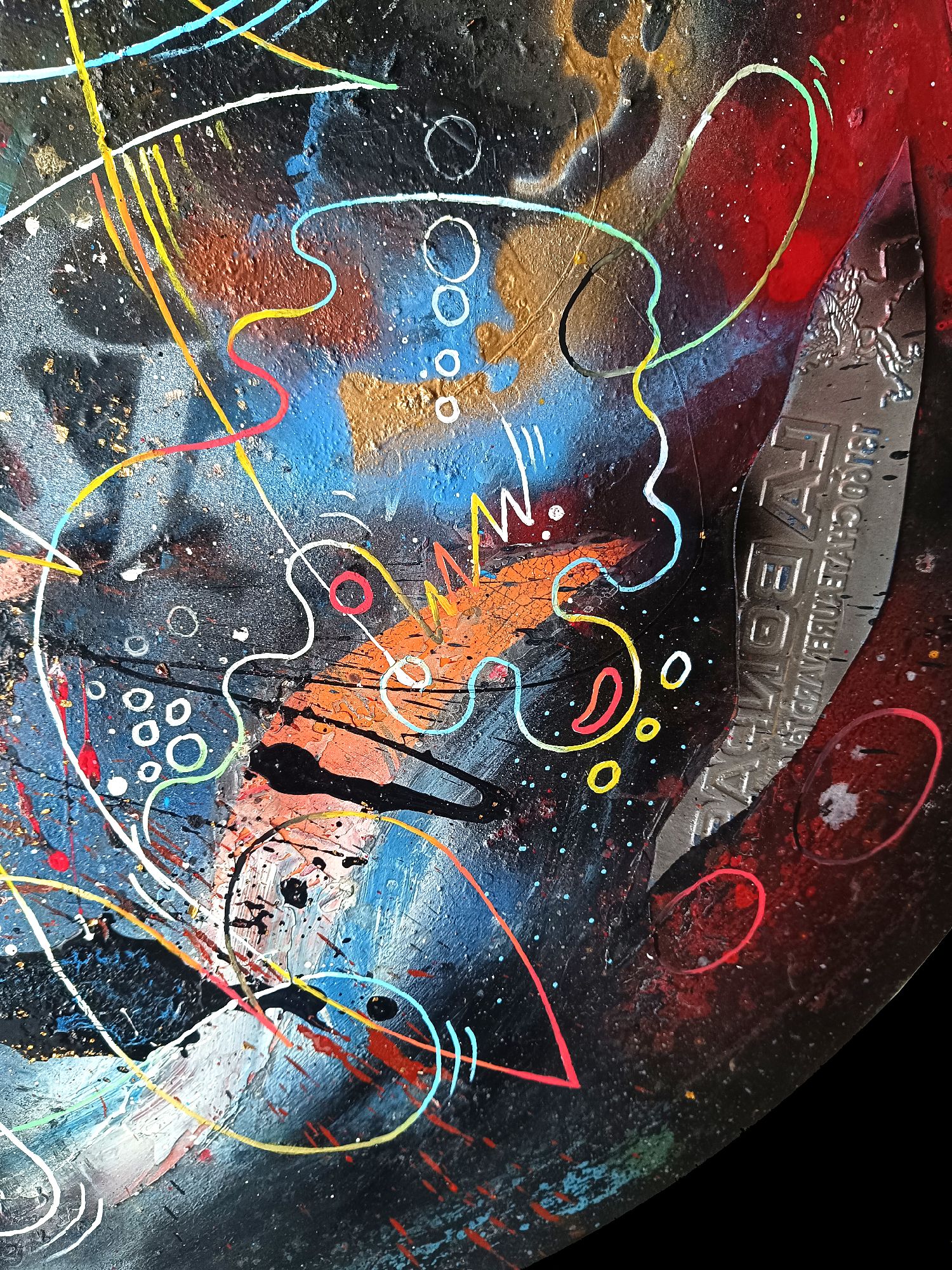 Un viaggio nel cuore del cosmo, dove materia e energia si fondono in un equilibrio dinamico. Le traiettorie luminose attraversano la superficie come orbite segrete, intrecciandosi con campi di colore che vibrano di vita. L’opera è una visione planetaria, un universo pulsante in cui caos e armonia convivono, invitando lo spettatore a immergersi nella potenza creatrice dell’infinito.