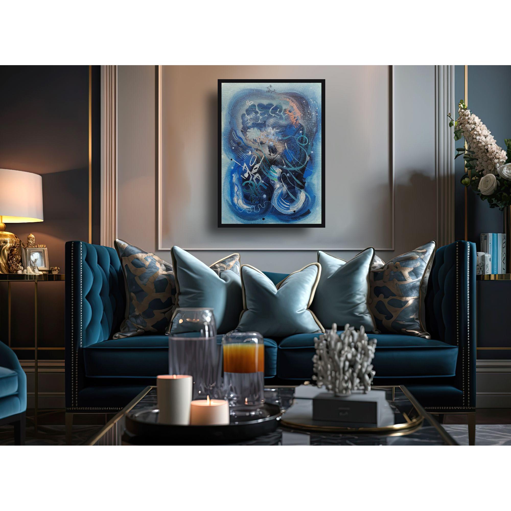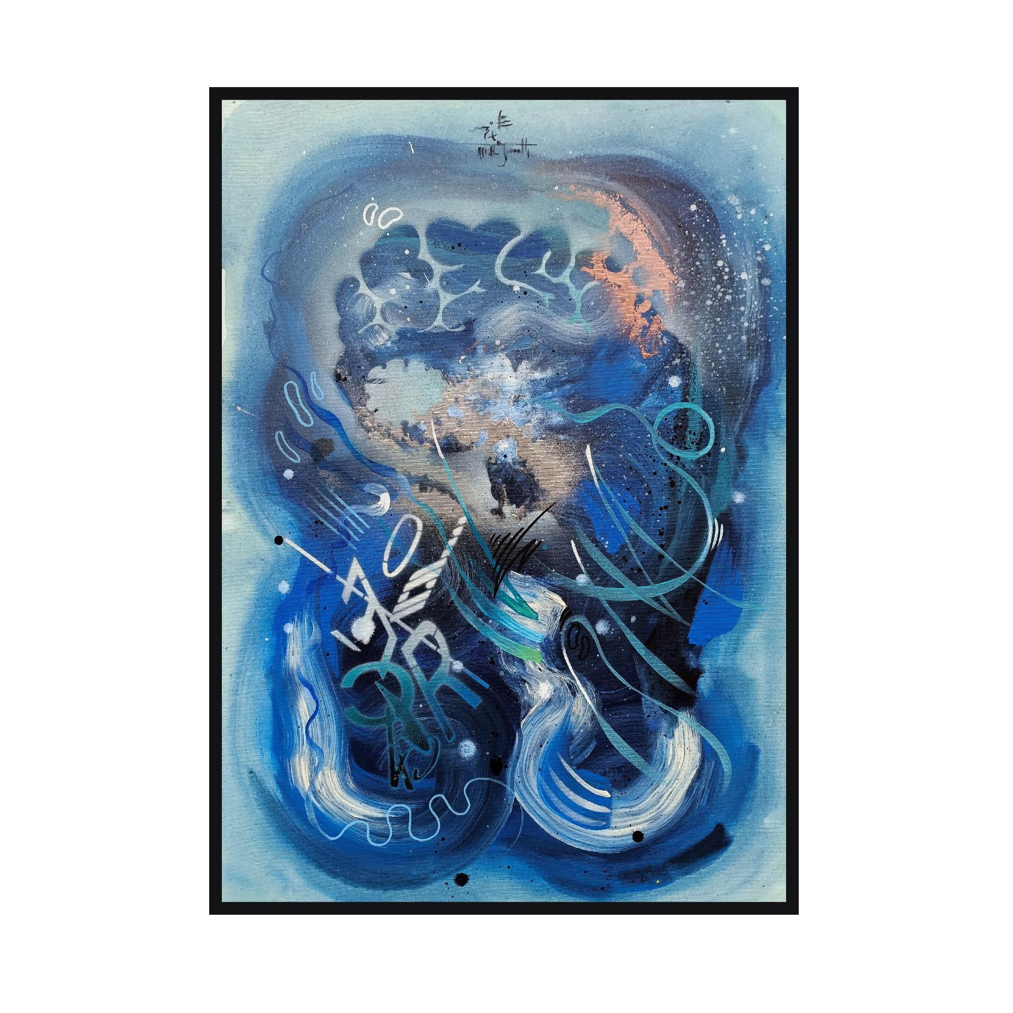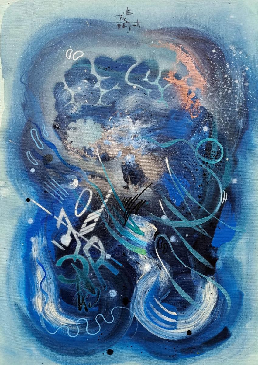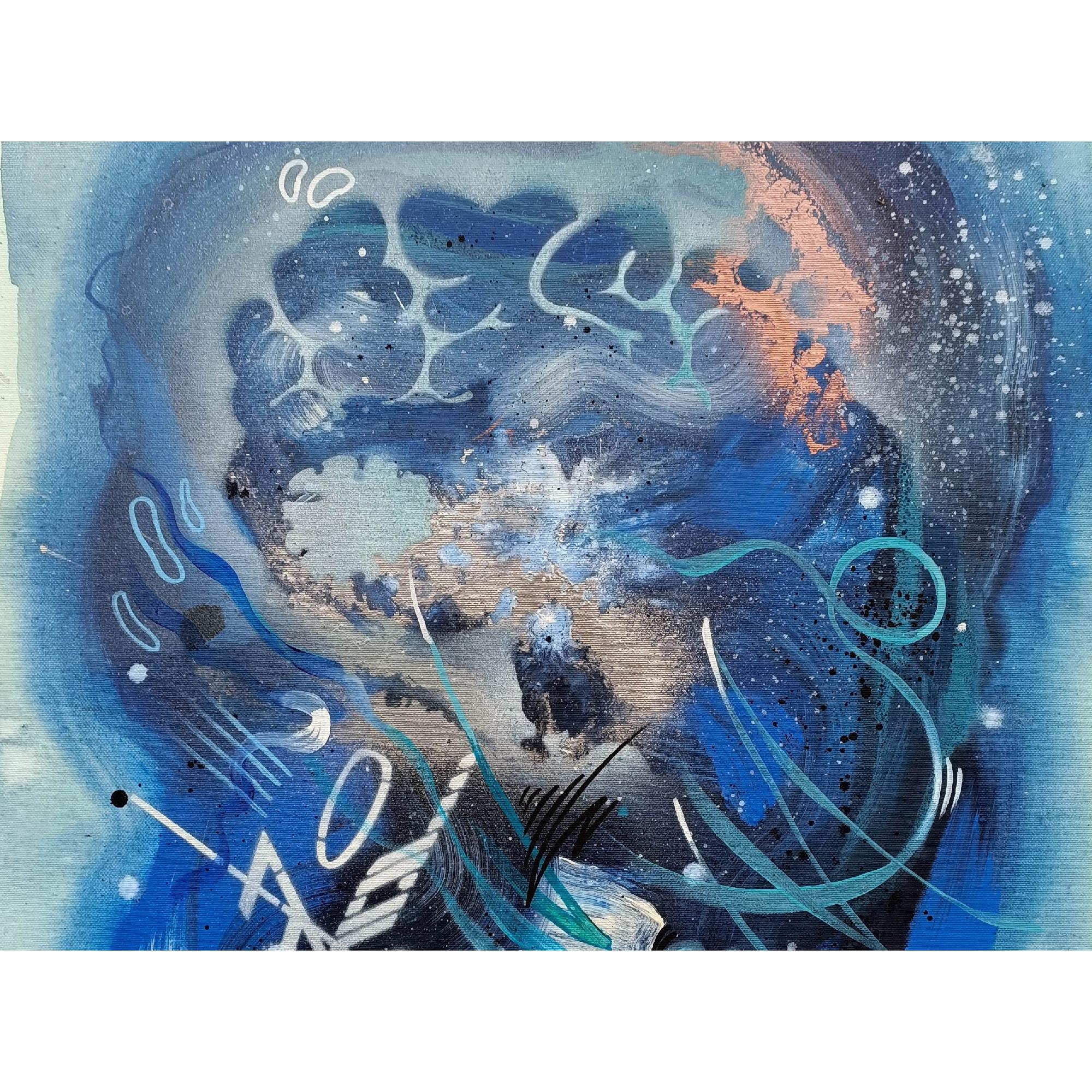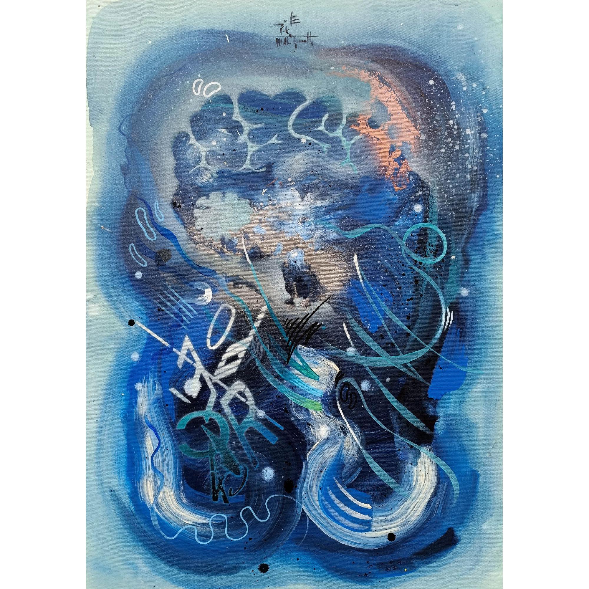 Il musicista di notte è un viaggio nelle vibrazioni del suono trasformato in colore. Le tonalità profonde del blu avvolgono la scena come un cielo notturno, mentre i segni fluidi e i ritmi grafici si muovono come note che scorrono libere nell’aria.