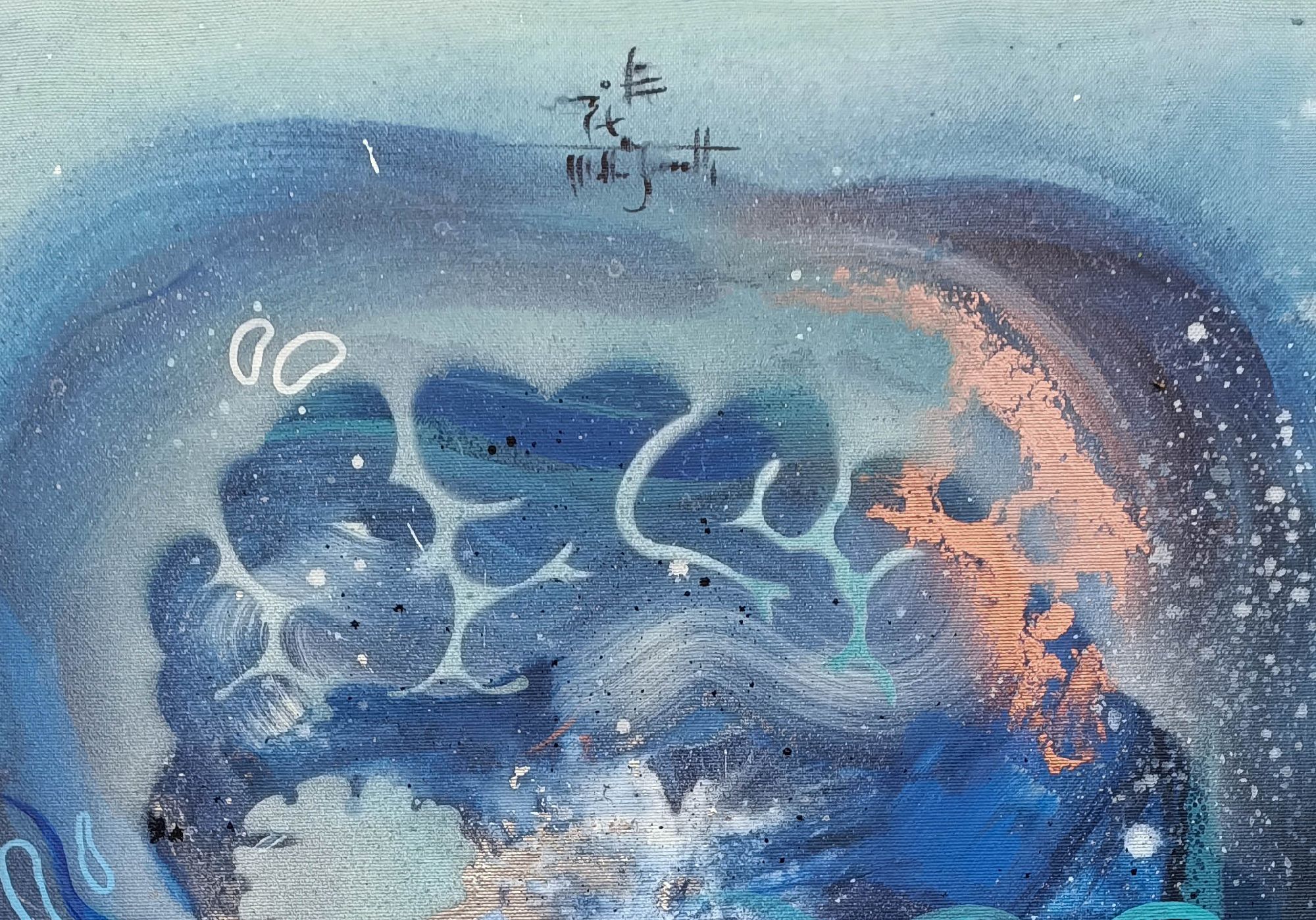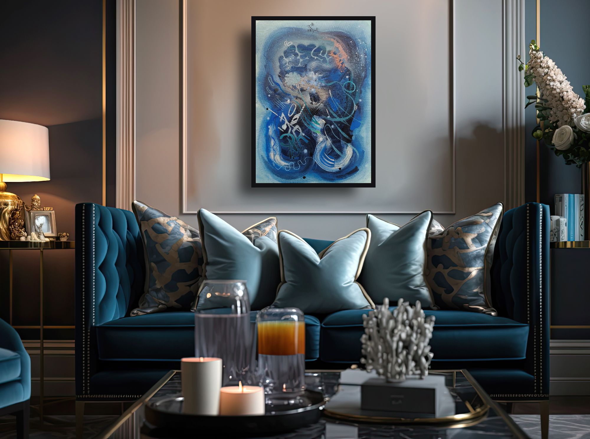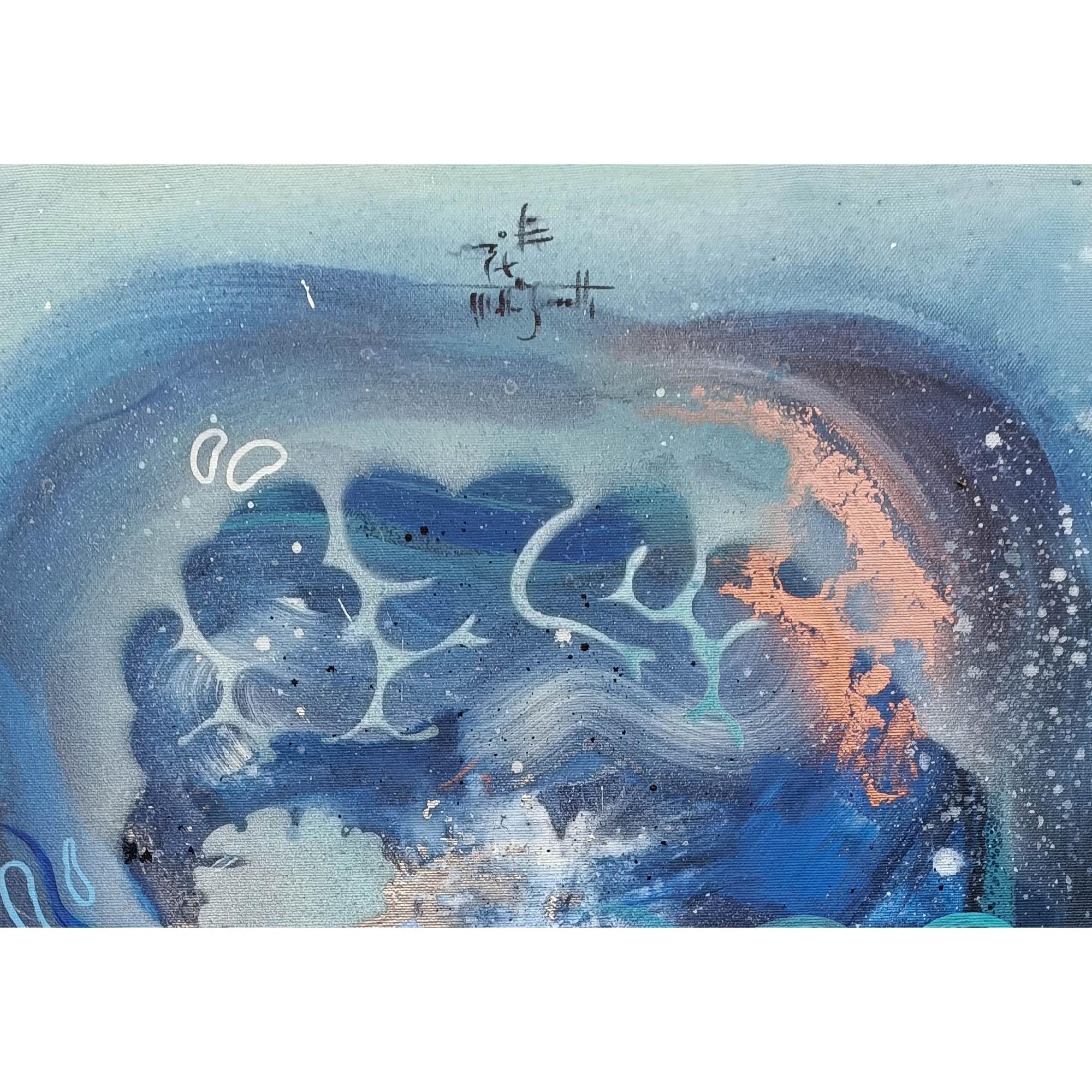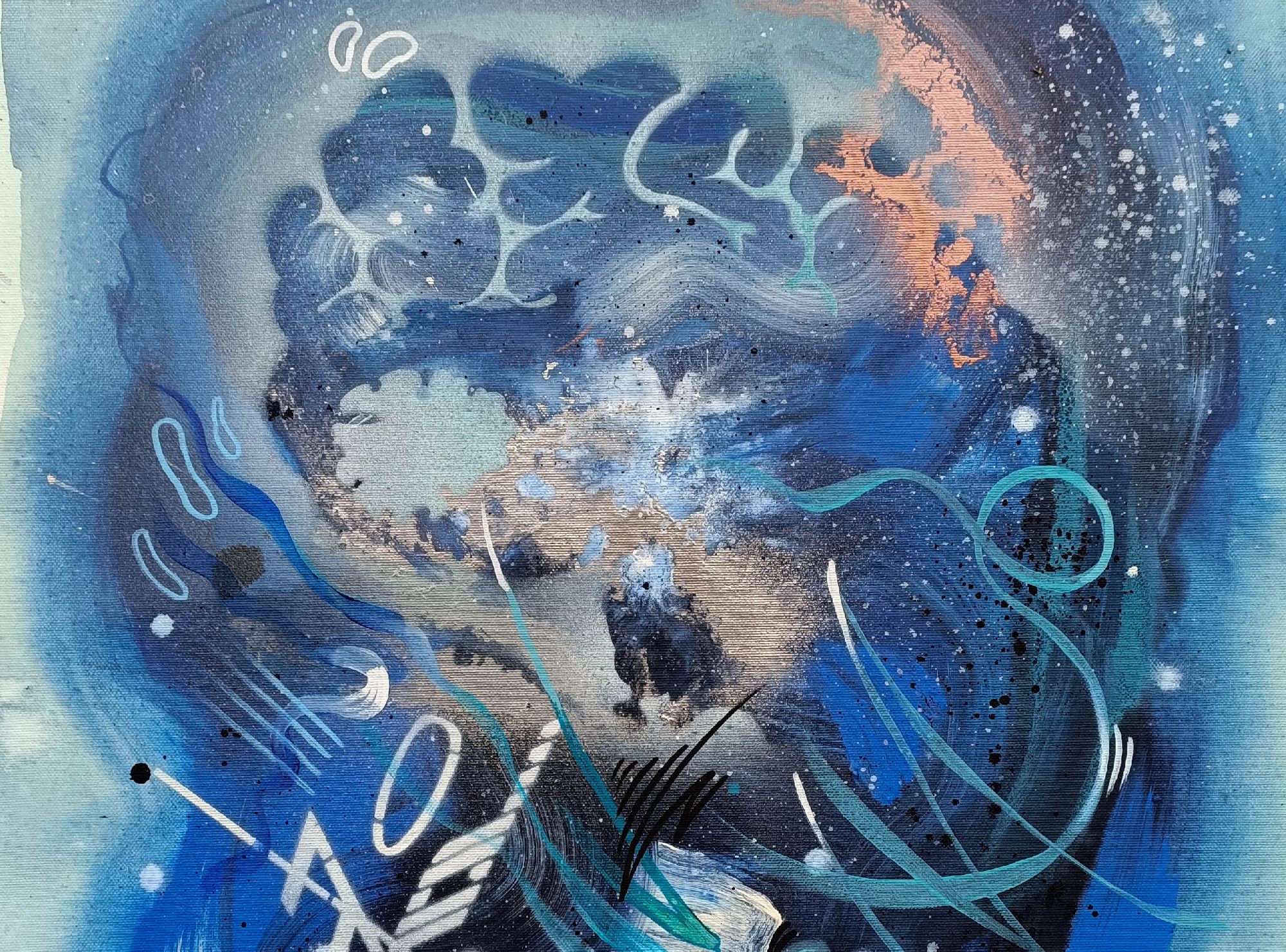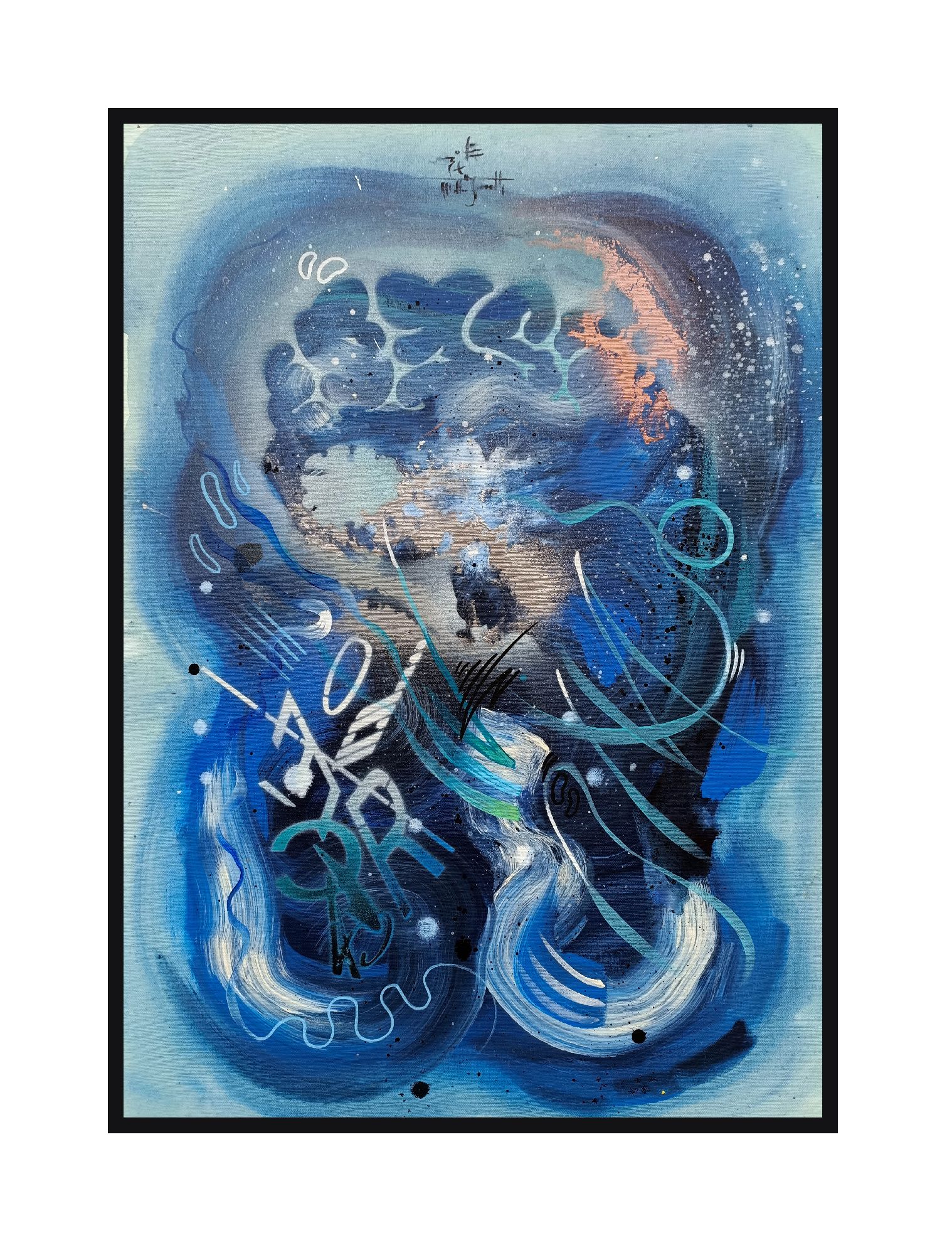 Il musicista di notte è un viaggio nelle vibrazioni del suono trasformato in colore. Le tonalità profonde del blu avvolgono la scena come un cielo notturno, mentre i segni fluidi e i ritmi grafici si muovono come note che scorrono libere nell’aria.
