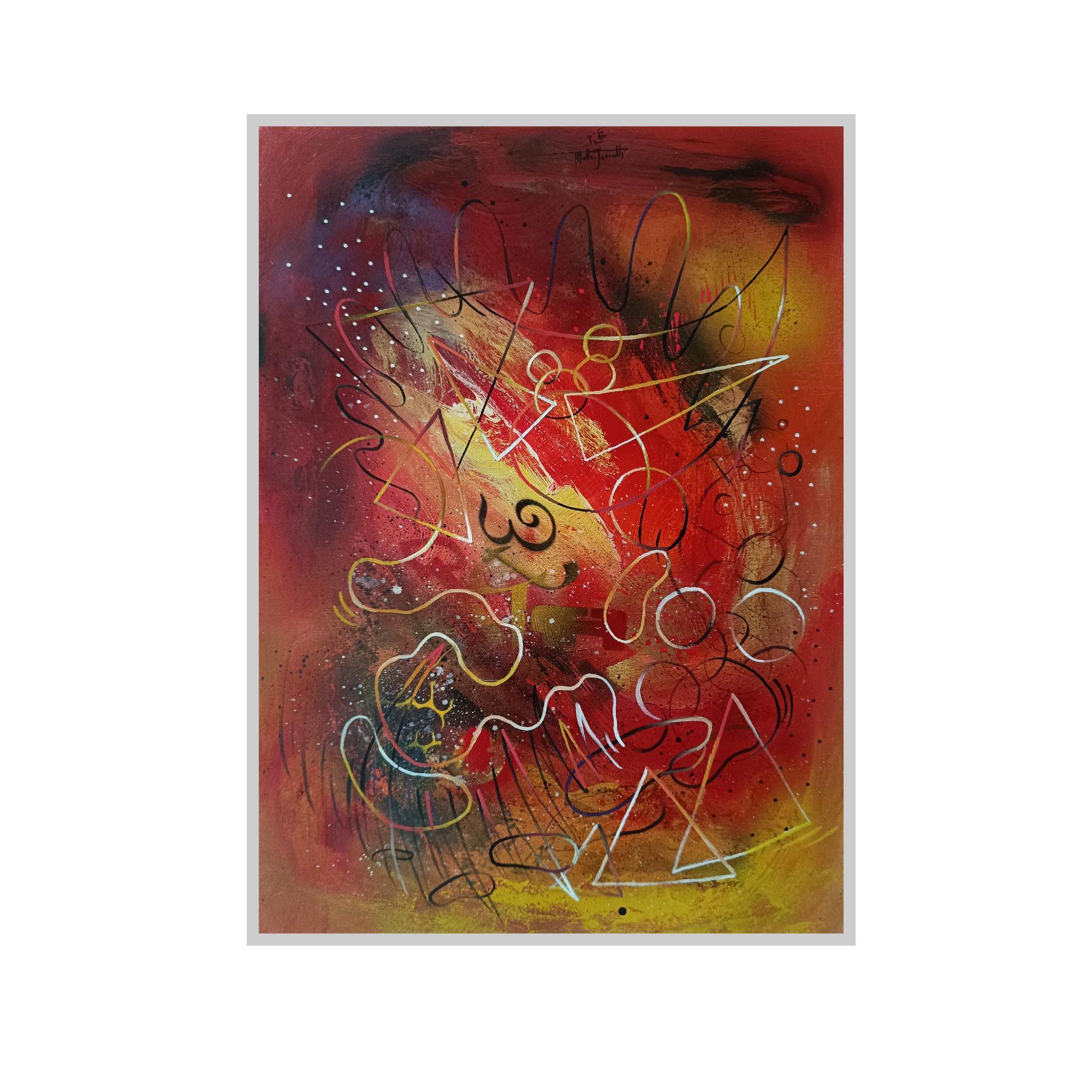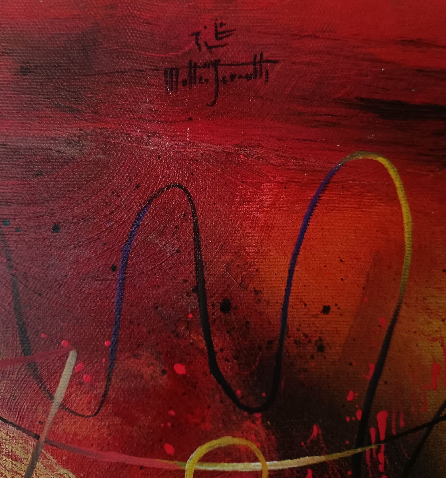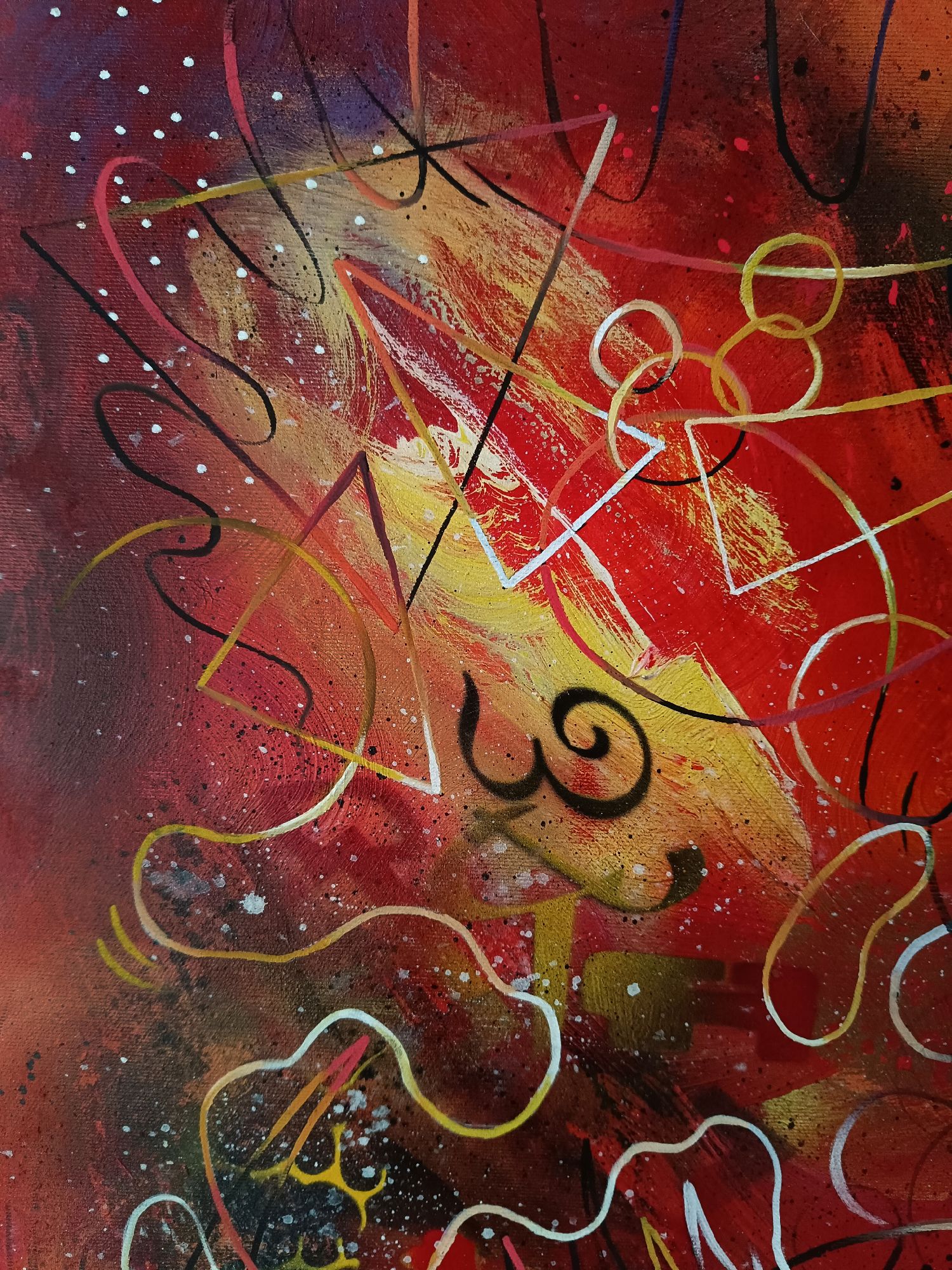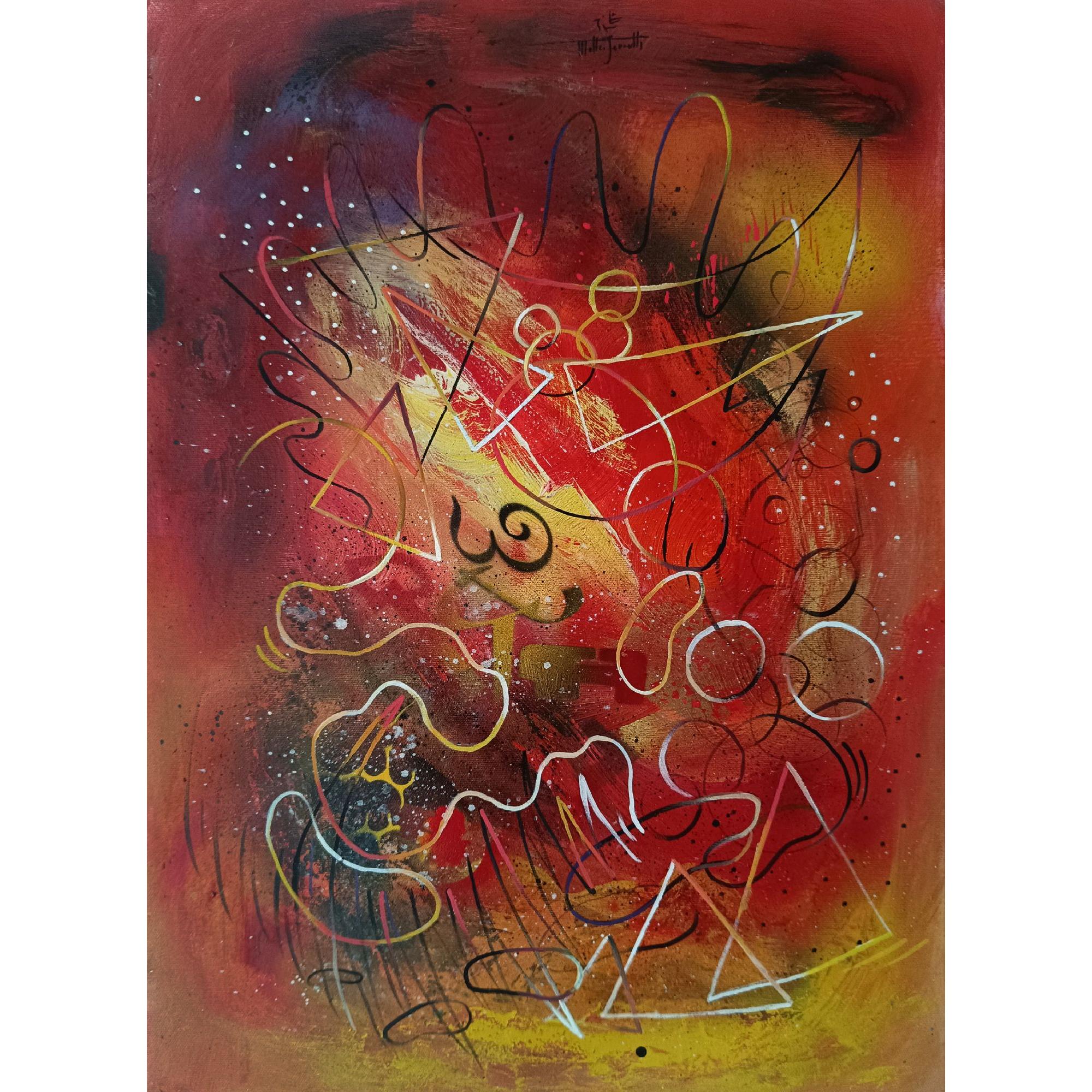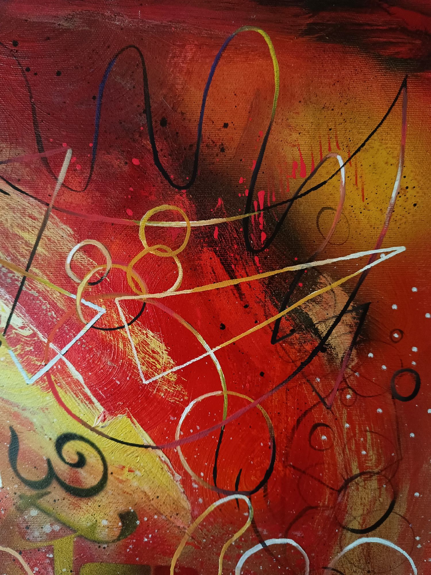 Un’opera che vibra di intensità e movimento, in cui il rosso e il giallo si fondono come fiamme in continua trasformazione. Le linee fluide e i segni geometrici evocano ritmo e vibrazione, come se la tela fosse attraversata da una musica visiva fatta di energia pura. Sinfonia di fuoco è un inno alla forza vitale e alla potenza creatrice del colore.