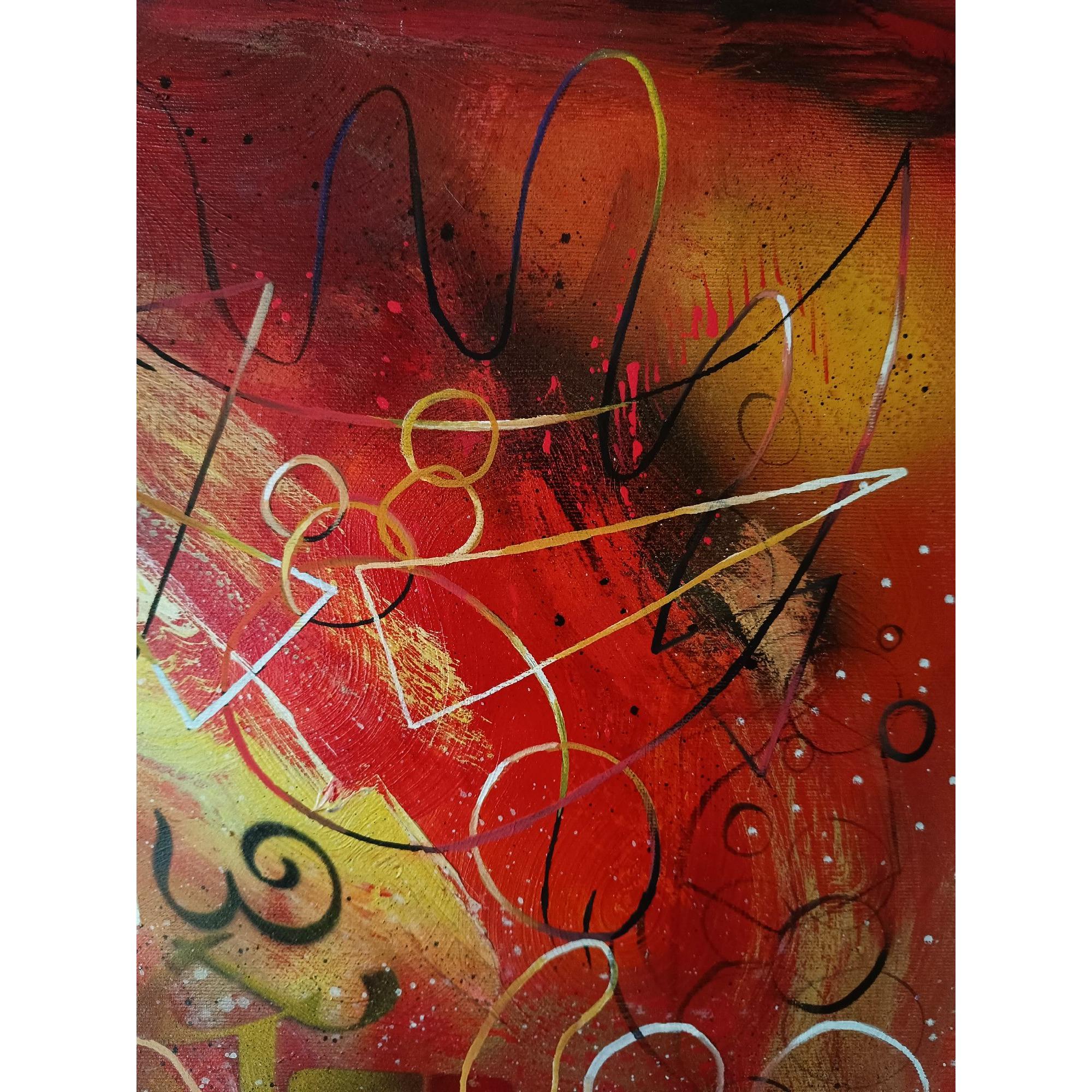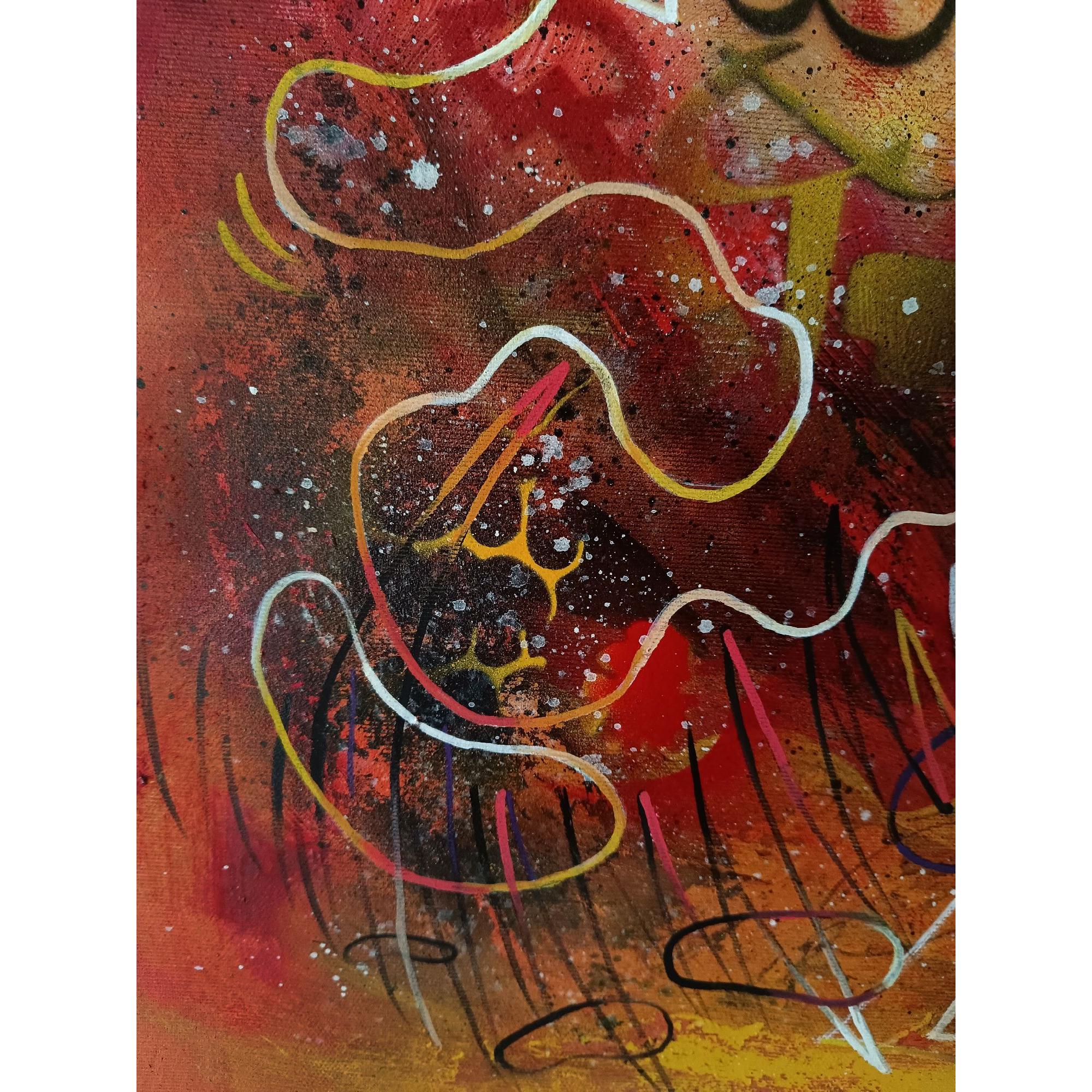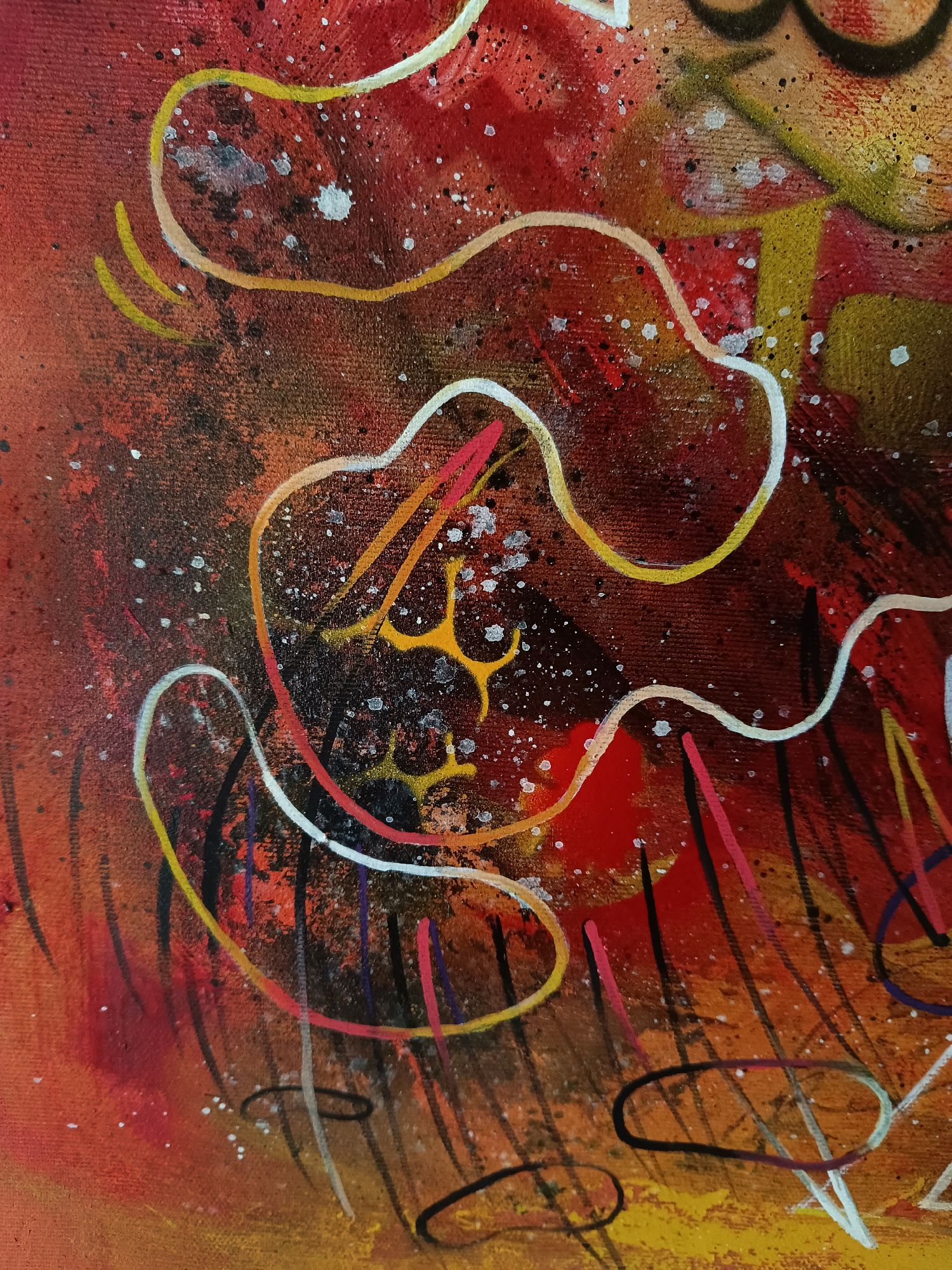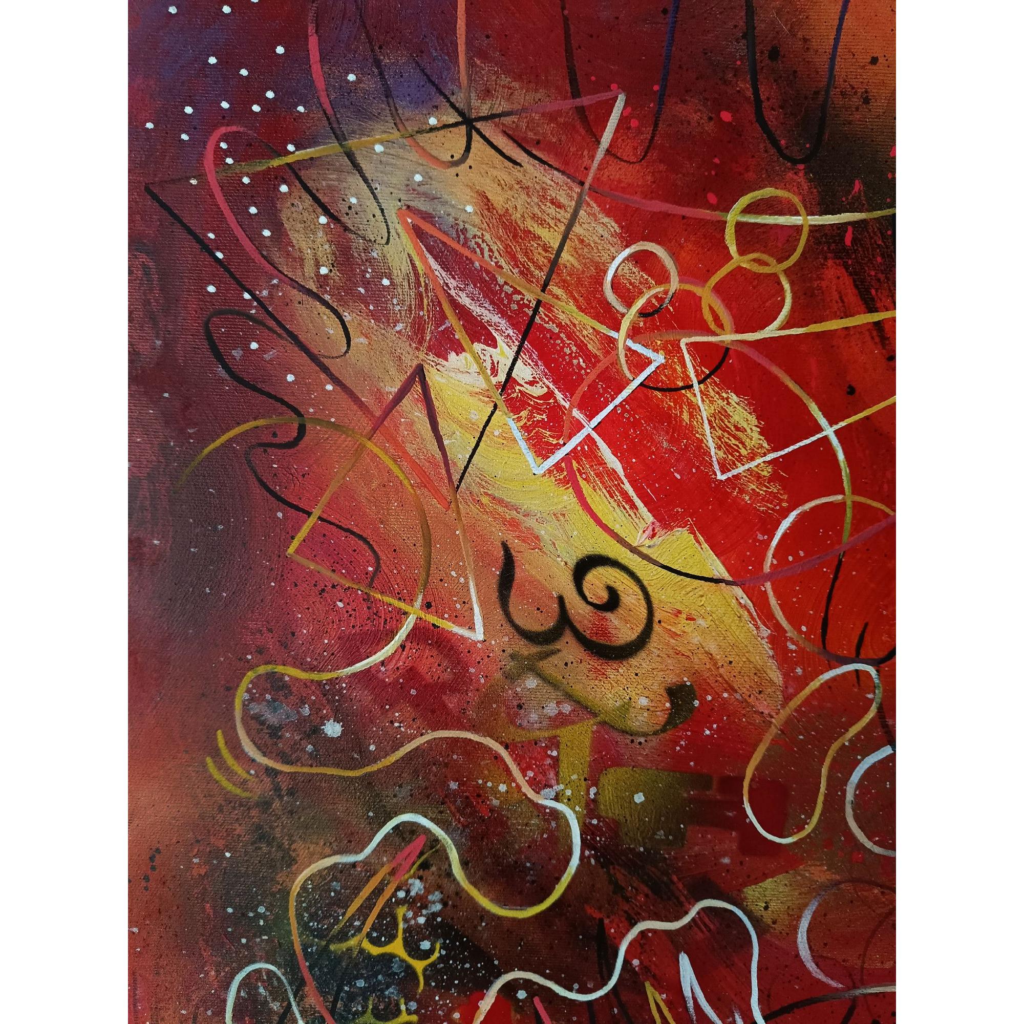 Un’opera che vibra di intensità e movimento, in cui il rosso e il giallo si fondono come fiamme in continua trasformazione. Le linee fluide e i segni geometrici evocano ritmo e vibrazione, come se la tela fosse attraversata da una musica visiva fatta di energia pura. Sinfonia di fuoco è un inno alla forza vitale e alla potenza creatrice del colore.
